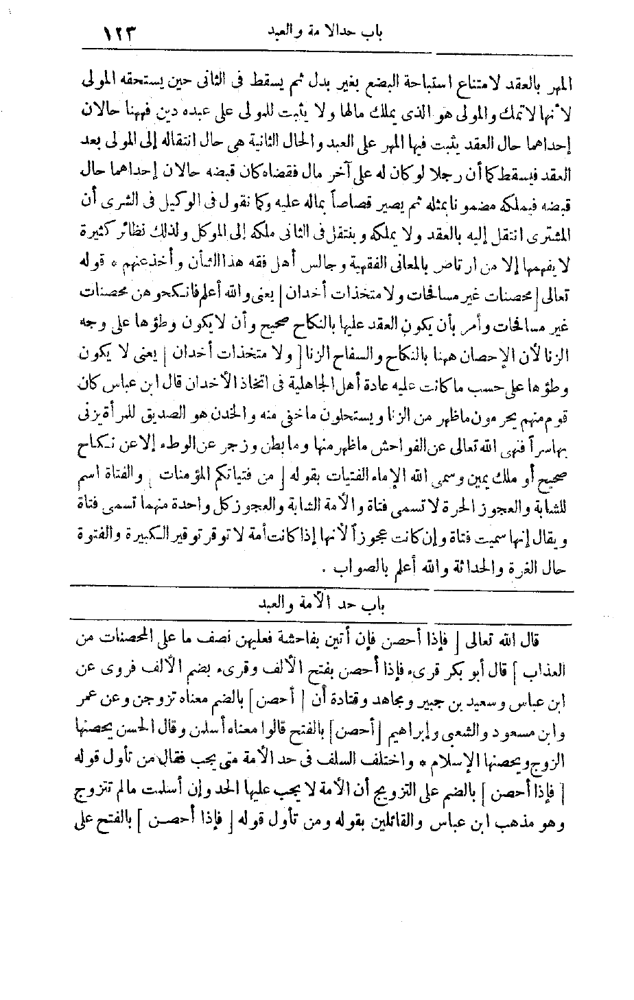 قَالَ اللَّهُ تَعَالَى فَإِذا أُحْصِنَّ فَإِنْ أَتَيْنَ بِفاحِشَةٍ فَعَلَيْهِنَّ نِصْفُ مَا عَلَى الْمُحْصَناتِ مِنَ الْعَذابِ قَالَ أَبُو بَكْرٍ قُرِئَ فَإِذَا أَحْصَنَّ بِفَتْحِ الْأَلِفِ وَقُرِئَ بِضَمِّ الْأَلِفِ فَرُوِيَ عَنْ ابْنِ عَبَّاسٍ وَسَعِيدِ بْنِ جُبَيْرٍ وَمُجَاهِدٍ وَقَتَادَةَ أَنَّ أُحْصِنَّ بِالضَّمِّ مَعْنَاهُ تَزَوَّجْنَ وَعَنْ عُمَرَ وَابْنِ مَسْعُودٍ وَالشَّعْبِيِّ وَإِبْرَاهِيمَ أُحْصِنَّ بِالْفَتْحِ قَالُوا مَعْنَاهُ أَسْلَمْنَ وَقَالَ الْحَسَنُ يُحْصِنُهَا الزَّوْجُ وَيُحْصِنُهَا الْإِسْلَامُ وَاخْتَلَفَ السَّلَفُ فِي حَدِّ الْأَمَةِ مَتَى يَجِبُ فَقَالَ من تأول قوله فَإِذا أُحْصِنَّ بِالضَّمِّ عَلَى التَّزْوِيجِ إنَّ الْأَمَةَ لَا يَجِبْ عَلَيْهَا الْحَدُّ وَإِنْ أَسْلَمَتْ مَا لَمْ تَتَزَوَّجْ وَهُوَ مَذْهَبُ ابْنِ عَبَّاسٍ وَالْقَائِلِينَ بِقَوْلِهِ وَمَنْ تَأَوَّلَ قَوْلَهُ فَإِذا أُحْصِنَّ بِالْفَتْحِ عَلَى