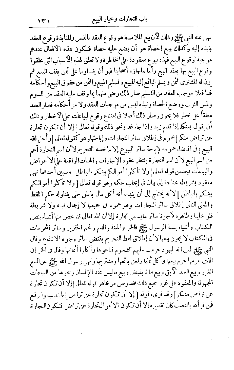 نَهَى عَنْهُ النَّبِيُّ صَلَّى اللَّهُ عَلَيْهِ وَسَلَّمَ وَذَلِكَ لِأَنَّ بَيْعَ الْمُلَامَسَةِ هُوَ وُقُوعُ الْعَقْدِ بِاللَّمْسِ وَالْمُنَابَذَةُ وُقُوعُ الْعَقْدِ بِنَبْذِهِ إلَيْهِ وَكَذَلِكَ بَيْعُ الْحَصَاةُ هُوَ أَنْ يَضَعَ عَلَيْهِ حَصَاةً فَتَكُونَ هَذِهِ الْأَفْعَالُ عِنْدَهُمْ مُوجِبَةً لِوُقُوعِ الْبَيْعِ فَهَذِهِ بُيُوعٌ مَعْقُودَةٌ عَلَى الْمُخَاطَرَةِ وَلَا تَعَلُّقَ لِهَذِهِ الْأَسْبَابِ الَّتِي عَلَّقُوا وُقُوعَ الْبَيْعِ بِهَا بعقد البيع وأما ما جازه أَصْحَابُنَا فَهُوَ أَنْ يَتَسَاوَمَا عَلَى ثَمَنٍ يَقِفُ البيع ثُمَّ يَزِنُ لَهُ الْمُشْتَرِي الثَّمَنَ وَيُسَلِّمُ الْبَائِعُ إلَيْهِ الْمَبِيعَ وَتَسْلِيمُ الْمَبِيعِ وَالثَّمَنِ مِنْ حُقُوقِ الْبَيْعِ وَأَحْكَامِهِ فَلَمَّا فَعَلَا مُوجِبَ الْعَقْدِ مِنْ التَّسْلِيمِ صَارَ ذَلِكَ رِضًى مِنْهُمَا بِمَا وَقَفَ عَلَيْهِ الْعَقْدُ مِنْ السَّوْمِ وَلَمْسِ الثَّوْبِ وَوَضْعِ الْحَصَاةِ وَنَبْذُهُ لَيْسَ مِنْ مُوجِبَاتِ الْعَقْدِ وَلَا مِنْ أَحْكَامِهِ فَصَارَ الْعَقْدُ مُعَلَّقًا عَلَى خَطَرٍ فَلَا يَجُوزُ وَصَارَ ذَلِكَ أَصْلًا فِي امْتِنَاعِ وُقُوعِ الْبِيَاعَاتِ عَلَى الْأَخْطَارِ وَذَلِكَ أَنْ يَقُولَ بِعْتُكَهُ إذَا قَدِمَ زَيْدٌ وَإِذَا جَاءَ غَدٌ وَنَحْوَ ذَلِكَ وقَوْله تَعَالَى إِلَّا أَنْ تَكُونَ تِجارَةً عَنْ تَراضٍ مِنْكُمْ عُمُومٌ فِي إطْلَاقِ سَائِرِ التِّجَارَاتِ وَإِبَاحَتِهَا وَهُوَ كقوله تعالى وَأَحَلَّ اللَّهُ الْبَيْعَ فِي اقْتِضَاءِ عُمُومِهِ لِإِبَاحَةِ سَائِرِ الْبُيُوعِ إلَّا مَا خَصَّهُ التَّحْرِيمُ لِأَنَّ اسْمَ التِّجَارَةِ أَعَمُّ مِنْ اسْمِ الْبَيْعِ لِأَنَّ اسْمَ التِّجَارَةِ يَنْتَظِمُ عُقُودَ الْإِجَارَاتِ وَالْهِبَاتِ الْوَاقِعَةِ عَلَى الْأَعْوَاضِ وَالْبِيَاعَاتِ فَيُضَمَّنُ قَوْله تَعَالَى وَلا تَأْكُلُوا أَمْوالَكُمْ بَيْنَكُمْ بِالْباطِلِ مَعْنَيَيْنِ أَحَدُهُمَا نَهْيٌ مَعْقُودٌ بِشَرِيطَةٍ مُحْتَاجَةٍ إلَى بَيَانٍ فِي إيجَابِ حُكْمِهِ وَهُوَ قَوْله تَعَالَى وَلا تَأْكُلُوا أَمْوالَكُمْ بَيْنَكُمْ بِالْباطِلِ لِأَنَّهُ يَحْتَاجُ إلَى أَنْ يَثْبُتَ أَنَّهُ أَكْلُ مَالٍ بَاطِلٍ حَتَّى يَتَنَاوَلَهُ حُكْمُ اللَّفْظِ وَالْمَعْنَى الثَّانِي إطْلَاقُ سَائِرِ التِّجَارَاتِ وَهُوَ عُمُومٌ فِي جَمِيعِهَا لَا إجْمَالَ فِيهِ وَلَا شَرِيطَةَ فَلَوْ خُلِّينَا وَظَاهِرُهُ لَأَجَزْنَا سَائِرَ مَا يُسَمَّى تِجَارَةً إلَّا أَنَّ اللَّهَ تَعَالَى قَدْ خَصَّ مِنْهَا أشياء بنص الكتاب وأشياء بسنة الرسول صَلَّى اللَّهُ عَلَيْهِ وَسَلَّمَ فَالْخَمْرُ وَالْمَيْتَةُ وَالدَّمُ وَلَحْمُ الْخِنْزِيرِ وَسَائِرُ الْمُحَرَّمَاتِ فِي الْكِتَابِ لَا يَجُوزُ بَيْعُهَا لِأَنَّ إطْلَاقَ لَفْظِ التَّحْرِيمِ يَقْتَضِي سَائِرَ وُجُوهِ الِانْتِفَاعِ