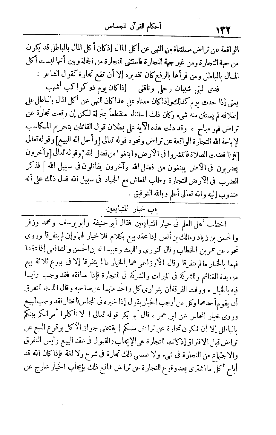 اخْتَلَفَ أَهْلُ الْعِلْمِ فِي خِيَارِ الْمُتَبَايِعَيْنِ فَقَالَ أَبُو حَنِيفَةَ وَأَبُو يُوسُفَ وَمُحَمَّدٌ وَزُفَرُ وَالْحَسَنُ بْنُ زِيَادٍ وَمَالِكُ بْنُ أَنَسٍ إذَا عُقِدَ بَيْعٌ بِكَلَامٍ فَلَا خِيَارَ لَهُمَا وَإِنْ لَمْ يَتَفَرَّقَا وَرُوِيَ نَحْوُهُ عَنْ عُمَرَ بْنِ الْخَطَّاب وَقَالَ الثَّوْرِيُّ وَاللَّيْثُ وَعُبَيْدُ اللَّهِ بْنُ الْحَسَنِ وَالشَّافِعِيُّ إذَا عَقَدَا فَهُمَا بِالْخِيَارِ مَا لَمْ يَتَفَرَّقَا وَقَالَ الْأَوْزَاعِيُّ هُمَا بِالْخِيَارِ مَا لَمْ يَتَفَرَّقَا إلَّا فِي بُيُوعٍ ثَلَاثَةٍ بَيْعُ مُزَايَدَةِ الْغَنَائِمِ وَالشَّرِكَةُ فِي الْمِيرَاثِ وَالشَّرِكَةُ فِي التِّجَارَةِ فَإِذَا صَافَقَهُ فَقَدْ وَجَبَ وَلَيْسَا فِيهِ بِالْخِيَارِ وَوَقْتُ الْفُرْقَةِ أَنْ يَتَوَارَى كُلُّ وَاحِدٍ مِنْهُمَا عَنْ صَاحِبِهِ وَقَالَ اللَّيْثُ التَّفَرُّقُ أَنْ يَقُومَ أَحَدُهُمَا وَكُلُّ مَنْ أَوْجَبَ الْخِيَارَ يَقُولُ إذَا خَيَّرَهُ فِي الْمَجْلِسِ فَاخْتَارَ فَقَدْ وَجَبَ الْبَيْعُ وَرُوِيَ خِيَارُ الْمَجْلِسِ عَنْ ابْنِ عُمَرَ قَالَ أَبُو بَكْرٍ قَوْله تَعَالَى لا تَأْكُلُوا أَمْوالَكُمْ بَيْنَكُمْ بِالْباطِلِ إِلَّا أَنْ تَكُونَ تِجارَةً عَنْ تَراضٍ مِنْكُمْ يَقْتَضِي جَوَازَ الْأَكْلِ بِوُقُوعِ الْبَيْعِ عَنْ تَرَاضٍ قبل الافتراق إذ كانت التجارة هِيَ الْإِيجَابُ وَالْقَبُولُ فِي عَقْدِ الْبَيْعِ وَلَيْسَ التَّفَرُّقُ وَالِاجْتِمَاعُ مِنْ التِّجَارَةِ فِي شَيْءٍ وَلَا يُسَمَّى ذَلِكَ تِجَارَةً فِي شَرْعٍ وَلَا لُغَةٍ فَإِذَا كَانَ اللَّهُ قَدْ أَبَاحَ أَكْلَ مَا اشْتَرَى بَعْدَ وُقُوعِ التِّجَارَةِ عَنْ تَرَاضٍ فَمَانِعُ ذَلِكَ بِإِيجَابِ الْخِيَارِ خَارِجٌ عَنْ