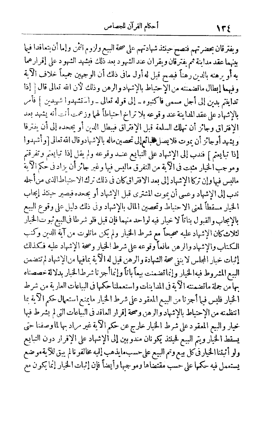 أَنْ يَمُوتَ فَلَا يَصِلُ الْبَائِعُ إلَى تَحْصِينِ مَالِهِ بِالْإِشْهَادِ وَقَالَ اللَّهُ تَعَالَى وَأَشْهِدُوا إِذا تَبايَعْتُمْ فَنَدَبَ إلَى الْإِشْهَادِ عَلَى التَّبَايُعِ عِنْدَ وُقُوعِهِ وَلَمْ يَقُلْ إذَا تَبَايَعْتُمْ وَتَفَرَّقْتُمْ وَمُوجِبُ الْخِيَارِ مُثْبَتٌ فِي الْآيَةِ مِنْ التَّفَرُّقِ مَا لَيْسَ فِيهَا وَغَيْرُ جَائِزٍ أَنْ يُزَادَ فِي حُكْمِ الْآيَةِ مَا لَيْسَ فِيهَا وَإِنْ تَرَكَا الْإِشْهَادَ إلَى بَعْدِ الِافْتِرَاقِ كَانَ فِي ذَلِكَ تَرْكُ الِاحْتِيَاطِ الَّذِي مِنْ أَجْلِهِ نَدَبَ إلَى الْإِشْهَادِ وَعَسَى أَنْ يَمُوتَ الْمُشْتَرِي قَبْلَ الْإِشْهَادِ أَوْ يَجْحَدُهُ فَيَصِيرُ حِينَئِذٍ إيجَابُ الْخِيَارِ مَسْقَطًا لِمَعْنَى الِاحْتِيَاطِ وَتَحْصِينِ الْمَالِ بِالْإِشْهَادِ وَفِي ذَلِكَ دَلِيلٌ عَلَى وُقُوعِ الْبَيْعِ بِالْإِيجَابِ وَالْقَبُولِ بَتَاتًا لَا خِيَارَ فِيهِ لِوَاحِدٍ مِنْهُمَا فَإِنْ قِيلَ فَلَوْ شَرَطَا فِي الْبَيْعِ ثُبُوتَ الْخِيَارِ لِثَلَاثٍ كَانَ الْإِشْهَادُ عَلَيْهِ صَحِيحًا مَعَ شَرْطِ الْخِيَارِ وَلَمْ يَكُنْ مَا تَلَوْت مِنْ آيَةِ الدَّيْنِ وَكَتْبُ الْكِتَابِ وَالْإِشْهَادُ وَالرَّهْنُ مَانِعًا وُقُوعِهِ عَلَى شَرْطِ الْخِيَارِ وَصِحَّةِ الْإِشْهَادِ عَلَيْهِ فَكَذَلِكَ إثْبَاتُ خِيَارِ الْمَجْلِسِ لَا يَنْفِي صِحَّةَ الشَّهَادَةِ وَالرَّهْنِ قِيلَ لَهُ الْآيَةُ بِمَا فِيهَا مِنْ الْإِشْهَادِ لَمْ تَتَضَمَّنْ الْبَيْعَ الْمَشْرُوطِ فِيهِ الْخِيَارُ وَإِنَّمَا تَضَمَّنَتْ بَيْعًا بَاتًّا وَإِنَّمَا أَجَزْنَا شَرْطَ الْخِيَارِ بِدَلَالَةٍ خَصَصْنَاهُ بِهَا مِنْ جُمْلَةِ مَا تَضَمَّنَتْهُ الْآيَةُ فِي الْمُدَايَنَاتِ وَاسْتَعْمَلْنَا حُكْمَهَا فِي الْبِيَاعَاتِ الْعَارِيَّةِ مِنْ شَرْطِ الْخِيَارِ فَلَيْسَ فِيمَا أَجَزْنَا مِنْ الْبَيْعِ الْمَعْقُودِ عَلَى شَرْطِ الْخِيَارِ مَا يَمْنَعُ اسْتِعْمَالَ حُكْمِ الْآيَةِ بِمَا انْتَظَمْته مِنْ الِاحْتِيَاطِ بِالْإِشْهَادِ وَالرَّهْنِ وَصِحَّةِ إقْرَارِ الْعَاقِدِ فِي الْبِيَاعَاتِ الَّتِي لَمْ يُشْرَطْ فِيهَا خِيَارٌ وَالْبَيْعُ الْمَعْقُودُ عَلَى شَرْطِ الْخِيَارِ خَارِجٌ عَنْ حُكْمِ الْآيَةِ غَيْرُ مُرَادٍ بِهَا لِمَا وَصَفْنَا حَتَّى يَسْقُطَ الْخِيَارُ وَيَتِمَّ الْبَيْعُ فَحِينَئِذٍ يَكُونَانِ مَنْدُوبَيْنِ إلَى الْإِشْهَادِ عَلَى الْإِقْرَارِ دُونَ التَّبَايُعِ وَلَوْ أَثْبَتْنَا الْخِيَارَ فِي كُلِّ بَيْعٍ وَتَمَّ الْبَيْعُ عَلَى حَسَبِ مَا يَذْهَبُ إلَيْهِ مُخَالِفُونَا لَمْ يَبْقَ لِلْآيَةِ مَوْضِعٌ يُسْتَعْمَلُ فِيهِ حُكْمُهَا عَلَى حَسَبِ مُقْتَضَاهَا وَمُوجِبِهَا وَأَيْضًا فَإِنَّ إثْبَاتَ الْخِيَارِ إنَّمَا يكون مع