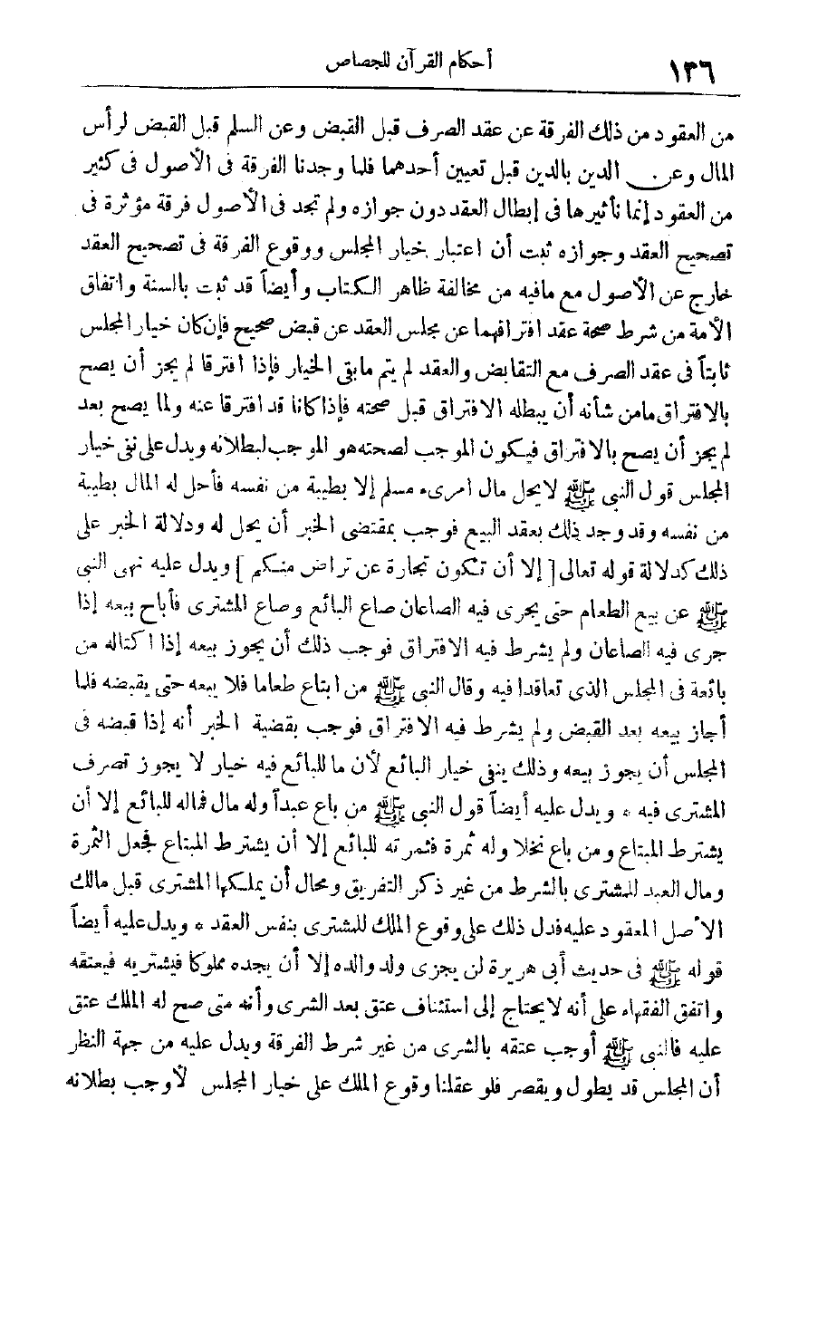 مِنْ الْعُقُودِ مِنْ ذَلِكَ الْفُرْقَةِ عَنْ عَقْدِ الصَّرْفِ قَبْلَ الْقَبْضِ وَعَنْ السَّلْمِ قَبْلَ الْقَبْضِ لرأس المال وعن الدين بالدين قَبْلَ تَعْيِينِ أَحَدِهِمَا فَلَمَّا وَجَدْنَا الْفُرْقَةَ فِي الْأُصُولِ فِي كَثِيرٍ مِنْ الْعُقُودِ إنَّمَا تَأْثِيرُهَا في إبطال العقد دون جوازه ولم تجد فِي الْأُصُولِ فُرْقَةً مُؤَثِّرَةً فِي تَصْحِيحِ الْعَقْدِ وَجَوَازِهِ ثَبَتَ أَنَّ اعْتِبَارَ خِيَارِ الْمَجْلِسِ وَوُقُوعَ الْفُرْقَةِ فِي تَصْحِيحِ الْعَقْدِ خَارِجٌ عَنْ الْأُصُولِ مَعَ مَا فِيهِ مِنْ مُخَالَفَةِ ظَاهِرِ الْكِتَابِ وأيضا قد ثبت بالسنة واتفاق الأمة من شرط صحة عقد افْتِرَاقُهُمَا عَنْ مَجْلِسِ الْعَقْدِ عَنْ قَبْضٍ صَحِيحٍ فَإِنْ كَانَ خِيَارُ الْمَجْلِسِ ثَابِتًا فِي عَقْدِ الصَّرْفِ مَعَ التَّقَابُضِ وَالْعَقْدُ لَمْ يَتِمَّ مَا بَقِيَ الْخِيَارُ فَإِذَا افْتَرَقَا لَمْ يَجُزْ أَنْ يَصِحَّ بِالِافْتِرَاقِ مَا مِنْ شَأْنِهِ أَنْ يُبْطِلَهُ الِافْتِرَاقُ قَبْلَ صِحَّتِهِ فَإِذَا كَانَا قَدْ افْتَرَقَا عَنْهُ وَلَمَّا يَصِحَّ بَعْدُ لَمْ يَجُزْ أَنْ يَصِحَّ بِالِافْتِرَاقِ فَيَكُونُ الْمُوجِبُ لِصِحَّتِهِ هُوَ الْمُوجِبُ لِبُطْلَانِهِ وَيَدُلُّ عَلَى نَفْيِ خِيَارِ الْمَجْلِسِ