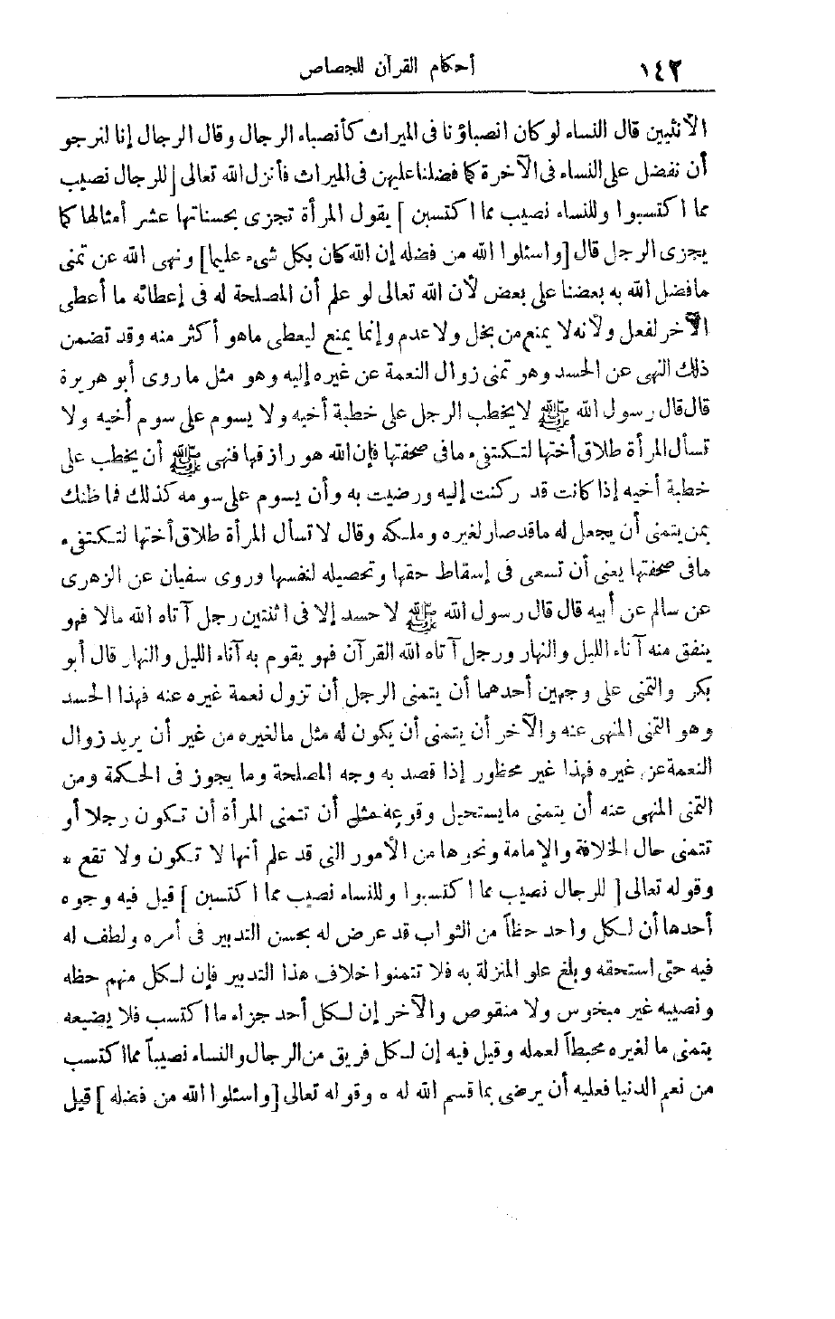 قَالَ أَبُو بَكْرٍ وَالتَّمَنِّي عَلَى وَجْهَيْنِ أَحَدُهُمَا أَنْ يَتَمَنَّى الرَّجُلُ أَنْ تَزُولَ نِعْمَةُ غَيْرِهِ عَنْهُ فَهَذَا الْحَسَدُ وَهُوَ التَّمَنِّي الْمَنْهِيُّ عَنْهُ وَالْآخَرُ أَنْ يَتَمَنَّى أَنْ يَكُونَ لَهُ مِثْلُ مَا لِغَيْرِهِ مِنْ غَيْرِ أَنْ يُرِيدَ زَوَالَ النِّعْمَةِ عَنْ غَيْرِهِ فَهَذَا غَيْرُ مَحْظُورٍ إذَا قُصِدَ بِهِ وَجْهُ الْمَصْلَحَةِ وَمَا يَجُوزُ فِي الْحِكْمَةِ وَمِنْ التَّمَنِّي الْمَنْهِيِّ عَنْهُ أَنْ يَتَمَنَّى مَا يَسْتَحِيلُ وُقُوعُهُ مِثْلُ أَنْ تَتَمَنَّى الْمَرْأَةُ أَنْ تَكُونَ رَجُلًا أَوْ تَتَمَنَّى حَالَ الْخِلَافَةِ وَالْإِمَامَةِ وَنَحْوِهَا مِنْ الْأُمُورِ الَّتِي قَدْ عُلِمَ أَنَّهَا لَا تَكُونُ وَلَا تَقَعُ وقَوْله تَعَالَى لِلرِّجالِ نَصِيبٌ مِمَّا اكْتَسَبُوا وَلِلنِّساءِ نَصِيبٌ مِمَّا اكْتَسَبْنَ قِيلَ فِيهِ وُجُوهٌ أَحَدُهَا أَنَّ لِكُلِّ وَاحِدٍ حَظًّا مِنْ الثَّوَابِ قَدْ عَرَضَ لَهُ بِحُسْنِ التَّدْبِيرِ فِي أَمْرِهِ وَلُطِفَ لَهُ فِيهِ حَتَّى اسْتَحَقَّهُ وَبَلَغَ عُلُوَّ الْمَنْزِلَةِ بِهِ فَلَا تَتَمَنَّوْا خِلَافَ هَذَا التَّدْبِيرِ فَإِنَّ لِكُلٍّ مِنْهُمْ حَظَّهُ وَنَصِيبَهُ غَيْرُ مَبْخُوسٍ وَلَا مَنْقُوصٍ وَالْآخَرُ أَنَّ لِكُلِّ أَحَدٍ جَزَاءُ مَا اكْتَسَبَ فَلَا يُضَيِّعُهُ بِتَمَنِّي مَا لِغَيْرِهِ مُحْبِطًا لِعَمَلِهِ وَقِيلَ فِيهِ إنَّ لِكُلِّ فَرِيقٍ مِنْ الرِّجَالِ وَالنِّسَاءِ نَصِيبًا مِمَّا اكْتَسَبَ مِنْ نِعَمِ الدُّنْيَا فَعَلَيْهِ أَنْ يَرْضَى بِمَا قَسَمَ اللَّهُ لَهُ وقَوْله تَعَالَى وَسْئَلُوا اللَّهَ مِنْ فَضْلِهِ قيل