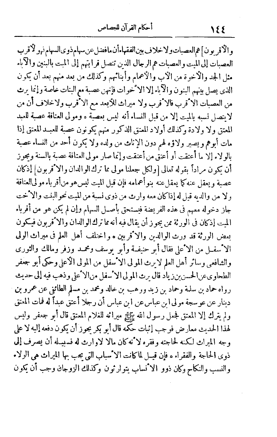 هُمْ الْعَصَبَاتُ وَلَا خِلَافَ بَيْنَ الْفُقَهَاءِ أَنَّ مَا فَضَلَ عَنْ سِهَامِ ذَوِي السِّهَامِ فَهُوَ لِأَقْرَبِ الْعَصَبَاتِ إلَى الْمَيِّتِ وَالْعَصَبَاتُ هُمْ الرِّجَالُ الَّذِينَ تَتَّصِلُ قَرَابَتُهُمْ إلَى الْمَيِّتِ بِالْبَنِينَ وَالْآبَاءِ مِثْلُ الْجَدُّ وَالْإِخْوَةُ مِنْ الْأَبِ وَالْأَعْمَامِ وَأَبْنَائِهِمْ وَكَذَلِكَ مَنْ بَعُدَ مِنْهُمْ بَعْدَ أَنْ يَكُونَ الَّذِي يَصِلُ بَيْنَهُمْ الْبَنُونَ وَالْآبَاءُ إلَّا الْأَخَوَاتُ فَإِنَّهُنَّ عَصَبَةٌ مَعَ الْبَنَاتِ خَاصَّةً وَإِنَّمَا يَرِثُ مِنْ الْعَصَبَاتِ الْأَقْرَبُ فَالْأَقْرَبُ وَلَا مِيرَاثَ لِلْأَبْعَدِ مَعَ الْأَقْرَبِ وَلَا خِلَافَ أَنَّ مَنْ لَا يَتَّصِلُ نَسَبُهُ بِالْمَيِّتِ إلَّا مِنْ قِبَلِ النِّسَاءِ أَنَّهُ لَيْسَ بِعَصَبَةٍ وَمَوْلَى الْعَتَاقَةِ عَصَبَةٌ لِلْعَبْدِ المعتق ولا ولادة وَكَذَلِكَ أَوْلَادُ الْمُعْتَقِ الذُّكُورُ مِنْهُمْ يَكُونُونَ عَصَبَةً لِلْعَبْدِ الْمُعْتَقِ إذَا مَاتَ أَبُوهُمْ وَيَصِيرُ وَلَاؤُهُ لَهُمْ دُونَ الْإِنَاثِ مِنْ وَلَدِهِ وَلَا يَكُونُ أَحَدٌ مِنْ النِّسَاءِ عَصَبَةً بِالْوَلَاءِ إلَّا مَا أُعْتِقَتْ أَوْ أَعْتَقَ مَنْ أُعْتِقَتْ وَإِنَّمَا صَارَ مَوْلَى الْعَتَاقَةِ عَصَبَةً بِالسُّنَّةِ وَيَجُوزُ أَنْ يَكُونَ مُرَادًا بِقَوْلِهِ تَعَالَى وَلِكُلٍّ جَعَلْنا مَوالِيَ مِمَّا تَرَكَ الْوالِدانِ وَالْأَقْرَبُونَ إذْ كَانَ عَصَبَةً وَيَعْقِلُ عَنْهُ كَمَا يَعْقِلُ عَنْهُ بَنُو أَعْمَامِهِ فَإِنْ قِيلَ الْمَيِّتُ لَيْسَ هُوَ مِنْ أَقْرِبَاءِ مَوْلَى الْعَتَاقَةِ وَلَا مِنْ وَالِدَيْهِ قِيلَ لَهُ إذَا كَانَ مَعَهُ وَارِثٌ مِنْ ذَوِي نِسْبَةٍ مِنْ الْمَيِّتِ نَحْوُ الْبِنْتِ وَالْأُخْتِ جَازَ دُخُولُهُ مَعَهُمْ فِي هَذِهِ الْفَرِيضَةِ فيستحق بأصل السهام وإن لَمْ يَكُنْ هُوَ مِنْ أَقْرِبَاءِ الْمَيِّتِ إذْ كَانَ فِي الْوَرَثَةِ مِمَّنْ يَجُوزُ أَنْ يُقَالَ فِيهِ إنَّهُ مِمَّا تَرَكَ الْوَالِدَانِ وَالْأَقْرَبُونَ فَيَكُونُ بَعْضُ الْوَرَثَةِ قَدْ وَرِثَ الْوَالِدَيْنِ وَالْأَقْرَبِينَ وَاخْتَلَفَ أهل العلم في ميراث الولي الْأَسْفَلِ مِنْ الْأَعْلَى فَقَالَ أَبُو حَنِيفَةَ وَأَبُو يُوسُفَ وَمُحَمَّدٌ وَزُفَرُ وَمَالِكٌ وَالثَّوْرَيْ وَالشَّافِعِيُّ وَسَائِرُ أَهْلِ الْعِلْمِ لَا يَرِثُ الْمَوْلَى الْأَسْفَلُ مِنْ الْمَوْلَى الْأَعْلَى وَحَكَى أَبُو جَعْفَرٍ الطَّحَاوِيُّ عَنْ الْحَسَنِ بْنِ زِيَادٍ قَالَ يَرِثُ الْمَوْلَى الْأَسْفَلُ مِنْ الْأَعْلَى وَذَهَبَ فِيهِ إلَى