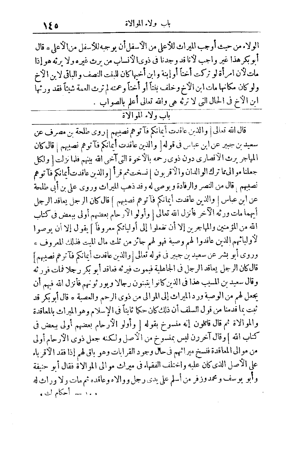 قَالَ اللَّهُ تَعَالَى وَالَّذِينَ عَقَدَتْ أَيْمانُكُمْ فَآتُوهُمْ نَصِيبَهُمْ رَوَى طَلْحَةُ بْنُ مُصَرِّفٍ عَنْ سَعِيدِ بْنِ جُبَيْرٍ عَنْ ابْنِ عَبَّاسٍ فِي قَوْلِهِ وَالَّذِينَ عَقَدَتْ أَيْمانُكُمْ فَآتُوهُمْ نَصِيبَهُمْ قَالَ كَانَ الْمُهَاجِرُ يَرِثُ الْأَنْصَارِيَّ دُونَ ذَوِي رَحِمِهِ بِالْأُخُوَّةِ الَّتِي آخَى اللَّهُ بَيْنَهُمْ فَلَمَّا نَزَلَتْ وَلِكُلٍّ جَعَلْنا مَوالِيَ مِمَّا تَرَكَ الْوالِدانِ وَالْأَقْرَبُونَ نُسِخَتْ ثُمَّ قَرَأَ وَالَّذِينَ عَقَدَتْ أَيْمانُكُمْ فَآتُوهُمْ نَصِيبَهُمْ قَالَ مِنْ النَّصْرِ وَالرِّفَادَةِ وَيُوصِي لَهُ وَقَدْ ذَهَبَ الْمِيرَاثُ وَرَوَى عَلِيُّ بْنُ أَبِي طَلْحَةَ عَنْ ابْنِ عَبَّاسٍ وَالَّذِينَ عَقَدَتْ أَيْمانُكُمْ فَآتُوهُمْ نَصِيبَهُمْ قَالَ كَانَ الرَّجُلُ يُعَاقِدُ الرَّجُلَ أَيُّهُمَا مَاتَ ورثه الآخر فأنزل الله تعالى وَأُولُوا الْأَرْحامِ بَعْضُهُمْ أَوْلى بِبَعْضٍ فِي كِتابِ اللَّهِ مِنَ الْمُؤْمِنِينَ وَالْمُهاجِرِينَ إِلَّا أَنْ تَفْعَلُوا إِلى أَوْلِيائِكُمْ مَعْرُوفاً يَقُولُ إلَّا أَنْ يُوصُوا لِأَوْلِيَائِهِمْ الَّذِينَ عَاقَدُوا لَهُمْ وَصِيَّةً فَهُوَ لَهُمْ جَائِزٌ مِنْ ثُلُثِ مَالِ الْمَيِّتِ فَذَلِكَ الْمَعْرُوفُ وَرَوَى أَبُو بِشْرٍ عَنْ سَعِيدِ بْنِ جُبَيْرٍ فِي قَوْله تَعَالَى وَالَّذِينَ عَقَدَتْ أَيْمانُكُمْ فَآتُوهُمْ نَصِيبَهُمْ قَالَ كَانَ الرَّجُلُ يُعَاقِدُ الرَّجُلَ فِي الْجَاهِلِيَّةِ فَيَمُوتُ فَيَرِثُهُ فَعَاقَدَ أَبُو بَكْرٍ رَجُلًا فَمَاتَ فَوَرِثَهُ وَقَالَ سَعِيدُ بْنُ الْمُسَيِّبِ هَذَا فِي الَّذِينَ كَانُوا يَتَبَنَّوْنَ رِجَالًا وَيُوَرِّثُونَهُمْ فَأَنْزَلَ اللَّهُ فِيهِمْ أَنْ يُجْعَلَ لَهُمْ مِنْ الْوَصِيَّةِ وَرَدَّ الْمِيرَاثَ إلَى الْمَوَالِي مِنْ ذَوِي الرَّحِمِ وَالْعَصَبَةِ قَالَ أَبُو بَكْرٍ قَدْ ثَبَتَ بِمَا قَدَّمْنَا مِنْ قَوْلِ السَّلَفِ أَنَّ ذَلِكَ كَانَ حُكْمًا ثَابِتًا فِي الْإِسْلَامِ وَهُوَ الْمِيرَاثُ بِالْمُعَاقَدَةِ وَالْمُوَالَاةِ ثم قال قائلون إنه منسوخ بقوله وَأُولُوا الْأَرْحامِ بَعْضُهُمْ أَوْلى بِبَعْضٍ فِي كِتابِ اللَّهِ وَقَالَ آخَرُونَ لَيْسَ بِمَنْسُوخٍ مِنْ الْأَصْلِ وَلَكِنَّهُ جَعَلَ ذَوِي الْأَرْحَامِ أَوْلَى مِنْ مَوَالِي الْمُعَاقَدَةِ فَنَسَخَ مِيرَاثَهُمْ فِي حَالِ وُجُودِ الْقَرَابَاتِ وَهُوَ بَاقٍ لَهُمْ إذَا فَقَدَ الْأَقْرِبَاءَ عَلَى الْأَصْلِ الَّذِي كَانَ عَلَيْهِ وَاخْتَلَفَ الْفُقَهَاءُ فِي مِيرَاثِ مَوَالِي الْمُوَالَاةِ فَقَالَ أَبُو حَنِيفَةَ وَأَبُو يُوسُفَ وَمُحَمَّدٌ وَزُفَرُ مَنْ أَسْلَمَ عَلَى يَدَيْ رَجُلٍ ووالاه وعاقده ثم مات ولا وراث له «10- أحكام لث»