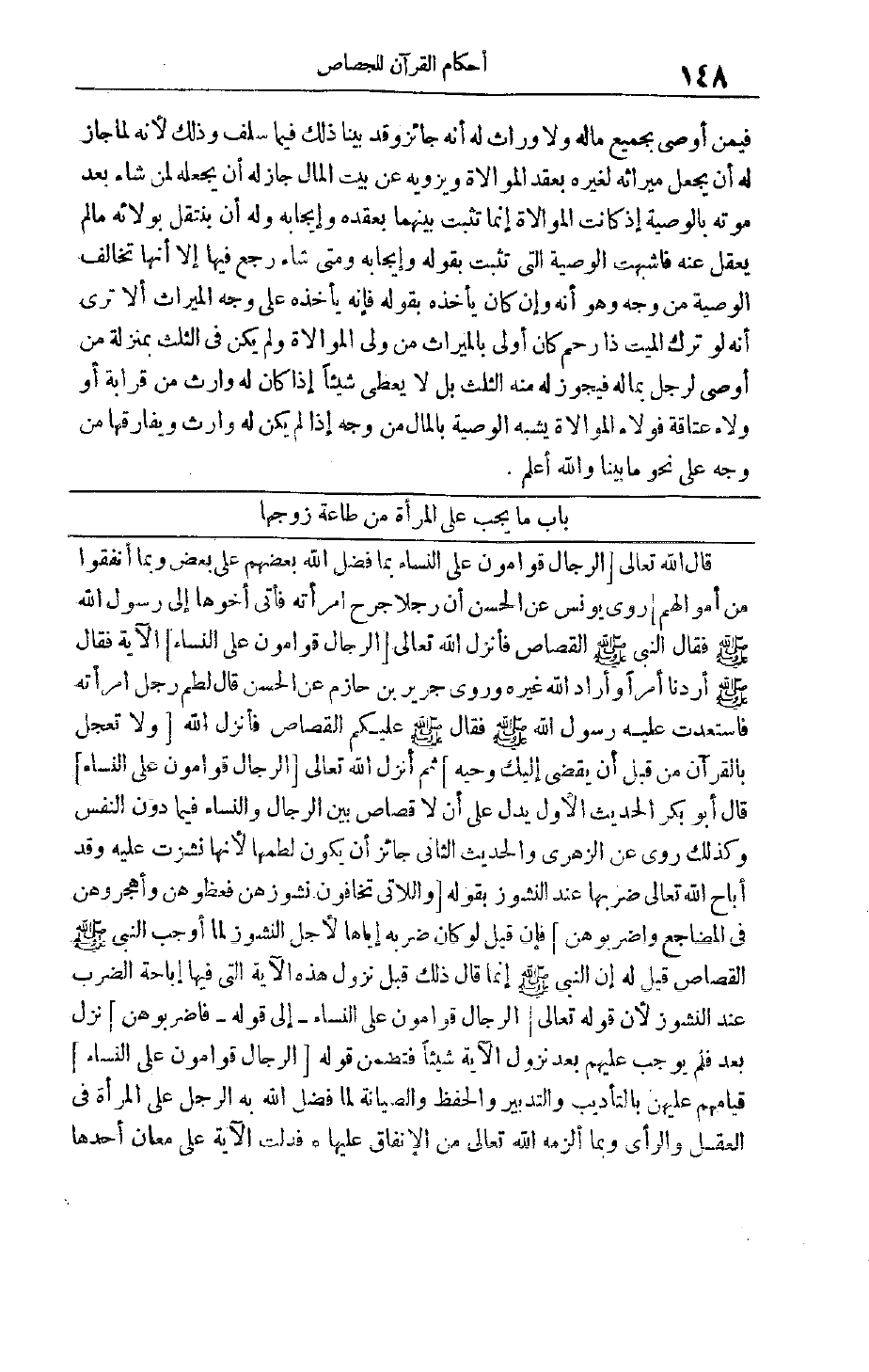 قَالَ أَبُو بَكْرٍ الْحَدِيثُ الْأَوَّلُ يَدُلُّ عَلَى أَنْ لَا قِصَاصَ بَيْنَ الرِّجَالِ وَالنِّسَاءِ فِيمَا دُونَ النَّفْسِ وَكَذَلِكَ رُوِيَ عَنْ الزُّهْرِيِّ وَالْحَدِيثُ الثَّانِي جَائِزٌ أَنْ يَكُونَ لَطَمَهَا لِأَنَّهَا نَشَزَتْ عَلَيْهِ وَقَدْ أَبَاحَ اللَّهُ تَعَالَى ضَرْبَهَا عِنْدَ النُّشُوزِ بِقَوْلِهِ وَاللَّاتِي تَخافُونَ نُشُوزَهُنَّ فَعِظُوهُنَّ وَاهْجُرُوهُنَّ فِي الْمَضاجِعِ وَاضْرِبُوهُنَّ فَإِنْ قِيلَ لَوْ كَانَ ضَرْبُهُ إيَّاهَا لِأَجْلِ النُّشُوزِ لَمَا أَوْجَبَ النَّبِيُّ صَلَّى اللَّهُ عَلَيْهِ وَسَلَّمَ الْقِصَاصَ قِيلَ لَهُ إنَّ النَّبِيَّ صَلَّى اللَّهُ عَلَيْهِ وَسَلَّمَ إنَّمَا قَالَ ذَلِكَ قَبْلَ نُزُولِ هَذِهِ الْآيَةِ الَّتِي فِيهَا إبَاحَةُ الضَّرْبِ عِنْدَ النُّشُوزِ لِأَنَّ قَوْله تَعَالَى الرِّجالُ قَوَّامُونَ عَلَى النِّساءِ- إلى قوله- وَاضْرِبُوهُنَّ نَزَلَ بَعْدُ فَلَمْ يُوجِبْ عَلَيْهِمْ بَعْدَ نُزُولِ الْآيَةِ شَيْئًا فَتَضَمَّنَ قَوْلُهُ الرِّجالُ قَوَّامُونَ عَلَى النِّساءِ قِيَامَهُمْ عَلَيْهِنَّ بِالتَّأْدِيبِ وَالتَّدْبِيرِ وَالْحِفْظِ وَالصِّيَانَةِ لِمَا فَضَّلَ اللَّهُ بِهِ الرَّجُلَ عَلَى الْمَرْأَةِ فِي الْعَقْلِ وَالرَّأْيِ وَبِمَا أَلْزَمَهُ اللَّهُ تَعَالَى مِنْ الْإِنْفَاقِ عَلَيْهَا فَدَلَّتْ الْآيَةُ عَلَى مَعَانٍ أحدها