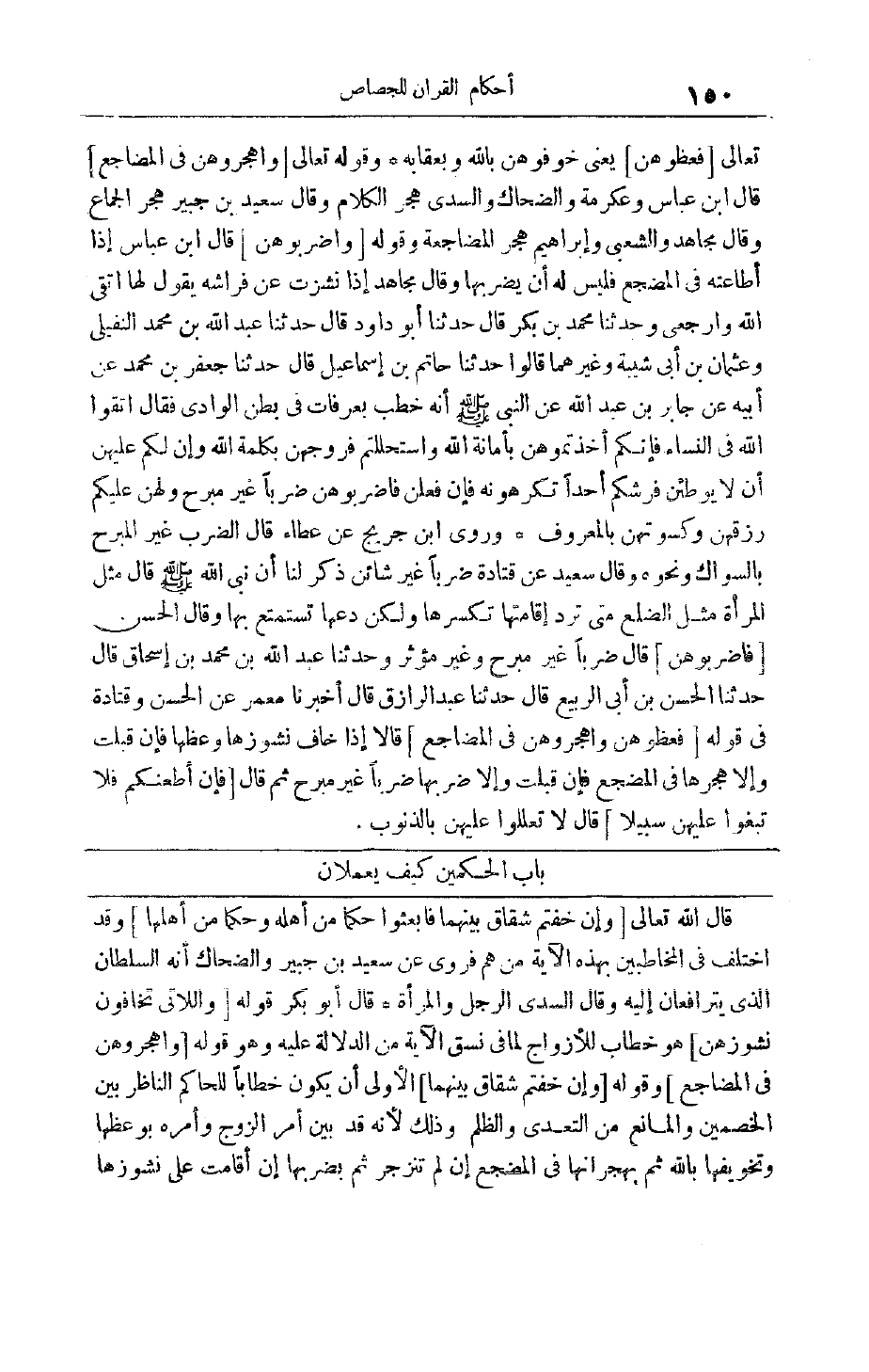 قَالَ اللَّهُ تَعَالَى وَإِنْ خِفْتُمْ شِقاقَ بَيْنِهِما فَابْعَثُوا حَكَماً مِنْ أَهْلِهِ وَحَكَماً مِنْ أَهْلِها وَقَدْ اُخْتُلِفَ فِي الْمُخَاطَبِينَ بِهَذِهِ الْآيَةِ مَنْ هُمْ فَرُوِيَ عَنْ سَعِيدِ بْنِ جُبَيْرٍ وَالضَّحَّاكِ أَنَّهُ السُّلْطَانُ الَّذِي يَتَرَافَعَانِ إلَيْهِ وَقَالَ السُّدِّيُّ الرَّجُلُ وَالْمَرْأَةُ قَالَ أَبُو بَكْرٍ قَوْلُهُ وَاللَّاتِي تَخافُونَ نُشُوزَهُنَّ هُوَ خِطَابٌ لِلْأَزْوَاجِ لِمَا فِي نَسَقِ الْآيَةِ مِنْ الدَّلَالَةِ عَلَيْهِ وَهُوَ قَوْلُهُ وَاهْجُرُوهُنَّ فِي الْمَضاجِعِ وقوله وَإِنْ خِفْتُمْ شِقاقَ بَيْنِهِما الْأَوْلَى أَنْ يَكُونَ خِطَابًا لِلْحَاكِمِ النَّاظِرِ بَيْنَ الْخَصْمَيْنِ وَالْمَانِعِ مِنْ التَّعَدِّي وَالظُّلْمِ وَذَلِكَ لِأَنَّهُ قَدْ بَيَّنَ أَمْرَ الزَّوْجِ وَأَمَرَهُ بِوَعْظِهَا وَتَخْوِيفِهَا بِاَللَّهِ ثُمَّ بِهِجْرَانِهَا فِي الْمَضْجَعِ إنْ لَمْ تَنْزَجِرْ ثُمَّ بِضَرْبِهَا إنْ أَقَامَتْ عَلَى نُشُوزِهَا