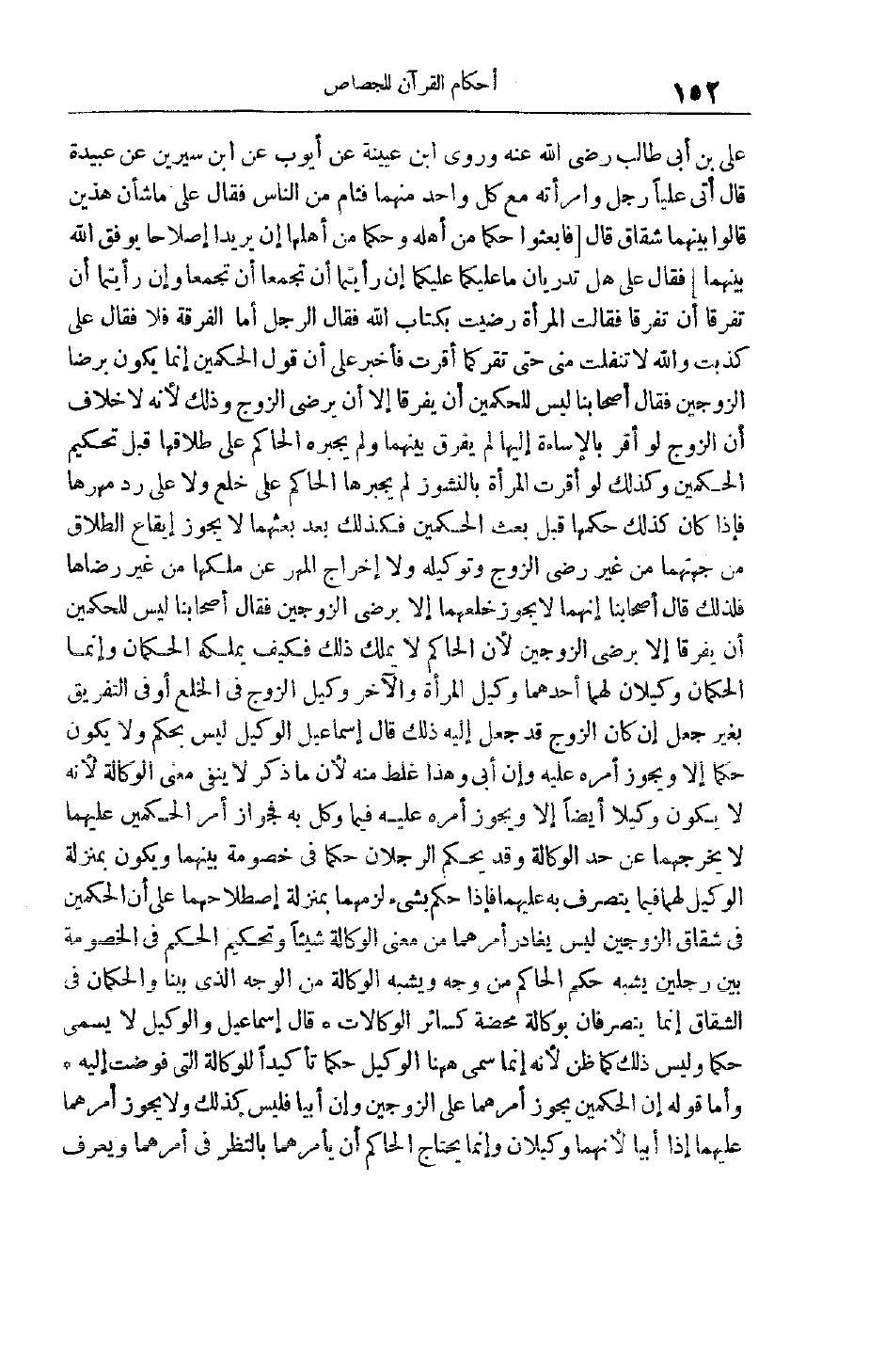 وَرَوَى ابْنُ عُيَيْنَةَ عَنْ أَيُّوبَ عَنْ ابْنِ سِيرِينَ عَنْ عُبَيْدَةَ قَالَ أَتَى عَلِيًّا رَجُلٌ وَامْرَأَتُهُ مَعَ كُلِّ وَاحِدٍ مِنْهُمَا فِئَامٌ مِنْ النَّاسِ فَقَالَ عَلِيٌّ مَا شَأْنُ هَذَيْنِ قَالُوا بَيْنَهُمَا شِقَاقٌ قَالَ فَابْعَثُوا حَكَماً مِنْ أَهْلِهِ وَحَكَماً مِنْ أَهْلِها إِنْ يُرِيدا إِصْلاحاً يُوَفِّقِ اللَّهُ بَيْنَهُما فَقَالَ عَلِيٌّ هَلْ تَدْرِيَانِ مَا عَلَيْكُمَا عَلَيْكُمَا إنْ رَأَيْتُمَا أَنْ تَجْمَعَا أَنْ تَجْمَعَا وَإِنْ رَأَيْتُمَا أَنْ تُفَرِّقَا أَنْ تَفَرَّقَا فَقَالَتْ الْمَرْأَةُ رَضِيتُ بِكِتَابِ اللَّهِ فَقَالَ الرَّجُلُ أَمَّا الْفُرْقَةُ فَلَا فَقَالَ عَلِيٌّ كَذَبْت وَاَللَّهِ لَا تَنْفَلِت منى حتى تقركما أَقَرَّتْ