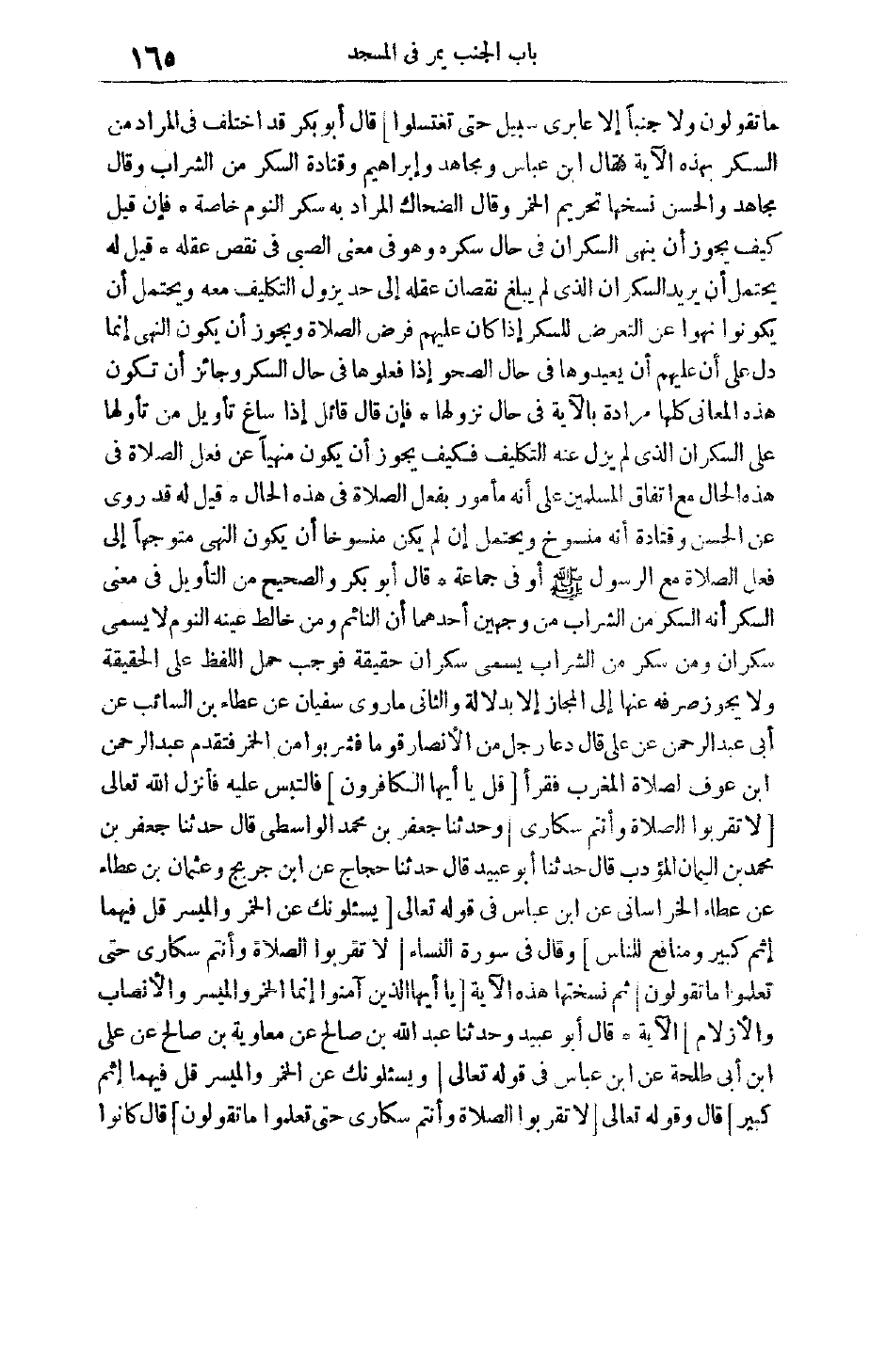 قَالَ أَبُو بَكْرٍ قَدْ اُخْتُلِفَ فِي الْمُرَادِ مِنْ السُّكْرِ بِهَذِهِ الْآيَةِ فَقَالَ ابْنُ عَبَّاسٍ وَمُجَاهِدٌ وَإِبْرَاهِيمُ وَقَتَادَةُ السُّكْرُ مِنْ الشَّرَابِ وَقَالَ مُجَاهِدٌ وَالْحَسَنُ نَسَخَهَا تَحْرِيمُ الْخَمْرِ وَقَالَ الضَّحَّاكُ الْمُرَادُ بِهِ سُكْرُ النَّوْمِ خَاصَّةً فَإِنْ قِيلَ كَيْفَ يَجُوزُ أَنْ يُنْهَى السَّكْرَانُ فِي حَالِ سُكْرِهِ وَهُوَ فِي مَعْنَى الصَّبِيِّ فِي نَقْصِ عَقْلِهِ قِيلَ لَهُ يَحْتَمِلُ أَنْ يُرِيدَ السَّكْرَانَ الَّذِي لَمْ يَبْلُغْ نُقْصَانُ عَقْلِهِ إلَى حَدٍّ يَزُولُ التَّكْلِيفُ مَعَهُ وَيَحْتَمِلُ أَنْ يَكُونُوا نُهُوا عَنْ التَّعَرُّضِ لِلسُّكْرِ إذَا كَانَ عَلَيْهِمْ فَرْضُ الصَّلَاةِ وَيَجُوزُ أَنْ يَكُونَ النَّهْيُ إنَّمَا دَلَّ عَلَى أَنَّ عَلَيْهِمْ أَنْ يُعِيدُوهَا فِي حَالِ الصَّحْوِ إذَا فَعَلُوهَا فِي حَالِ السُّكْرِ وَجَائِزٌ أَنْ تَكُونَ هَذِهِ الْمَعَانِي كُلُّهَا مُرَادَةً بِالْآيَةِ فِي حَالِ نُزُولِهَا فَإِنْ قَالَ قَائِلٌ إذَا سَاغَ تَأْوِيلُ مَنْ تَأَوَّلَهَا عَلَى السَّكْرَانِ الَّذِي لَمْ يُزَلْ عَنْهُ التَّكْلِيفُ فَكَيْفَ يَجُوزُ أَنْ يَكُونَ مَنْهِيًّا عَنْ فِعْلِ الصَّلَاةِ فِي هَذِهِ الْحَالِ مَعَ اتِّفَاقِ الْمُسْلِمِينَ عَلَى أَنَّهُ مَأْمُورٌ بِفِعْلِ الصَّلَاةِ فِي هَذِهِ الْحَالِ قِيلَ لَهُ قَدْ رُوِيَ عَنْ الْحَسَنِ وَقَتَادَةَ أَنَّهُ مَنْسُوخٌ وَيَحْتَمِلُ إنْ لَمْ يَكُنْ مَنْسُوخًا أَنْ يَكُونَ النَّهْيُ مُتَوَجِّهًا إلَى فِعْلِ الصَّلَاةِ مَعَ الرَّسُولِ صَلَّى اللَّهُ عَلَيْهِ وَسَلَّمَ أَوْ فِي جَمَاعَةٍ قَالَ أَبُو بَكْرٍ وَالصَّحِيحُ مِنْ التَّأْوِيلِ فِي مَعْنَى السُّكْرِ أَنَّهُ السُّكْرُ مِنْ الشَّرَابِ مِنْ وَجْهَيْنِ أَحَدِهِمَا أَنَّ النَّائِمَ وَمَنْ خَالَطَ عَيْنَهُ النَّوْمُ لَا يُسَمَّى سَكْرَانَ وَمَنْ سَكِرَ مِنْ الشَّرَابِ يُسَمَّى سَكْرَانَ حَقِيقَةً فَوَجَبَ حَمْلُ اللَّفْظِ عَلَى الْحَقِيقَةِ وَلَا يَجُوزُ صَرْفُهُ عَنْهَا إلَى الْمَجَازِ إلَّا بِدَلَالَةٍ وَالثَّانِي مَا