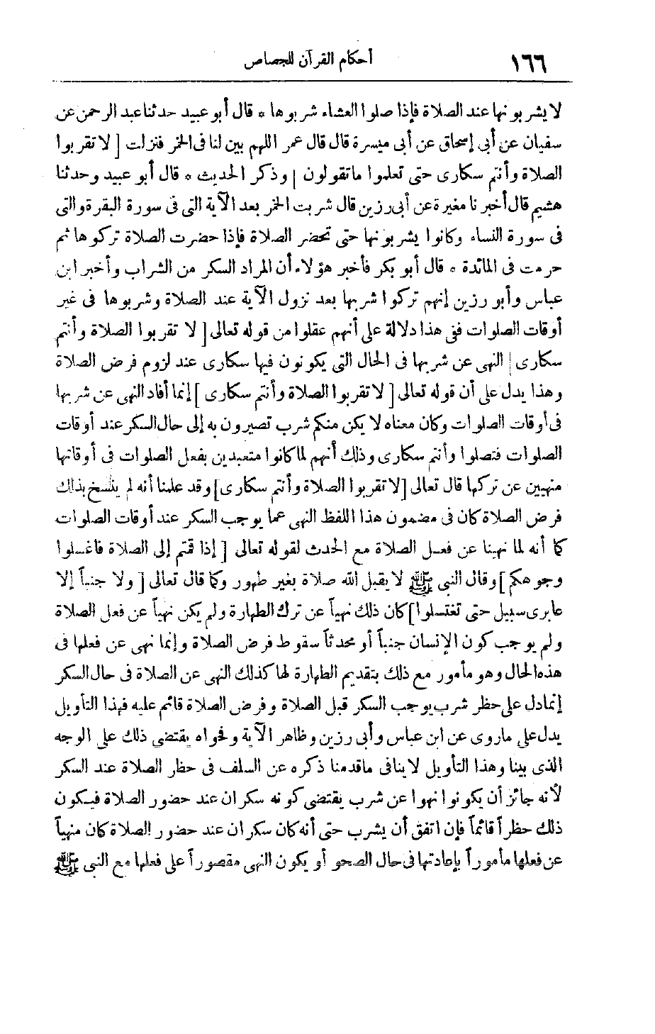لَا يَشْرَبُونَهَا عِنْدَ الصَّلَاةِ فَإِذَا صَلَّوْا الْعِشَاءَ شَرِبُوهَا قَالَ أَبُو عُبَيْدٍ حَدَّثَنَا عَبْدُ الرَّحْمَنِ عَنْ سُفْيَانَ عَنْ أَبِي إِسْحَاقَ عَنْ أَبِي مَيْسَرَةَ قَالَ قَالَ عُمَرُ اللَّهُمَّ بَيِّنْ لَنَا فِي الْخَمْرِ فَنَزَلَتْ لا تَقْرَبُوا الصَّلاةَ وَأَنْتُمْ سُكارى حَتَّى تَعْلَمُوا ما تَقُولُونَ وَذَكَرَ الْحَدِيثَ قَالَ أَبُو عُبَيْدٍ وَحَدَّثَنَا هُشَيْمٌ قَالَ أَخْبَرَنَا مُغِيرَةُ عَنْ أَبِي رَزِينٍ قَالَ شُرِبَتْ الْخَمْرَ بَعْدَ الْآيَةِ الَّتِي فِي سُورَةِ الْبَقَرَةِ وَاَلَّتِي فِي سُورَةِ النِّسَاءِ وَكَانُوا يَشْرَبُونَهَا حَتَّى تَحْضُرَ الصَّلَاةُ فَإِذَا حَضَرَتْ الصَّلَاةُ تَرَكُوهَا ثُمَّ حُرِّمَتْ فِي الْمَائِدَةِ قَالَ أَبُو بَكْرٍ فَأَخْبَرَ هَؤُلَاءِ أَنَّ الْمُرَادَ السُّكْرُ مِنْ الشَّرَابِ وَأَخْبَرَ ابْنُ عَبَّاسٍ وَأَبُو رَزِينٍ أَنَّهُمْ تَرَكُوا شُرْبَهَا بَعْدَ نُزُولِ الْآيَةِ عِنْدَ الصَّلَاةِ وَشَرِبُوهَا فِي غَيْرِ أَوْقَاتِ الصَّلَوَاتِ فَفِي هَذَا دَلَالَةٌ عَلَى أَنَّهُمْ عَقَلُوا مِنْ قَوْله تَعَالَى لا تَقْرَبُوا الصَّلاةَ وَأَنْتُمْ سُكارى النَّهْيَ عَنْ شُرْبِهَا فِي الْحَالِ الَّتِي يَكُونُونَ فِيهَا سُكَارَى عِنْدَ لُزُومِ فَرْضِ الصَّلَاةِ وَهَذَا يَدُلُّ عَلَى أَنَّ قَوْله تَعَالَى لا تَقْرَبُوا الصَّلاةَ وَأَنْتُمْ سُكارى إنَّمَا أَفَادَ النَّهْيَ عَنْ شُرْبِهَا فِي أَوْقَاتِ الصَّلَوَاتِ وَكَانَ مَعْنَاهُ لَا يَكُنْ مِنْكُمْ شُرْبٌ تَصِيرُونَ بِهِ إلَى حَالِ السُّكْرِ عِنْدَ أَوْقَاتِ الصَّلَوَاتِ فَتُصَلُّوا وَأَنْتُمْ سُكَارَى وَذَلِكَ أَنَّهُمْ لَمَّا كَانُوا مُتَعَبِّدِينَ بِفِعْلِ الصَّلَوَاتِ فِي أَوْقَاتِهَا مَنْهِيِّينَ عَنْ تَرْكِهَا قَالَ تَعَالَى لا تَقْرَبُوا الصَّلاةَ وَأَنْتُمْ سُكارى وَقَدْ عِلْمنَا أَنَّهُ لَمْ يُنْسَخْ بِذَلِكَ فَرْضُ الصَّلَاةِ كَانَ فِي مَضْمُونِ هَذَا اللَّفْظِ النَّهْيُ عَمَّا يُوجِبُ السُّكْرَ عِنْدَ أَوْقَاتِ الصَّلَوَاتِ كَمَا أَنَّهُ لَمَّا نُهِينَا عَنْ فِعْلِ الصَّلَاةِ مَعَ الْحَدَثِ لِقَوْلِهِ تَعَالَى إِذا قُمْتُمْ إِلَى الصَّلاةِ فَاغْسِلُوا وُجُوهَكُمْ