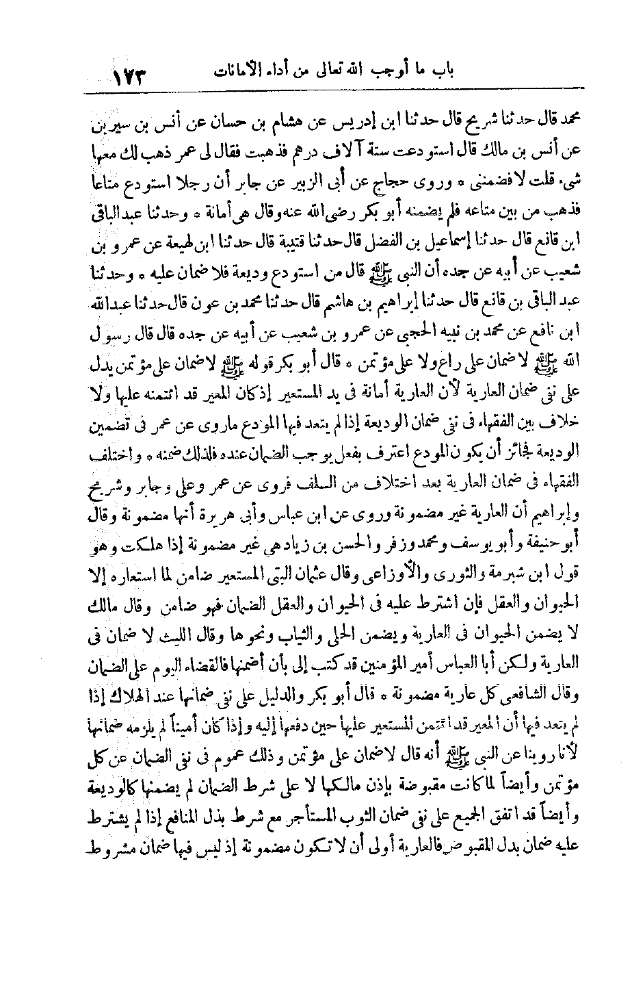 مُحَمَّدٍ قَالَ حَدَّثَنَا شُرَيْحٌ قَالَ حَدَّثَنَا ابْنُ إدْرِيسَ عَنْ هِشَامِ بْنِ حَسَّانٍ عَنْ أَنَسِ بْنِ سِيرِينَ عَنْ أَنَسِ بْنِ مَالِكٍ قَالَ اُسْتُوْدِعْت سِتَّةَ آلَافِ دِرْهَمٍ فَذَهَبَتْ فَقَالَ لِي عُمَرُ ذَهَبَ لَكَ مَعَهَا شَيْءٌ قُلْت لَا فَضَمَّنَنِي وَرَوَى حَجَّاجٌ عَنْ أَبِي الزُّبَيْرِ عَنْ جَابِرٍ أَنَّ رَجُلًا اُسْتُوْدِعَ مَتَاعًا فَذَهَبَ مِنْ بَيْنِ مَتَاعِهِ فَلَمْ يُضَمِّنْهُ أَبُو بَكْرٍ رَضِيَ اللَّهُ عَنْهُ وَقَالَ هِيَ أَمَانَةٌ