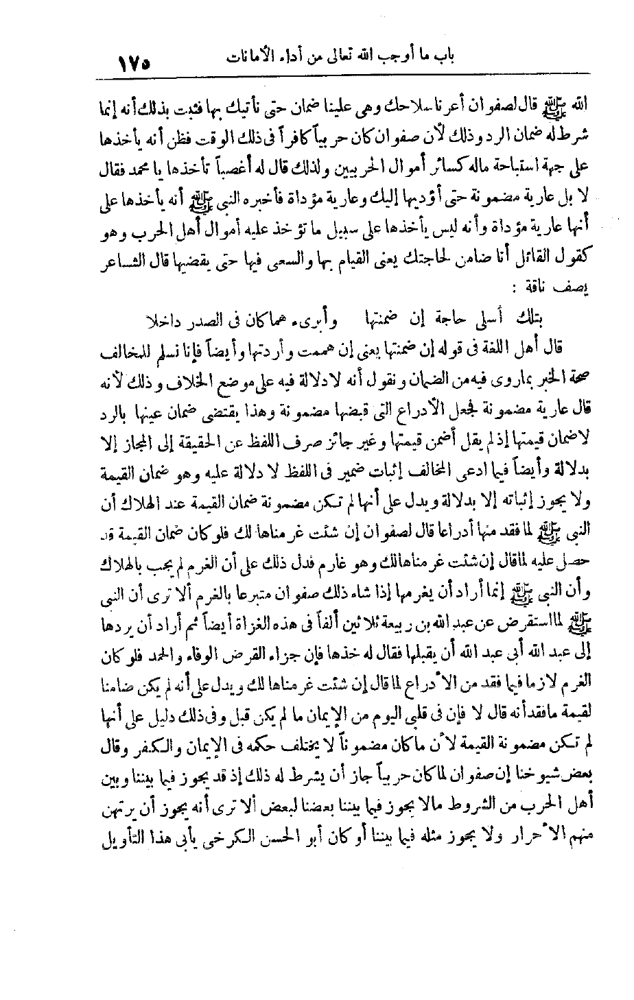 فَثَبَتَ بِذَلِكَ أَنَّهُ إنَّمَا شَرَطَ لَهُ ضَمَانَ الرَّدِّ وَذَلِكَ لِأَنَّ صَفْوَانَ كَانَ حَرْبِيًّا كَافِرًا فِي ذَلِكَ الْوَقْتِ فَظَنَّ أَنَّهُ يَأْخُذُهَا عَلَى جِهَةِ اسْتِبَاحَةِ مَالِهِ كَسَائِرِ أَمْوَالِ الْحَرْبِيِّينَ وَلِذَلِكَ قَالَ لَهُ أَغَصْبًا تَأْخُذُهَا يَا مُحَمَّدُ فَقَالَ لَا بَلْ عَارِيَّةٌ مَضْمُونَةٌ حَتَّى أُؤَدِّيَهَا إلَيْكَ وَعَارِيَّةٌ مُؤَدَّاةٌ فَأَخْبَرَهُ النَّبِيُّ صَلَّى اللَّهُ عَلَيْهِ وَسَلَّمَ أَنَّهُ يَأْخُذُهَا عَلَى أَنَّهَا عَارِيَّةٌ مُؤَدَّاةٌ وَأَنَّهُ لَيْسَ يَأْخُذُهَا عَلَى سَبِيلِ مَا تُؤْخَذُ عَلَيْهِ أَمْوَالُ أَهْلِ الْحَرْبِ وَهُوَ كَقَوْلِ الْقَائِلِ أَنَا ضَامِنٌ لِحَاجَتِكَ يَعْنِي الْقِيَامَ بِهَا وَالسَّعْيَ فِيهَا حَتَّى يَقْضِيَهَا قَالَ الشَّاعِرُ يَصِفُ نَاقَةً: