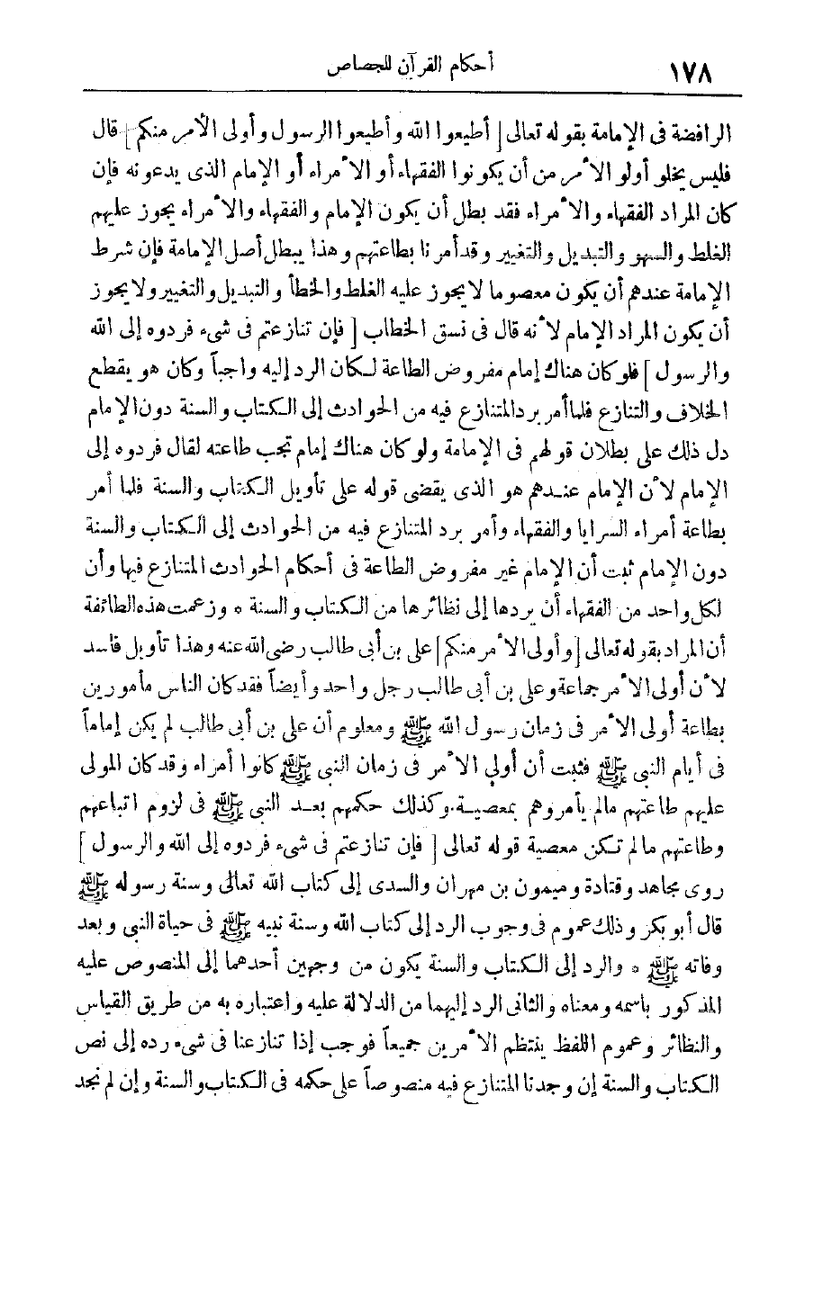الرَّافِضَةِ فِي الْإِمَامَةِ بِقَوْلِهِ تَعَالَى أَطِيعُوا اللَّهَ وَأَطِيعُوا الرَّسُولَ وَأُولِي الْأَمْرِ مِنْكُمْ قَالَ فَلَيْسَ يَخْلُو أُولُو الْأَمْرِ مِنْ أَنْ يَكُونُوا الْفُقَهَاءَ أَوْ الْأُمَرَاءَ أَوْ الْإِمَامَ الَّذِي يَدْعُونَهُ فَإِنْ كَانَ الْمُرَادُ الْفُقَهَاءَ وَالْأُمَرَاءَ فَقَدْ بَطَلَ أَنْ يَكُونَ الْإِمَامُ وَالْفُقَهَاءُ وَالْأُمَرَاءُ يَجُوزُ عَلَيْهِمْ الْغَلَطُ وَالسَّهْوُ وَالتَّبْدِيلُ وَالتَّغْيِيرُ وَقَدْ أُمِرْنَا بِطَاعَتِهِمْ وَهَذَا يُبْطِلُ أَصْلَ الْإِمَامَةِ فَإِنَّ شَرْطَ الإمامة عِنْدَهُمْ أَنْ يَكُونَ مَعْصُومًا لَا يَجُوزُ عَلَيْهِ الْغَلَطُ وَالْخَطَأُ وَالتَّبْدِيلُ وَالتَّغْيِيرُ وَلَا يَجُوزُ أَنْ يَكُونَ الْمُرَادُ الْإِمَامَ لِأَنَّهُ قَالَ فِي نَسَقِ الْخِطَابِ فَإِنْ تَنازَعْتُمْ فِي شَيْءٍ فَرُدُّوهُ إِلَى اللَّهِ وَالرَّسُولِ فَلَوْ كَانَ هُنَاكَ إمَامٌ مَفْرُوضُ الطَّاعَةِ لَكَانَ الرَّدُّ إلَيْهِ وَاجِبًا وَكَانَ هُوَ يَقْطَعُ الْخِلَافَ وَالتَّنَازُعَ فَلَمَّا أَمَرَ بِرَدِّ الْمُتَنَازَعِ فِيهِ مِنْ الْحَوَادِثِ إلَى الْكِتَابِ وَالسُّنَّةِ دُونَ الْإِمَامِ دَلَّ ذَلِكَ عَلَى بُطْلَانِ قَوْلِهِمْ فِي الْإِمَامَةِ وَلَوْ كَانَ هُنَاكَ إمَامٌ تَجِبُ طَاعَتُهُ لَقَالَ فَرُدُّوهُ إلَى الْإِمَامِ لِأَنَّ الْإِمَامَ عِنْدَهُمْ هُوَ الَّذِي يَقْضِي قَوْلُهُ عَلَى تَأْوِيلِ الْكِتَابِ وَالسُّنَّةِ فَلَمَّا أَمَرَ بِطَاعَةِ أُمَرَاءِ السَّرَايَا وَالْفُقَهَاءِ وَأَمَرَ بِرَدِّ الْمُتَنَازَعِ فِيهِ مِنْ الْحَوَادِثِ إلَى الْكِتَابِ وَالسُّنَّةِ دُونَ الْإِمَامِ ثَبَتَ أَنَّ الْإِمَامَ غَيْرُ مَفْرُوضِ الطَّاعَةِ فِي أَحْكَامِ الْحَوَادِثِ الْمُتَنَازَعِ فِيهَا وَأَنَّ لِكُلِّ وَاحِدٍ مِنْ الْفُقَهَاءِ أَنْ يَرُدَّهَا إلَى نَظَائِرِهَا مِنْ الْكِتَابِ وَالسُّنَّةِ وَزَعَمَتْ هَذِهِ الطَّائِفَةُ أَنَّ الْمُرَادَ بِقَوْلِهِ تَعَالَى وَأُولِي الْأَمْرِ مِنْكُمْ عَلِيُّ بْنُ أَبِي طَالِبٍ رَضِيَ اللَّهُ عَنْهُ وَهَذَا تَأْوِيلٌ فَاسِدٌ لِأَنَّ أُولِي الْأَمْرِ جَمَاعَةٌ وَعَلِيُّ بْنُ أَبِي طَالِبٍ رَجُلٌ وَاحِدٌ وَأَيْضًا فَقَدْ كَانَ النَّاسُ مَأْمُورِينَ بِطَاعَةِ أُولِي الْأَمْرِ فِي زَمَانِ رَسُولِ اللَّهِ صَلَّى اللَّهُ عَلَيْهِ وَسَلَّمَ وَمَعْلُومٌ أَنَّ عَلِيَّ بْنَ أَبِي طَالِبٍ لَمْ يَكُنْ إمَامًا فِي أَيَّامِ النَّبِيِّ صَلَّى اللَّهُ عَلَيْهِ وَسَلَّمَ فَثَبَتَ أَنَّ أُولِي الْأَمْرِ فِي زَمَانِ النَّبِيِّ صَلَّى اللَّهُ عَلَيْهِ وَسَلَّمَ كانوا أمراء وقد كان الْمُوَلَّى عَلَيْهِمْ طَاعَتُهُمْ مَا لَمْ يَأْمُرُوهُمْ بِمَعْصِيَةٍ. وَكَذَلِكَ حُكْمُهُمْ بَعْدَ النَّبِيِّ صَلَّى اللَّهُ عَلَيْهِ وَسَلَّمَ فِي لُزُومِ اتِّبَاعِهِمْ وَطَاعَتِهِمْ مَا لَمْ تكن معصية قَوْله تَعَالَى فَإِنْ تَنازَعْتُمْ فِي شَيْءٍ فَرُدُّوهُ إِلَى اللَّهِ وَالرَّسُولِ روى مُجَاهِدٍ وَقَتَادَةَ وَمَيْمُونَ بْنِ مِهْرَانَ وَالسُّدِّيِّ إلَى كِتَابِ اللَّهِ تَعَالَى وَسُنَّةِ رَسُولِهِ صَلَّى اللَّهُ عَلَيْهِ وَسَلَّمَ قَالَ أَبُو بَكْرٍ وَذَلِكَ عُمُومٌ فِي وُجُوبِ الرَّدِّ إلَى كِتَابِ اللَّهِ وَسُنَّةِ نَبِيهِ صَلَّى اللَّهُ عَلَيْهِ وَسَلَّمَ فِي حَيَاةِ النَّبِيِّ وَبَعْدَ وَفَاتِهِ صَلَّى اللَّهُ عَلَيْهِ وَسَلَّمَ وَالرَّدُّ إلَى الْكِتَابِ وَالسُّنَّةِ يَكُونُ مِنْ وَجْهَيْنِ أَحَدُهُمَا إلَى الْمَنْصُوصِ عَلَيْهِ الْمَذْكُورِ بِاسْمِهِ وَمَعْنَاهُ والثاني الرد إليهما من الدَّلَالَةِ عَلَيْهِ وَاعْتِبَارِهِ بِهِ مِنْ طَرِيقِ الْقِيَاسِ وَالنَّظَائِرِ وَعُمُومُ اللَّفْظِ يَنْتَظِمُ الْأَ