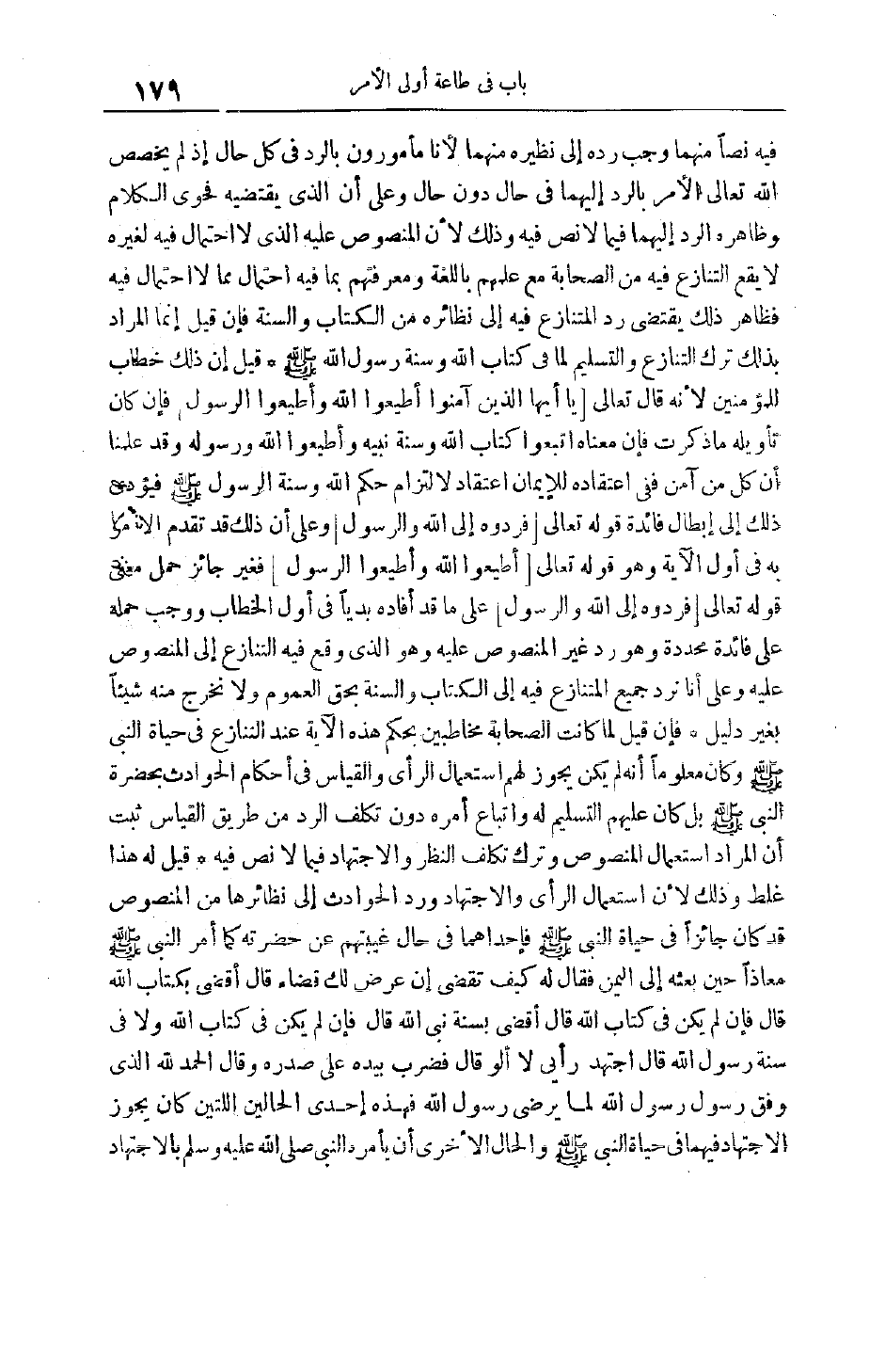 اعْتِقَادٌ لِالْتِزَامِ حُكْمِ اللَّهِ وَسُنَّةِ الرَّسُولِ صَلَّى اللَّهُ عَلَيْهِ وَسَلَّمَ فَيُؤَدِّي ذَلِكَ إلَى إبْطَالِ فَائِدَةِ قَوْله تَعَالَى فَرُدُّوهُ إِلَى اللَّهِ وَالرَّسُولِ وَعَلَى أَنَّ ذَلِكَ قَدْ تَقَدَّمَ الْأَمْرُ بِهِ فِي أَوَّلِ الْآيَةِ وَهُوَ قَوْله تَعَالَى أَطِيعُوا اللَّهَ وَأَطِيعُوا الرَّسُولَ فغير جائز حمل مغنى قوله تعالى فَرُدُّوهُ إِلَى اللَّهِ وَالرَّسُولِ عَلَى مَا قَدْ أَفَادَهُ بَدِيًّا فِي أَوَّلِ الخطاب ووجب حمله على فائدة محددة وَهُوَ رَدُّ غَيْرِ الْمَنْصُوصِ عَلَيْهِ وَهُوَ الَّذِي وَقَعَ فِيهِ التَّنَازُعُ إلَى الْمَنْصُوصِ عَلَيْهِ وَعَلَى أَنَّا نَرُدُّ جَمِيعَ الْمُتَنَازَعِ فِيهِ إلَى الْكِتَابِ وَالسُّنَّةِ بِحَقِّ الْعُمُومِ وَلَا نُخْرِجُ مِنْهُ شَيْئًا بِغَيْرِ دَلِيلٍ فَإِنْ قِيلَ لَمَّا كَانَتْ الصَّحَابَةُ مُخَاطَبِينَ بِحُكْمِ هَذِهِ الْآيَةِ عِنْدَ التَّنَازُعِ فِي حَيَاةِ النَّبِيِّ صَلَّى اللَّهُ عَلَيْهِ وَسَلَّمَ وَكَانَ مَعْلُومًا أَنَّهُ لَمْ يَكُنْ يَجُوزُ لَهُمْ اسْتِعْمَالُ الرَّأْيِ وَالْقِيَاسِ فِي أَحْكَامِ الْحَوَادِثِ بِحَضْرَةِ النَّبِيِّ صَلَّى اللَّهُ عَلَيْهِ وَسَلَّمَ بَلْ كَانَ عَلَيْهِمْ التَّسْلِيمُ لَهُ وَاتِّبَاعُ أَمْرِهِ دُونَ تَكَلُّفِ الرَّدِّ مِنْ طَرِيقِ الْقِيَاسِ ثَبَتَ أَنَّ الْمُرَادَ اسْتِعْمَالُ الْمَنْصُوصِ وَتَرْكُ تَكَلُّفِ النَّظَرِ وَالِاجْتِهَادِ فِيمَا لَا نَصَّ فِيهِ قِيلَ لَهُ هَذَا غَلَطٌ وَذَلِكَ لِأَنَّ اسْتِعْمَالَ الرَّأْيِ وَالِاجْتِهَادِ وَرَدَّ الْحَوَادِثِ إلَى نَظَائِرِهَا مِنْ الْمَنْصُوصِ قَدْ كَانَ جَائِزًا فِي حَيَاةِ النَّبِيِّ صَلَّى اللَّهُ عَلَيْهِ وَسَلَّمَ فَإِحْدَاهُمَا فِي حَالِ غَيْبَتِهِمْ عَنْ حَضْرَتِهِ كَمَا