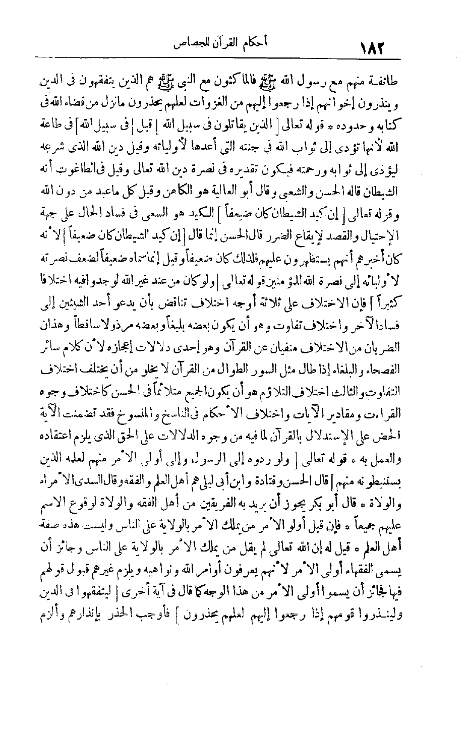 قَوْله تَعَالَى وَلَوْ رَدُّوهُ إِلَى الرَّسُولِ وَإِلى أُولِي الْأَمْرِ مِنْهُمْ لَعَلِمَهُ الَّذِينَ يَسْتَنْبِطُونَهُ مِنْهُمْ قَالَ الْحَسَنُ وَقَتَادَةُ وَابْنُ أَبِي لَيْلَى هُمْ أَهْلُ الْعِلْمِ وَالْفِقْهِ وَقَالَ السُّدِّيُّ الْأُمَرَاءُ وَالْوُلَاةُ قَالَ أَبُو بَكْرٍ يَجُوزُ أَنْ يُرِيدَ بِهِ الْفَرِيقَيْنِ مِنْ أَهْلِ الْفِقْهِ وَالْوُلَاةِ لِوُقُوعِ الِاسْمِ عليهم جميعا فإن قيل أولو الْأَمْرَ مَنْ يَمْلِكُ الْأَمْرَ بِالْوِلَايَةِ عَلَى النَّاسِ وَلَيْسَتْ هَذِهِ صِفَةُ أَهْلِ الْعِلْمِ قِيلَ لَهُ إنَّ اللَّهَ تَعَالَى لَمْ يَقُلْ مَنْ يَمْلِكُ الْأَمْرَ بِالْوِلَايَةِ عَلَى النَّاسِ وَجَائِزٌ أَنْ يُسَمَّى الْفُقَهَاءُ أُولِي الْأَمْرِ لِأَنَّهُمْ يَعْرِفُونَ أَوَامِرَ اللَّهِ وَنَوَاهِيَهُ وَيَلْزَمُ غَيْرَهُمْ قَبُولُ قَوْلِهِمْ فِيهَا فَجَائِزٌ أَنْ يُسَمُّوا أُولِي الْأَمْرِ مِنْ هَذَا الْوَجْهِ كَمَا قَالَ فِي آيَةٍ أُخْرَى لِيَتَفَقَّهُوا فِي الدِّينِ وَلِيُنْذِرُوا قَوْمَهُمْ إِذا رَجَعُوا إِلَيْهِمْ لَعَلَّهُمْ يَحْذَرُونَ فَأَوْجَبَ الْحَذَرَ بِإِنْذَارِهِمْ وَأَلْزَمَ