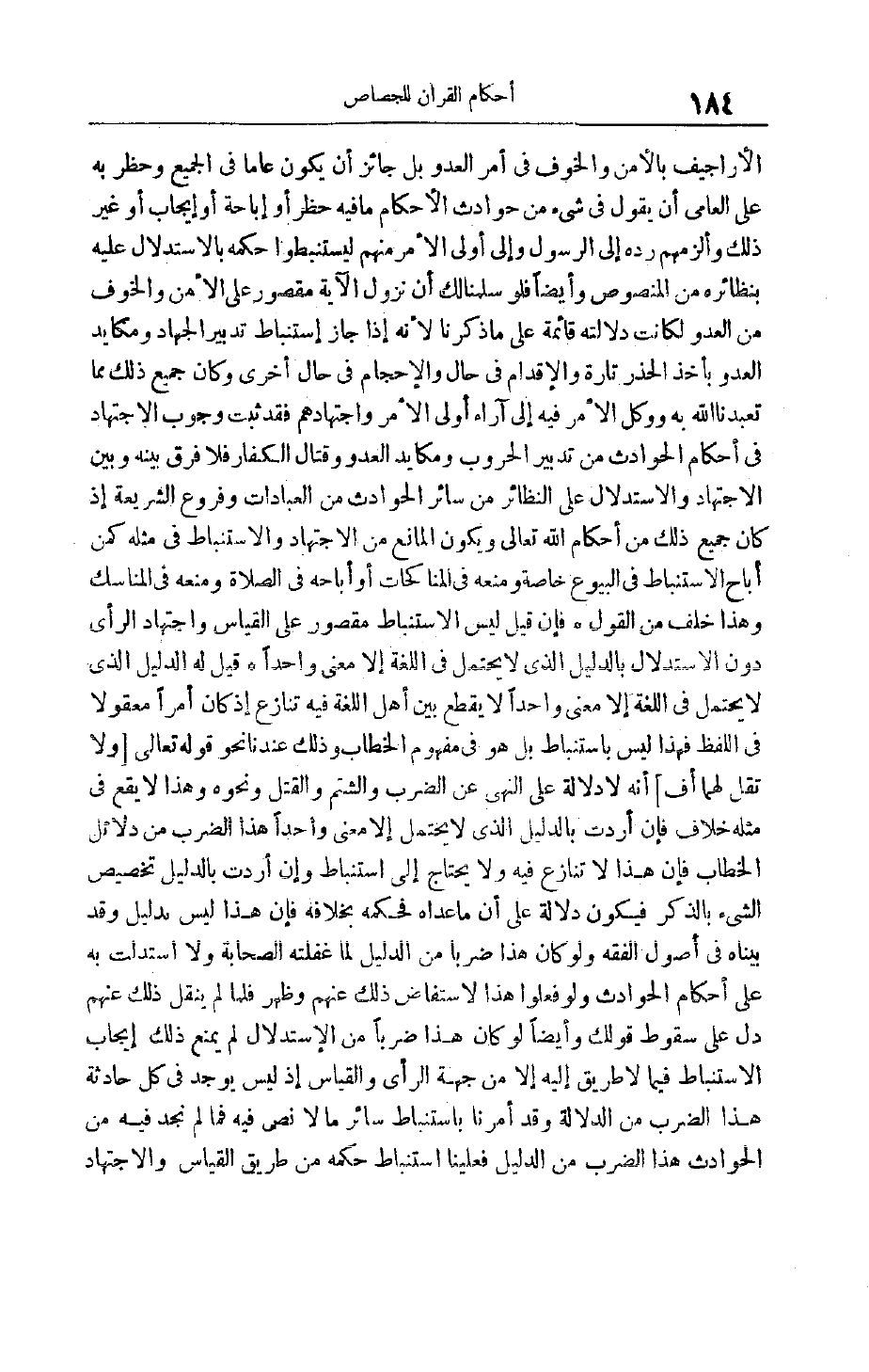 الْأَرَاجِيفِ بِالْأَمْنِ وَالْخَوْفِ فِي أَمْرِ الْعَدُوِّ بَلْ جَائِزٌ أَنْ يَكُونَ عَامًّا فِي الْجَمِيعِ وَحَظَرَ بِهِ عَلَى الْعَامِّيِّ أَنْ يَقُولَ فِي شَيْءٍ مِنْ حَوَادِثِ الْأَحْكَامِ مَا فِيهِ حَظْرٌ أَوْ إبَاحَةٌ أَوْ إيجَابٌ أَوْ غَيْرُ ذَلِكَ وَأَلْزَمَهُمْ رَدَّهُ إلَى الرَّسُولِ وَإِلَى أُولِي الْأَمْرِ مِنْهُمْ لِيَسْتَنْبِطُوا حُكْمَهُ بِالِاسْتِدْلَالِ عَلَيْهِ بِنَظَائِرِهِ مِنْ الْمَنْصُوصِ وَأَيْضًا فَلَوْ سَلَّمْنَا لَك أَنَّ نُزُولَ الْآيَةِ مَقْصُورٌ عَلَى الْأَمْنِ وَالْخَوْفِ مِنْ الْعَدُوِّ لَكَانَتْ دَلَالَتُهُ قَائِمَةً عَلَى مَا ذَكَرْنَا لِأَنَّهُ إذَا جَازَ اسْتِنْبَاطُ تَدْبِيرِ الْجِهَادِ وَمَكَايِدِ الْعَدُوِّ بِأَخْذِ الْحَذَرِ تَارَةً وَالْإِقْدَامِ فِي حَالٍ وَالْإِحْجَامِ فِي حَالٍ أُخْرَى وَكَانَ جَمِيعُ ذَلِكَ مِمَّا تَعَبَّدْنَا اللَّهَ بِهِ وَوُكِلَ الْأَمْرُ فِيهِ إلَى آرَاءِ أُولِي الْأَمْرِ وَاجْتِهَادِهِمْ فَقَدْ ثَبَتَ وُجُوبُ الِاجْتِهَادِ فِي أَحْكَامِ الْحَوَادِثِ مِنْ تَدْبِيرِ الْحُرُوبِ وَمَكَايِدِ الْعَدُوِّ وَقِتَالِ الْكُفَّارِ فَلَا فَرْقَ بَيْنَهُ وَبَيْنَ الِاجْتِهَادِ وَالِاسْتِدْلَالِ عَلَى النَّظَائِرِ مِنْ سَائِرِ الْحَوَادِثِ من العبادات وفروع الشريعة إذ كَانَ جَمِيعُ ذَلِكَ مِنْ أَحْكَامِ اللَّهِ تَعَالَى وَيَكُونُ الْمَانِعُ مِنْ الِاجْتِهَادِ وَالِاسْتِنْبَاطِ