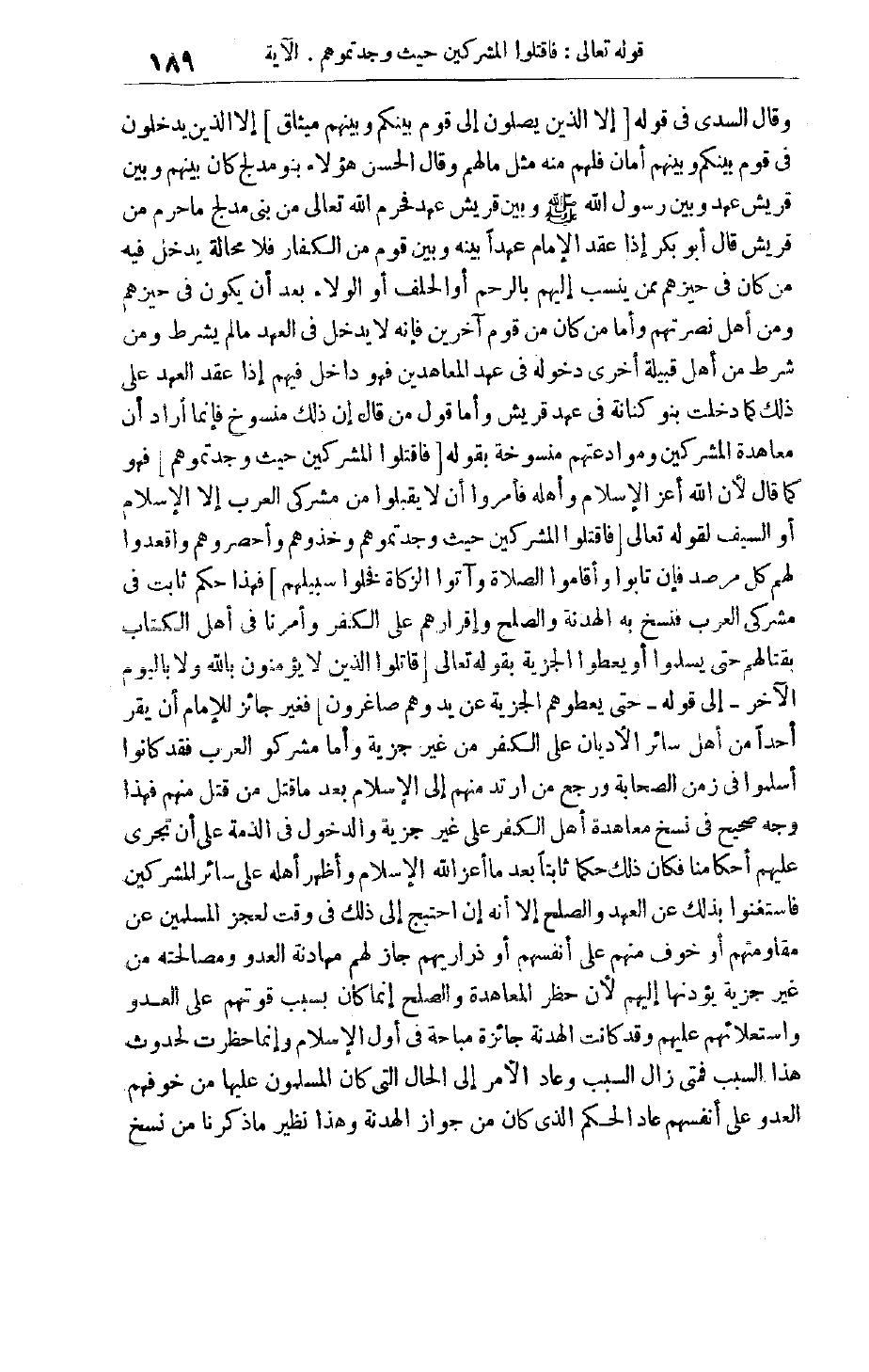 وَقَالَ السُّدِّيُّ فِي قَوْلِهِ إِلَّا الَّذِينَ يَصِلُونَ إِلى قَوْمٍ بَيْنَكُمْ وَبَيْنَهُمْ مِيثاقٌ إلَّا الَّذِينَ يَدْخُلُونَ فِي قَوْمٍ بَيْنَكُمْ وَبَيْنَهُمْ أمان فلهم منه مثل مالهم وَقَالَ الْحَسَنُ هَؤُلَاءِ بَنُو مُدْلِجٍ كَانَ بَيْنَهُمْ وَبَيْنَ قُرَيْشٍ عَهْدٌ وَبَيْنَ رَسُولِ اللَّهِ صَلَّى اللَّهُ عَلَيْهِ وَسَلَّمَ وَبَيْنَ قُرَيْشٍ عَهْدٌ فَحَرَّمَ اللَّهُ تَعَالَى مِنْ بَنِي مُدْلِجٍ مَا حَرَّمَ مِنْ قُرَيْشٍ قَالَ أَبُو بَكْرٍ إذَا عَقَدَ الْإِمَامُ عَهْدًا بَيْنَهُ وَبَيْنَ قَوْمٍ مِنْ الْكُفَّارِ فَلَا مَحَالَةَ يَدْخُلُ فِيهِ مَنْ كَانَ فِي حَيِّزِهِمْ مِمَّنْ يُنْسَبُ إلَيْهِمْ بِالرَّحِمِ أَوْ الْحِلْفِ أَوْ الْوَلَاءِ بَعْدَ أَنْ يَكُونَ فِي حَيِّزِهِمْ وَمِنْ أَهْلِ نُصْرَتِهِمْ وَأَمَّا مَنْ كَانَ مِنْ قَوْمٍ آخَرِينَ فَإِنَّهُ لَا يَدْخُلُ فِي الْعَهْدِ مَا لَمْ يَشْرِطْ وَمَنْ شَرَطَ مِنْ أَهْلِ قَبِيلَةٍ أُخْرَى دُخُولَهُ فِي عَهْدِ الْمُعَاهَدِينَ فَهُوَ دَاخِلٌ فِيهِمْ إذَا عَقَدَ الْعَهْدَ عَلَى ذَلِكَ كَمَا دَخَلَتْ بَنُو كِنَانَةَ فِي عَهْدِ قُرَيْشٍ وَأَمَّا قَوْلُ مَنْ قَالَ إنَّ ذَلِكَ مَنْسُوخٌ فَإِنَّمَا أَرَادَ أَنَّ مُعَاهَدَةَ الْمُشْرِكِينَ وَمُوَادَعَتَهُمْ مَنْسُوخَةٌ بقوله فَاقْتُلُوا الْمُشْرِكِينَ حَيْثُ وَجَدْتُمُوهُمْ فَهُوَ كَمَا قَالَ لِأَنَّ اللَّهَ أَعَزَّ الْإِسْلَامَ وَأَهْلَهُ فَأُمِرُوا أَنْ لَا يَقْبَلُوا مِنْ مُشْرِكِي الْعَرَبِ إلَّا الْإِسْلَامَ أَوْ السَّيْفَ لِقَوْلِهِ تَعَالَى فَاقْتُلُوا الْمُشْرِكِينَ حَيْثُ وَجَدْتُمُوهُمْ وَخُذُوهُمْ وَاحْصُرُوهُمْ وَاقْعُدُوا لَهُمْ كُلَّ مَرْصَدٍ فَإِنْ تابُوا وَأَقامُوا الصَّلاةَ وَآتَوُا الزَّكاةَ فَخَلُّوا سَبِيلَهُمْ فَهَذَا حُكْمٌ ثَابِتٌ فِي مُشْرِكِي الْعَرَبِ فَنَسَخَ به الهدنة والصلح وإقرارهم عَلَى الْكُفْرِ وَأَمَرَنَا فِي أَهْلِ الْكِتَابِ بِقِتَالِهِمْ حَتَّى يُسْلِمُوا أَوْ يُعْطُوا الْجِزْيَةَ بِقَوْلِهِ تَعَالَى قاتِلُوا الَّذِينَ لا يُؤْمِنُونَ بِاللَّهِ وَلا بِالْيَوْمِ الْآخِرِ- إلَى قَوْلِهِ- حَتَّى يُعْطُوا الْجِزْيَةَ عَنْ يَدٍ وَهُمْ صاغِرُونَ فَغَيْرُ جَائِزٍ لِلْإِمَامِ أَنْ يُقِرَّ أَحَدًا مِنْ أَهْلِ سَائِرِ الْأَدْيَانِ عَلَى الْكُفْرِ مِنْ غَيْرِ جِزْيَةٍ وَأَمَّا مُشْرِكُو الْعَرَبِ فَقَدْ كَانُوا أَسْلَمُوا فِي زَمَنِ الصَّحَابَةِ وَرَجَعَ مَنْ ارْتَدَّ مِنْهُمْ إلى الإسلام بعد ما قُتِلَ مَنْ قُتِلَ مِنْهُمْ فَهَذَا وَجْهٌ صَحِيحٌ فِي نَسْخِ مُعَاهَدَةِ أَهْلِ الْكُفْرِ عَلَى غَيْرِ جِزْيَةٍ وَالدُّخُولِ فِي الذِّمَّةِ عَلَى أَنْ تَجْرِيَ عليهم أحكامنا فكان ذلك حكما ثابتا بعد ما أَعَزَّ اللَّهُ الْإِسْلَامَ وَأَظْهَرَ أَهْلَهُ عَلَى سَائِرِ الْمُشْرِكِينَ فَاسْتَغْنُوا بِذَلِكَ عَنْ الْعَهْدِ وَالصُّلْحِ إلَّا أَنَّهُ إنْ اُحْتِيجَ إلَى ذَلِكَ فِي وَقْتٍ لِعَجْزِ الْمُسْلِمِينَ عَنْ مُقَاوَمَتِهِمْ أَوْ خَوْفٍ مِنْهُمْ عَلَى أَنْفُسِهِمْ أَوْ ذَرَارِيِّهِمْ جَازَ لَهُمْ مُهَادَنَةُ الْعَدُوِّ وَمُصَالَحَتِهِ مِنْ غَيْرِ جِزْيَةٍ يُؤَدُّونَهَا إلَيْهِمْ لِأَنَّ حَظْرَ الْمُعَاهَدَةِ وَالصُّلْحِ إنَّمَا كَانَ بِسَبَبِ قُوَّتِهِمْ عَلَى الْعَدُوِّ وَاسْتِعْلَائِهِمْ عَلَيْهِمْ وَقَدْ كَانَتْ الهدنة جائزة مباحة في أول الإسلام وإنما حُظِرَتْ لِحُدُوثِ هَذَا السَّبَبِ فَمَتَى زَالَ السَّبَبُ وَعَادَ الْأَمْرُ إلَى الْحَالِ الَّتِي كَانَ الْمُسْلِمُونَ عَلَيْهَا مِنْ خَوْفِهِمْ الْعَدُوَّ عَلَى أَنْفُسِهِمْ عَادَ الْحُكْمُ الَّذِي كَانَ مِنْ جَوَازِ الْهُدْنَةِ وَهَذَا نَظِيرُ مَا ذَكَرْنَا مِنْ نَسْخِ