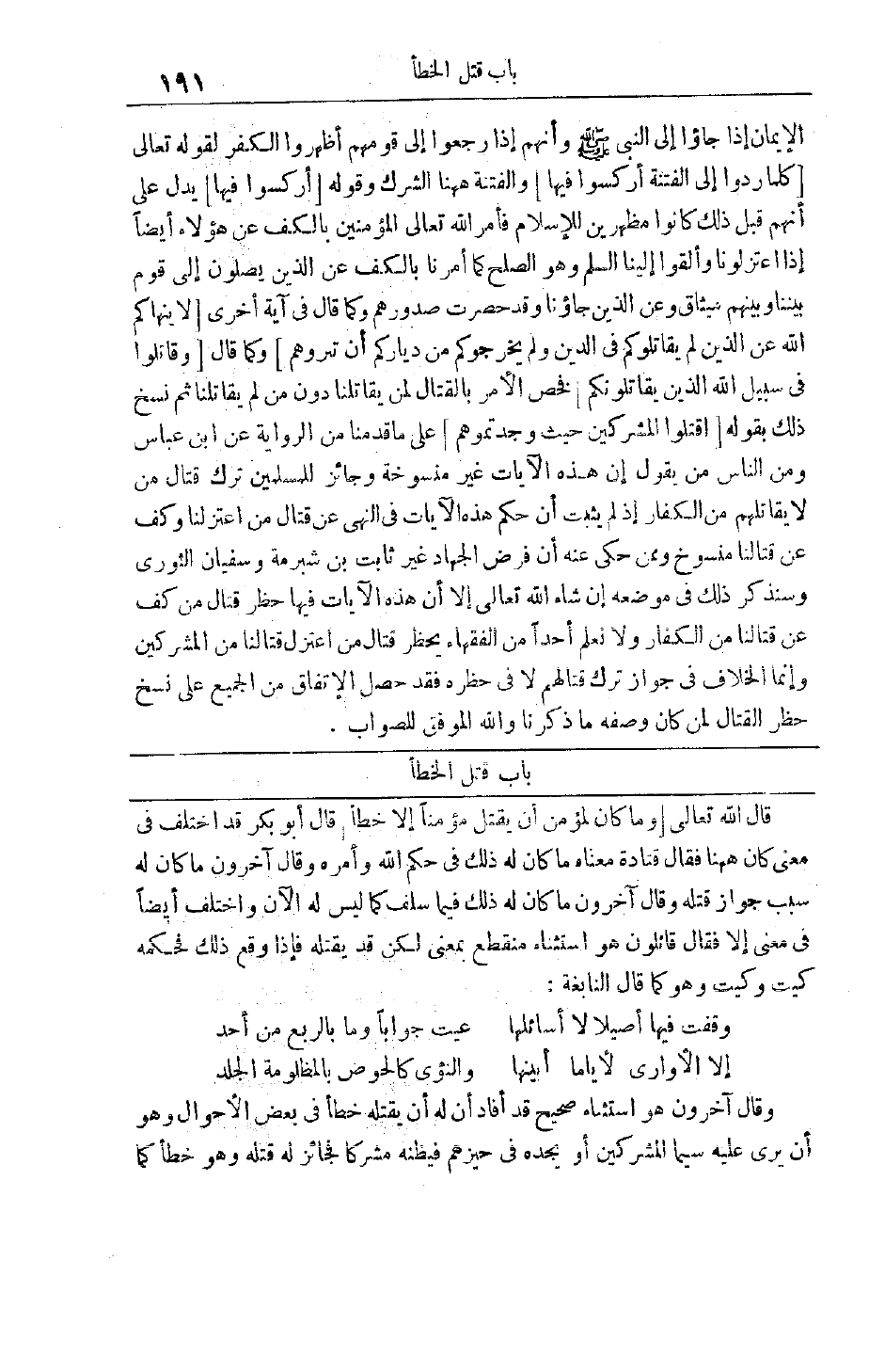 وقفت فيها أصيلا لا أُسَائِلُهَا عَيَّتْ جَوَابًا وَمَا بِالرَّبْعِ مِنْ أَحَدِ إلَّا الْأَوَارِيَ لَأْيًا مَا أُبَيِّنُهَا وَالنُّؤْيُ كَالْحَوْضِ بِالْمَظْلُومَةِ الْجَلَدِ وَقَالَ آخَرُونَ هُوَ اسْتِثْنَاءٌ صَحِيحٌ قَدْ أَفَادَ أَنَّ لَهُ أَنْ يَقْتُلَهُ خَطَأً فِي بَعْضِ الْأَحْوَالِ وَهُوَ أَنْ يَرَى عَلَيْهِ سيما المشركين أو يجده فِي حَيِّزِهِمْ فَيَظُنَّهُ مُشْرِكًا فَجَائِزٌ لَهُ قَتْلُهُ وَهُوَ خَطَأٌ كَمَا