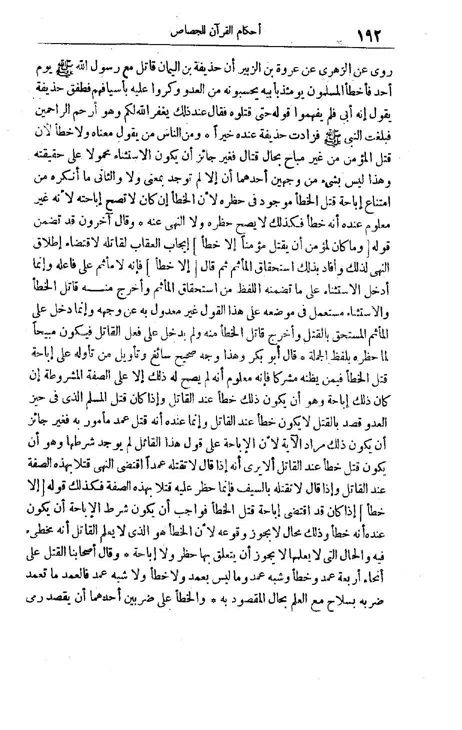 رُوِيَ عَنْ الزُّهْرِيِّ عَنْ عُرْوَةَ بْنِ الزُّبَيْرِ أَنَّ حُذَيْفَةَ بْنَ الْيَمَانِ قَاتَلَ مَعَ رَسُولِ اللَّهِ صَلَّى اللَّهُ عَلَيْهِ وَسَلَّمَ يَوْمَ أُحُدٍ فَأَخْطَأَ الْمُسْلِمُونَ يَوْمَئِذٍ بِأَبِيهِ يَحْسَبُونَهُ مِنْ الْعَدُوِّ وَكَرُّوا عَلَيْهِ بِأَسْيَافِهِمْ فَطَفِقَ حُذَيْفَةُ يَقُولُ إنَّهُ أَبِي فَلَمْ يَفْهَمُوا قَوْلَهُ حَتَّى قَتَلُوهُ فَقَالَ عِنْدَ ذَلِكَ يَغْفِرُ اللَّهُ لَكُمْ وَهُوَ أَرْحَمُ الرَّاحِمِينَ فَبَلَغَتْ النَّبِيَّ صَلَّى اللَّهُ عَلَيْهِ وَسَلَّمَ فَزَادَتْ حُذَيْفَةَ عِنْدَهُ خَيْرًا وَمِنْ النَّاسِ مَنْ يَقُولُ مَعْنَاهُ وَلَا خَطَأَ لِأَنَّ قَتْلَ الْمُؤْمِنِ من غَيْرُ مُبَاحٍ بِحَالِ قِتَالٍ فَغَيْرُ جَائِزٍ أَنْ يَكُونَ الِاسْتِثْنَاءُ مَحْمُولًا عَلَى حَقِيقَتِهِ وَهَذَا لَيْسَ بِشَيْءٍ مِنْ وَجْهَيْنِ أَحَدُهُمَا أَنَّ إلَّا لَمْ تُوجَدْ بِمَعْنَى وَلَا وَالثَّانِي مَا أَنْكَرَهُ مِنْ امْتِنَاعِ إبَاحَةِ قَتْلِ الْخَطَإِ مَوْجُودٌ فِي حَظْرِهِ لِأَنَّ الْخَطَأَ إنْ كَانَ لَا تَصِحُّ إبَاحَتُهُ لِأَنَّهُ غَيْرُ مَعْلُومٍ عِنْدَهُ أَنَّهُ خَطَأٌ فَكَذَلِكَ لَا يَصِحُّ حَظْرُهُ وَلَا النَّهْيُ عَنْهُ وَقَالَ آخَرُونَ قَدْ تَضَمَّنَ قَوْلَهُ وَما كانَ لِمُؤْمِنٍ أَنْ يَقْتُلَ مُؤْمِناً إِلَّا خَطَأً إيجَابُ الْعِقَابِ لِقَاتِلِهِ لِاقْتِضَاءِ إطْلَاقِ النَّهْيِ لِذَلِكَ وَأَفَادَ بِذَلِكَ اسْتِحْقَاقَ الْمَأْثَمِ ثُمَّ قَالَ إِلَّا خَطَأً فإنه لا مأثم على فاعله وإنما أُدْخِلَ الِاسْتِثْنَاءُ عَلَى مَا تَضَمَّنَهُ اللَّفْظُ مِنْ اسْتِحْقَاقِ الْمَأْثَمِ وَأُخْرِجَ مِنْهُ قَاتِلُ الْخَطَإِ وَالِاسْتِثْنَاءُ مُسْتَعْمَلٌ فِي مَوْضِعِهِ عَلَى هَذَا الْقَوْلِ غَيْرُ معدول به عن وجهه وإنما دَخَلَ عَلَى الْمَأْثَمِ الْمُسْتَحَقِّ بِالْقَتْلِ وَأَخْرَجَ قَاتِلَ الْخَطَإِ مِنْهُ وَلَمْ يَدْخُلْ عَلَى فِعْلِ الْقَاتِلِ فَيَكُونُ مُبِيحًا لِمَا حَظَرَهُ بِلَفْظِ الْجُمْلَةِ قَالَ أَبُو بَكْرٍ وَهَذَا وَجْهٌ صَحِيحٌ سَائِغٌ وَتَأْوِيلُ مَنْ تَأَوَّلَهُ عَلَى إبَاحَةِ قَتْلِ الْخَطَإِ فِيمَنْ يَظُنُّهُ مُشْرِكًا فَإِنَّهُ مَعْلُومٌ أَنَّهُ لَمْ يَصِحَّ لَهُ ذَلِكَ إلَّا عَلَى الصِّفَةِ الْمَشْرُوطَةِ إنْ كَانَ ذَلِكَ إبَاحَةً وَهُوَ أَنْ يَكُونَ ذَلِكَ خَطَأً عِنْدَ الْقَاتِلِ وَإِذَا كَانَ قَتْلُ الْمُسْلِمِ الَّذِي فِي حَيِّزِ الْعَدُوِّ قَصْدٌ بِالْقَتْلِ لَا يَكُونُ خَطَأً عِنْدَ الْقَاتِلِ وَإِنَّمَا عِنْدَهُ أَنَّهُ قَتْلُ عَمْدٍ مَأْمُورٍ بِهِ فَغَيْرُ جَائِزٍ أَنْ يكون ذلك مراد الآية لِأَنَّ الْإِبَاحَةَ عَلَى قَوْلِ هَذَا الْقَائِلِ لَمْ يُوجَدْ شَرْطُهَا وَهُوَ أَنْ يَكُونَ قَتْلَ خَطَأٍ عند القاتل ألا يرى أَنَّهُ إذَا قَالَ لَا تَقْتُلْهُ عَمْدًا اقْتَضَى النَّهْيَ قَتْلًا بِهَذِهِ الصِّفَةِ عِنْدَ الْقَاتِلِ وَإِذَا قَالَ لَا تَقْتُلْهُ بِالسَّيْفِ فَإِنَّمَا حَظَرَ عَلَيْهِ قَتْلًا بِهَذِهِ الصِّفَةِ فَكَذَلِكَ قَوْلُهُ إِلَّا خَطَأً إذَا كَانَ قَدْ اقْتَضَى إبَاحَةَ قَتْلِ الْخَطَإِ فَوَاجِبٌ أَنْ يَكُونَ شَرْطُ الْإِبَاحَةِ أَنْ يَكُونَ عِنْدَهُ أَنَّهُ خَطَأٌ وَذَلِكَ مُحَالٌ لَا يَجُوزُ وُقُوعُهُ لِأَنَّ الْخَطَأَ هُوَ الَّذِي لَا يَعْلَمُ الْقَاتِلُ أَنَّهُ مُخْطِئٌ فِيهِ وَالْحَالُ الَّتِي لَا يَعْلَمُهَا لَا يَجُوزُ أَنْ يَتَعَلَّقَ بِهَا حَظْرٌ وَلَا إبَاحَةٌ وَقَالَ أَصْحَابُنَا الْقَتْلُ عَلَى أَنْحَاءٍ أَرْبَعَةٍ عَمْدٌ وَخَطَأٌ وَشِبْهُ عَمْدٍ وَمَا لَيْسَ بِعَمْدٍ وَلَا خَطَأٍ وَلَا شِبْهِ عَمْدٍ فَالْعَمْدُ مَا تَعَمَّدَ ضَرْبَهُ بِسِلَاحٍ مَعَ الْعِلْمِ بِحَالِ الْمَقْصُودِ بِه