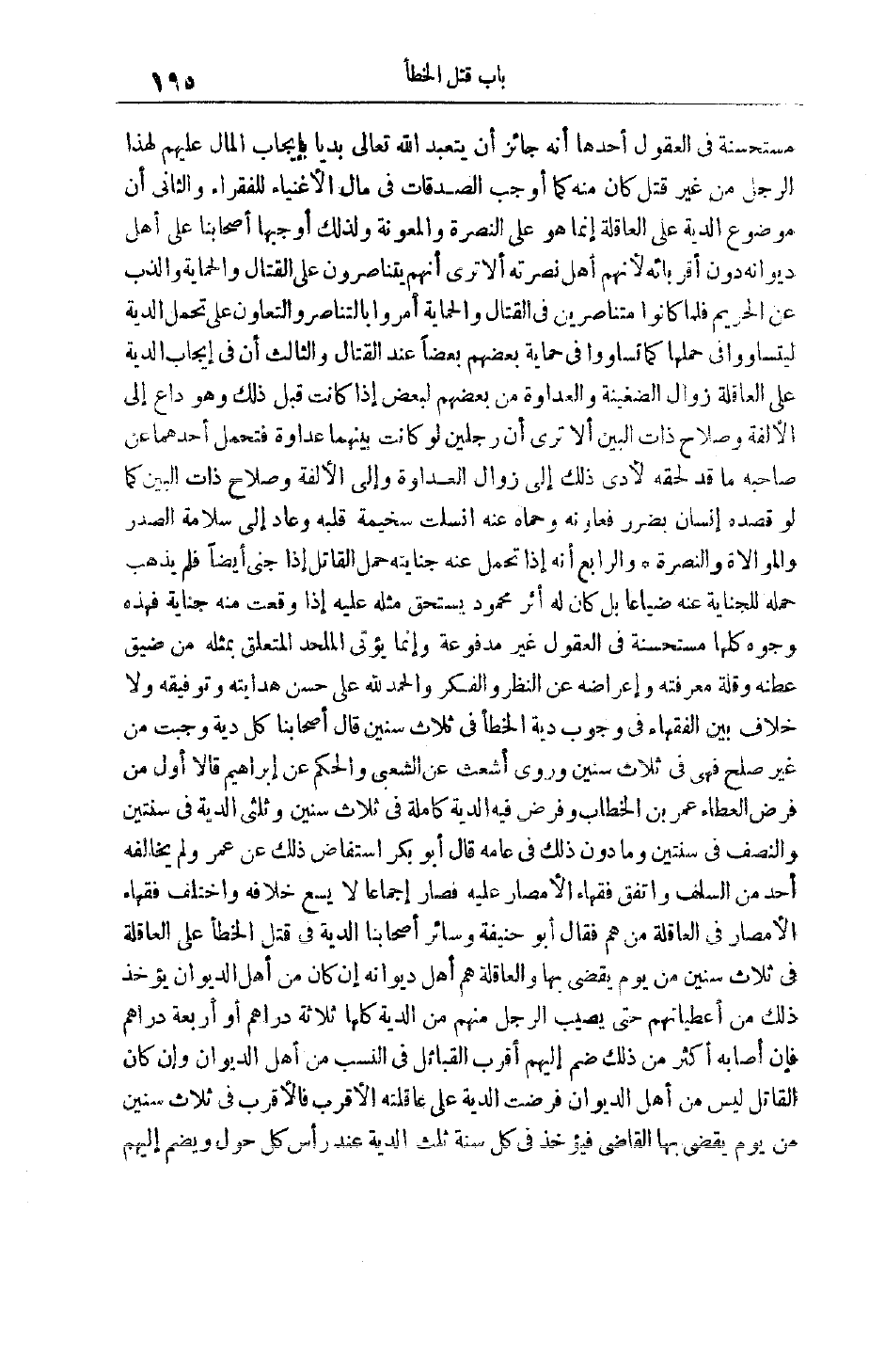 مُسْتَحْسَنَةٌ فِي الْعُقُولِ أَحَدُهَا أَنَّهُ جَائِزٌ أَنْ يتعبد الله تعالى بَدِيًّا بِإِيجَابِ الْمَالِ عَلَيْهِمْ لِهَذَا الرَّجُلِ مِنْ غَيْرِ قَتْلٍ كَانَ مِنْهُ كَمَا أَوْجَبَ الصَّدَقَاتِ فِي مَالِ الْأَغْنِيَاءِ لِلْفُقَرَاءِ وَالثَّانِي أَنَّ مَوْضُوعَ الدِّيَةِ عَلَى الْعَاقِلَةِ إنَّمَا هُوَ عَلَى النُّصْرَةِ وَالْمَعُونَةِ وَلِذَلِكَ أَوْجَبَهَا أَصْحَابُنَا عَلَى أَهْلِ دِيوَانِهِ دُونَ أَقْرِبَائِهِ لِأَنَّهُمْ أَهْلُ نُصْرَتِهِ أَلَا تَرَى أَنَّهُمْ يَتَنَاصَرُونَ عَلَى الْقِتَالِ وَالْحِمَايَةِ وَالذَّبِّ عَنْ الْحَرِيمِ فَلَمَّا كَانُوا مُتَنَاصِرِينَ فِي الْقِتَالِ وَالْحِمَايَةِ أُمِرُوا بِالتَّنَاصُرِ وَالتَّعَاوُنِ عَلَى تَحَمُّلِ الدِّيَةِ لِيَتَسَاوَوْا فِي حَمْلِهَا كَمَا تُسَاوَوْا فِي حِمَايَةِ بَعْضِهِمْ بَعْضًا عِنْدَ الْقِتَالِ وَالثَّالِثُ أَنَّ فِي إيجَابِ الدِّيَةِ عَلَى الْعَاقِلَةِ زَوَالُ الضَّغِينَةِ وَالْعَدَاوَةِ مِنْ بَعْضِهِمْ لِبَعْضٍ إذَا كَانَتْ قَبْلَ ذَلِكَ وَهُوَ دَاعٍ إلَى الْأُلْفَةِ وَصَلَاحِ ذَاتِ الْبَيْنِ أَلَا تَرَى أَنَّ رَجُلَيْنِ لَوْ كَانَتْ بَيْنَهُمَا عَدَاوَةٌ فَتَحَمَّلَ أَحَدُهُمَا عَنْ صَاحِبِهِ مَا قَدْ لَحِقَهُ لَأَدَّى ذَلِكَ إلَى زَوَالِ الْعَدَاوَةِ وَإِلَى الْأُلْفَةِ وَصَلَاحِ ذَاتِ الْبَيْنِ كَمَا لَوْ قَصَدَهُ إنْسَانٌ بِضَرَرٍ فَعَاوَنَهُ وَحَمَاهُ عَنْهُ انْسَلَّتْ سَخِيمَةُ قَلْبِهِ وَعَادَ إلَى سَلَامَةِ الصَّدْرِ وَالْمُوَالَاةِ وَالنُّصْرَةِ وَالرَّابِعُ أنه إذا تحمل عنه جنايته حمل الْقَاتِلُ إذَا جَنَى أَيْضًا فَلَمْ يَذْهَبْ حَمْلُهُ لِلْجِنَايَةِ عَنْهُ ضَيَاعًا بَلْ كَانَ لَهُ أَثَرٌ مَحْمُودٌ يُسْتَحَقُّ مِثْلُهُ عَلَيْهِ إذَا وَقَعَتْ مِنْهُ جِنَايَةٌ فَهَذِهِ وُجُوهٌ كُلُّهَا مُسْتَحْسَنَةٌ فِي الْعُقُولِ غَيْرُ مَدْفُوعَةٍ وَإِنَّمَا يُؤْتَى الْمُلْحِدُ الْمُتَعَلِّقُ بِمِثْلِهِ من ضيق عطنه وقلة معرفته وإعراضه عن النظر والكفر وَالْحَمْدُ لِلَّهِ عَلَى حُسْنِ هِدَايَتِهِ وَتَوْفِيقِهِ وَلَا خِلَافَ بَيْنَ الْفُقَهَاءِ فِي وُجُوبِ دِيَةِ الْخَطَإِ فِي ثَلَاثِ سِنِينَ قَالَ أَصْحَابُنَا كُلُّ دِيَةٍ وَجَبَتْ مِنْ غَيْرِ صُلْحٍ فَهِيَ فِي ثَلَاثِ سِنِينَ وَرَوَى أَشْعَثُ عَنْ الشُّعَبِيِّ وَالْحَكَمُ عَنْ إبْرَاهِيمَ قَالَا أَوَّلُ مَنْ فَرَضَ الْعَطَاءَ عُمَرُ بْنُ الْخَطَّابِ وَفَرَضَ فِيهِ الدِّيَةَ كَامِلَةً فِي ثَلَاثِ سِنِينَ وَثُلُثَيْ الدِّيَةِ فِي سَنَتَيْنِ وَالنِّصْفُ فِي سَنَتَيْنِ وَمَا دُونَ ذَلِكَ فِي عَامِهِ قَالَ أَبُو بَكْرٍ اسْتَفَاضَ ذَلِكَ عَنْ عُمَرَ وَلَمْ يُخَالِفْهُ أَحَدٌ مِنْ السَّلَفِ وَاتَّفَقَ فُقَهَاءُ الْأَمْصَارِ عَلَيْهِ فَصَارَ إجْمَاعًا لَا يَسَعُ خِلَافُهُ وَاخْتَلَفَ فُقَهَاءُ الْأَمْصَارِ فِي الْعَاقِلَةِ مَنْ هُمْ فَقَالَ أَبُو حَنِيفَةَ وَسَائِرُ أَصْحَابِنَا الدِّيَةُ فِي قَتْلِ الْخَطَإِ عَلَى الْعَاقِلَةِ فِي ثَلَاثِ سِنِينَ مِنْ يَوْمِ يُقْضَى بِهَا وَالْعَاقِلَةُ هُمْ أَهْلُ دِيوَانِهِ إنْ كَانَ مِنْ أَهْلِ الدِّيوَانِ يُؤْخَذُ ذَلِكَ مِنْ أُعْطِيَّاتِهِمْ حَتَّى يُصِيبَ الرَّجُلُ مِنْهُمْ مِنْ الدِّيَةِ كُلِّهَا ثَلَاثَةَ دَرَاهِمَ أَوْ أَرْبَعَةَ دَرَاهِمَ فَإِنْ أَصَابَهُ أَكْثَرُ مِنْ ذَلِكَ ضُمَّ إلَيْهِمْ أَقْرَبُ الْقَبَائِلِ فِي النَّسَبِ مِنْ أَهْلِ الدِّيوَانِ وَإِنْ كَانَ الْقَاتِلُ لَيْسَ مِنْ أَهْلِ الدِّيوَانِ فُرِضَتْ الدِّيَةُ عَلَى عَاقِلَتِهِ الْأَقْرَبُ فَالْأَقْرَبُ في ثلاث سنين من يوم يقضى بها الْقَاضِي فَيُؤْخَذُ فِي كُلِّ سَنَةٍ ثُلُثُ الدِّيَةِ عِنْدَ رَأْسِ كُلِّ حَوْلٍ وَيَضُمُّ إ