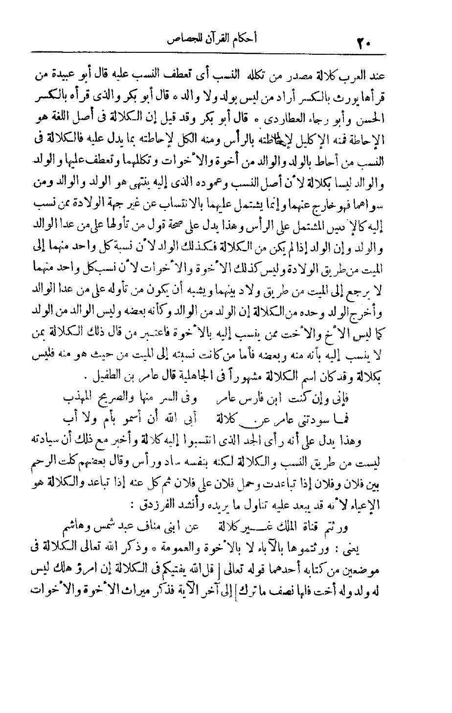 فَإِنِّي وَإِنْ كُنْت ابْنَ فَارِسِ عَامِرٍ وَفِي السِّرِّ مِنْهَا وَالصَّرِيحِ الْمُهَذَّبِ فَمَا سَوَّدَتْنِي عَامِرٌ عَنْ كَلَالَةٍ أَبَى اللَّهُ أَنْ أَسْمُوَ بِأُمٍّ وَلَا أَبِ وَهَذَا يَدُلُّ عَلَى أَنَّهُ رَأَى الْجَدَّ الَّذِي انْتَسَبُوا إلَيْهِ كَلَالَةً وَأَخْبَرَ مَعَ ذَلِكَ أَنَّ سِيَادَتَهُ لَيْسَتْ مِنْ طَرِيقِ النَّسَبِ وَالْكَلَالَةِ لَكِنَّهُ بِنَفْسِهِ سَادَ وَرَأَسَ وَقَالَ بَعْضُهُمْ كَلَّتْ الرَّحِمُ بَيْنَ فُلَانٍ وَفُلَانٍ إذَا تَبَاعَدَتْ وَحَمَلَ فُلَانٌ عَلَى فُلَانٍ ثُمَّ كل عنه إذا تباعد والكلالة هُوَ الْإِعْيَاءُ لِأَنَّهُ قَدْ يَبْعُدُ عَلَيْهِ تَنَاوُلُ مَا يُرِيدُهُ وَأَنْشَدَ الْفَرَزْدَقُ: