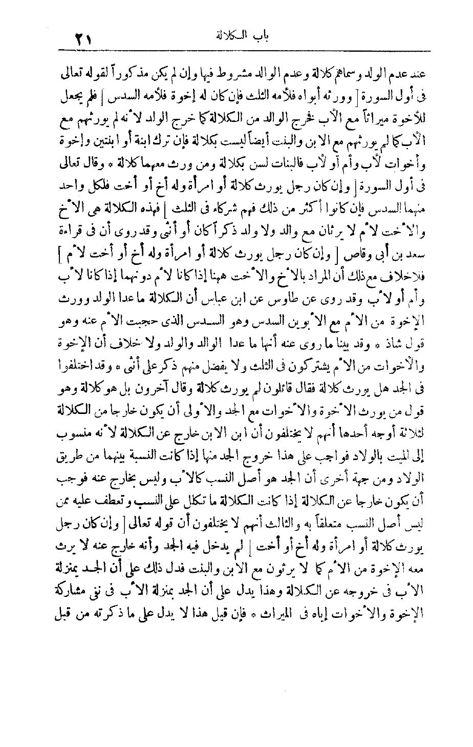 فَهَذِهِ الْكَلَالَةُ هِيَ الْأَخُ وَالْأُخْت لِأُمٍّ لَا يَرِثَانِ مَعَ وَالِدٍ وَلَا وَلَدِ ذَكَرًا كَانَ أَوْ أُنْثَى وَقَدْ رُوِيَ أَنَّ فِي قِرَاءَةِ سَعْدِ بْنِ أَبِي وَقَّاصٍ [وَإِنْ كَانَ رَجُلٌ يورث كلالة أو امرأة وله أخ أو أُخْتٌ لِأُمٍّ] فَلَا خِلَافَ مَعَ ذَلِكَ أَنَّ المراد بالأخ والأخت هاهنا إذا كانا لأم دونهما إذا كانا لِأَبٍ وَأُمٍّ أَوْ لِأَبٍ وَقَدْ رُوِيَ عَنْ طَاوُسٍ عَنْ ابْنِ عَبَّاسٍ أَنَّ الْكَلَالَةَ مَا عَدَا الْوَلَدَ وَوَرِثَ الْإِخْوَةُ مِنْ الْأُمِّ مَعَ الْأَبَوَيْنِ السُّدُسَ وَهُوَ السُّدُسُ الَّذِي حُجِبَتْ الْأُمُّ عَنْهُ وَهُوَ قَوْلٌ شَاذٌّ وَقَدْ بَيَّنَّا مَا رُوِيَ عَنْهُ أَنَّهَا مَا عَدَا الْوَالِدَ وَالْوَلَدَ وَلَا خِلَافَ أَنَّ الْإِخْوَةَ وَالْأَخَوَاتِ مِنْ الْأُمِّ يَشْتَرِكُونَ فِي الثُّلُثِ وَلَا يَفْضُلُ مِنْهُمْ ذَكَرٌ عَلَى أُنْثَى وَقَدْ اخْتَلَفُوا فِي الْجَدِّ هَلْ يُوَرَّثُ كَلَالَةً فَقَالَ قَائِلُونَ لَمْ يُوَرَّثْ كَلَالَةً وَقَالَ آخَرُونَ بَلْ هُوَ كَلَالَةٌ وَهُوَ قَوْلُ مَنْ يُوَرِّثُ الْإِخْوَةَ وَالْأَخَوَاتِ مَعَ الْجَدِّ وَالْأَوْلَى أَنْ يَكُونَ خَارِجًا مِنْ الْكَلَالَةِ لِثَلَاثَةِ أَوْجُهٍ أَحَدُهَا أَنَّهُمْ لَا يَخْتَلِفُونَ أَنَّ ابْنَ الِابْنِ خَارِجٌ عَنْ الْكَلَالَةِ لِأَنَّهُ مَنْسُوبٌ إلَى الْمَيِّتِ بِالْوِلَادِ فَوَاجِبٌ عَلَى هَذَا خُرُوجُ الْجَدِّ مِنْهَا إذا كَانَتْ النِّسْبَةُ بَيْنَهُمَا مِنْ طَرِيقِ الْوِلَادِ وَمِنْ جِهَةٍ أُخْرَى أَنَّ الْجَدَّ هُوَ أَصْلُ النَّسَبِ كَالْأَبِ وَلَيْسَ بِخَارِجٍ عَنْهُ فَوَجَبَ أَنْ يَكُونَ خارجا عن الكلالة إذا كَانَتْ الْكَلَالَةُ مَا تُكَلَّلُ عَلَى النَّسَبِ وَتُعْطَفُ عَلَيْهِ مِمَّنْ لَيْسَ أَصْلُ النَّسَبِ مُتَعَلِّقًا بِهِ وَالثَّالِثُ أَنَّهُمْ لَا يَخْتَلِفُونَ أَنَّ قَوْله تَعَالَى وَإِنْ كانَ رَجُلٌ يُورَثُ كَلالَةً أَوِ امْرَأَةٌ وَلَهُ أَخٌ أَوْ أُخْتٌ لَمْ يَدْخُلْ فِيهِ الْجَدُّ وَأَنَّهُ خَارِجٌ عَنْهُ لَا يَرِثُ مَعَهُ الْإِخْوَةُ مِنْ الْأُمِّ كَمَا لَا يَرِثُونَ مَعَ الِابْنِ وَالْبِنْتِ فَدَلَّ ذَلِكَ عَلَى أَنَّ الْجَدَّ بِمَنْزِلَةِ الْأَبِ فِي خُرُوجِهِ عَنْ الْكَلَالَةِ وَهَذَا يَدُلُّ عَلَى أَنَّ الْجَدَّ بِمَنْزِلَةِ الْأَبِ فِي نَفْيِ مُشَارَكَةِ الْإِخْوَةِ وَالْأَخَوَاتِ إيَّاهُ فِي الْمِيرَاثِ فَإِنْ قِيلَ هَذَا لَا يَدُلُّ عَلَى مَا ذَكَرْته مِنْ قِبَلِ