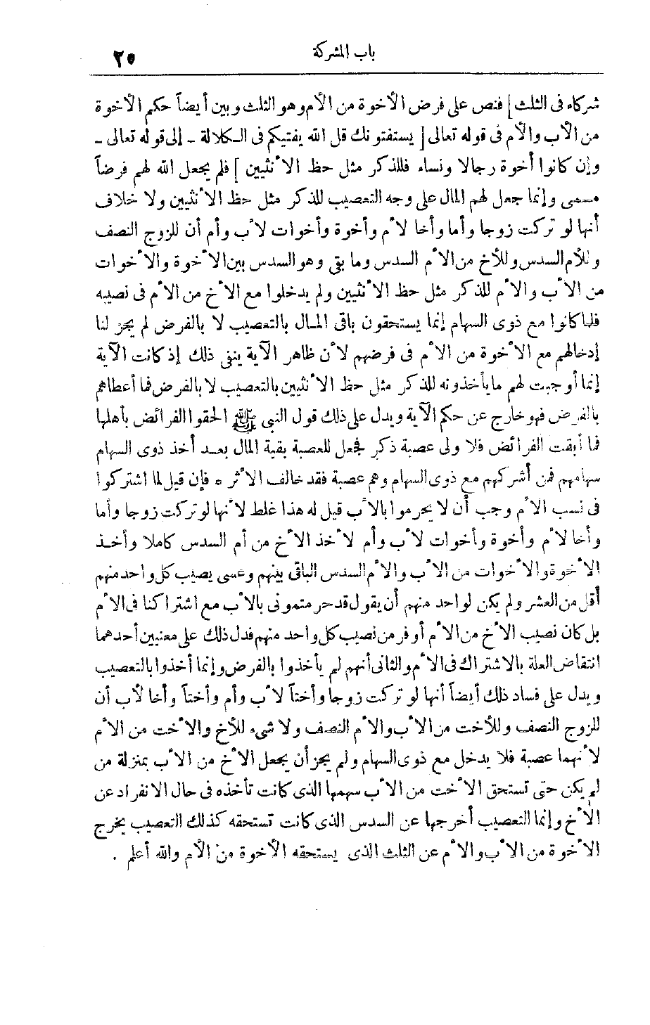 فَجَعَلَ لِلْعَصَبَةِ بَقِيَّةَ الْمَالِ بَعْدَ أَخْذِ ذَوِي السِّهَامِ سِهَامَهُمْ فَمَنْ أَشْرَكَهُمْ مَعَ ذَوِي السِّهَامِ وَهُمْ عَصَبَةٌ فَقَدْ خَالَفَ الْأَثَرَ فَإِنْ قِيلَ لَمَّا اشْتَرَكُوا فِي نَسَبِ الْأُمِّ وَجَبَ أَنْ لَا يُحْرَمُوا بِالْأَبِ قِيلَ لَهُ هَذَا غَلَطٌ لِأَنَّهَا لَوْ تَرَكَتْ زَوْجًا وَأُمًّا وأخا لأم وأخوة وأخوات لأب وأم لأخذ الأخ من أم السُّدُسَ كَامِلًا وَأَخَذَ الْإِخْوَةُ وَالْأَخَوَاتُ مِنْ الْأَبِ وَالْأُمِّ السُّدُسَ الْبَاقِيَ بَيْنَهُمْ وَعَسَى يُصِيبُ كُلُّ وَاحِدٍ مِنْهُمْ أَقَلَّ مِنْ الْعُشْرِ وَلَمْ يَكُنْ لِوَاحِدٍ مِنْهُمْ أَنْ يَقُولَ قَدْ حَرَمْتُمُونِي بِالْأَبِ مَعَ اشْتِرَاكِنَا فِي الْأُمِّ بَلْ كَانَ نَصِيبُ الْأَخِ مِنْ الْأُمِّ أَوْفَرَ مِنْ نَصِيبِ كُلِّ وَاحِدٍ مِنْهُمْ فَدَلَّ ذَلِكَ عَلَى مَعْنَيَيْنِ أَحَدُهُمَا انْتِقَاضُ الْعِلَّةِ بِالِاشْتِرَاكِ فِي الْأُمِّ وَالثَّانِي أَنَّهُمْ لَمْ يَأْخُذُوا بِالْفَرْضِ وَإِنَّمَا أَخَذُوا بِالتَّعْصِيبِ وَيَدُلُّ عَلَى فَسَادِ ذَلِكَ أَيْضًا أَنَّهَا لَوْ تَرَكَتْ زَوْجًا وَأُخْتًا لِأَبٍ وَأُمٍّ وَأُخْتًا وَأَخًا لِأَبٍ أَنَّ لِلزَّوْجِ النِّصْفَ وَلِلْأُخْتِ مِنْ الْأَبِ وَالْأُمِّ النصف ولا شيء للأخ والأخت من الأم لِأَنَّهُمَا عَصَبَةٌ فَلَا يُدْخَلُ مَعَ ذَوِي السِّهَامِ ولم يجز أن يجعل الأخ مِنْ الْأَبِ بِمَنْزِلَةِ مَنْ لَمْ يَكُنْ حَتَّى تَسْتَحِقَّ الْأُخْتُ مِنْ الْأَبِ سَهْمَهَا الَّذِي كَانَتْ تَأْخُذُهُ فِي حَالِ الِانْفِرَادِ عَنْ الْأَخِ وَإِنَّمَا التَّعْصِيبُ أَخْرَجَهَا عَنْ السُّدُسِ الَّذِي كَانَتْ تَسْتَحِقُّهُ كَذَلِكَ التَّعْصِيبُ يُخْرِجُ الْإِخْوَةَ مِنْ الْأَبِ وَالْأُمِّ عَنْ الثُّلُثِ الَّذِي يَسْتَحِقُّهُ الْإِخْوَةُ مِنْ الْأُمِّ والله أعلم.
