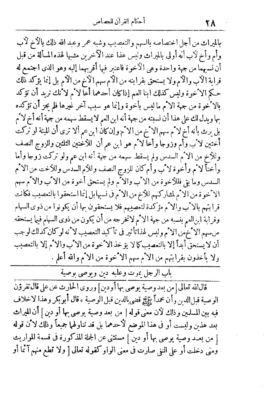 قَالَ أَبُو بَكْرٍ وَهَذَا لَا خِلَافَ فِيهِ بَيْنَ الْمُسْلِمِينَ وَذَلِكَ لِأَنَّ مَعْنَى قَوْلِهِ مِنْ بَعْدِ وَصِيَّةٍ يُوصِي بِها أَوْ دَيْنٍ أَنَّ الْمِيرَاثَ بَعْدَ هَذَيْنِ وَلَيْسَتْ أَوْ فِي هذا الموضع لأحدهما بل قد تناولهما جَمِيعًا وَذَلِكَ لِأَنَّ قَوْلَهُ مِنْ بَعْدِ وَصِيَّةٍ يُوصِي بِها أَوْ دَيْنٍ مُسْتَثْنًى عَنْ الْجُمْلَةِ الْمَذْكُورَةِ فِي قِسْمَةِ الْمَوَارِيثِ وَمَتَى دَخَلَتْ أَوْ عَلَى النَّفْيِ صَارَتْ فِي مَعْنَى الْوَاوِ كَقَوْلِهِ تَعَالَى وَلا تُطِعْ مِنْهُمْ آثِماً أَوْ