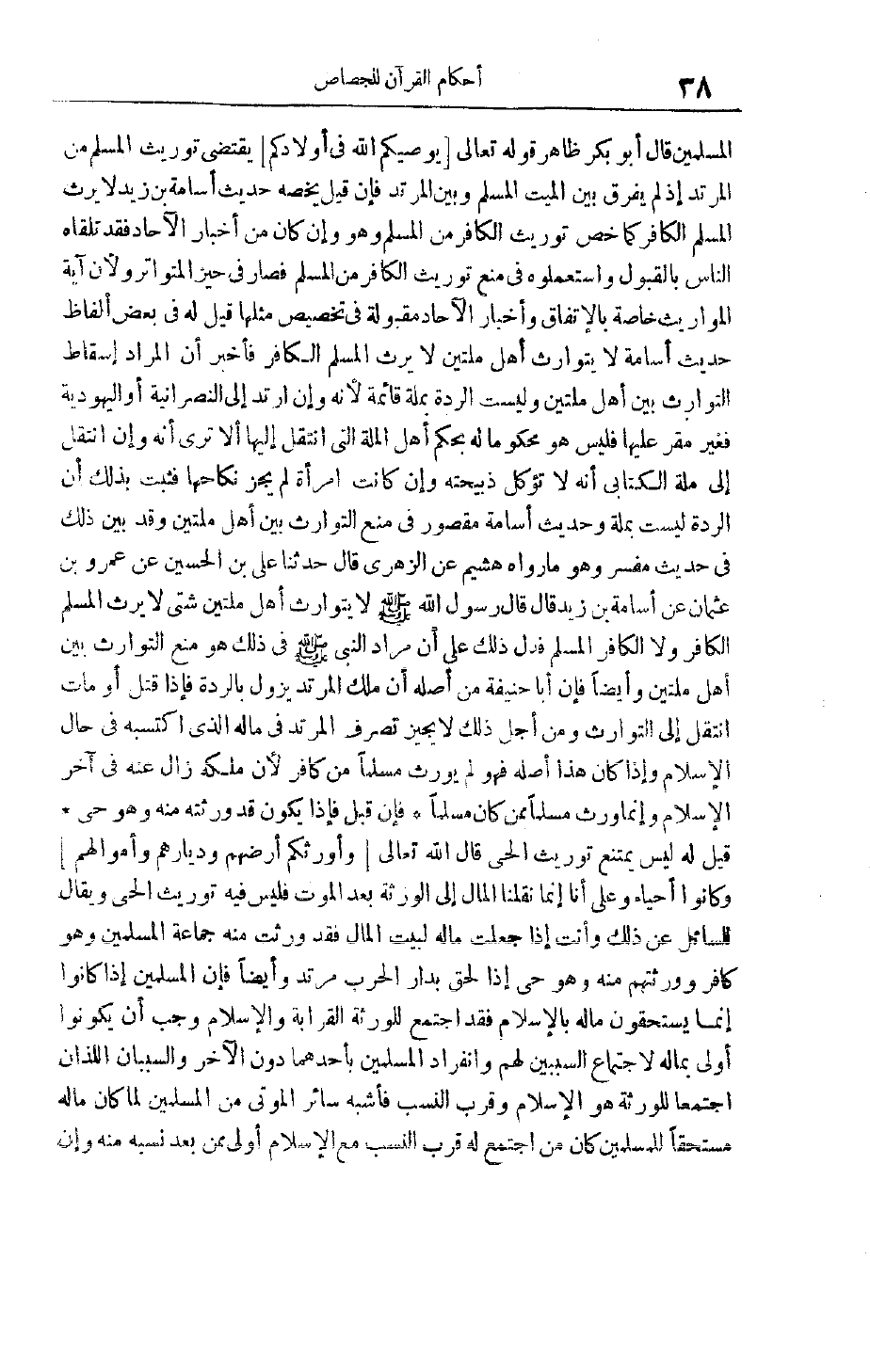 الْمُسْلِمِينَ قَالَ أَبُو بَكْرٍ ظَاهِرُ قَوْله تَعَالَى يُوصِيكُمُ اللَّهُ فِي أَوْلادِكُمْ يَقْتَضِي تَوْرِيثَ الْمُسْلِمِ مِنْ الْمُرْتَدِّ إذْ لَمْ يُفَرِّقْ بَيْنَ الْمَيِّتِ الْمُسْلِمِ وَبَيْنَ الْمُرْتَدِّ فَإِنْ قِيلَ يَخُصُّهُ حَدِيثُ أُسَامَةَ بْنِ زَيْدٍ لَا يَرِثُ الْمُسْلِمُ الْكَافِرَ كَمَا خَصَّ تَوْرِيثَ الْكَافِرِ مِنْ الْمُسْلِمِ وَهُوَ وَإِنْ كَانَ مِنْ أَخْبَارِ الْآحَادِ فَقَدْ تَلَقَّاهُ النَّاسُ بِالْقَبُولِ وَاسْتَعْمَلُوهُ فِي مَنْعِ تَوْرِيثِ الْكَافِرِ مِنْ الْمُسْلِمِ فَصَارَ فِي حَيِّزِ الْمُتَوَاتِرِ وَلِأَنَّ آيَةَ الْمَوَارِيثِ خَاصَّةً بِالِاتِّفَاقِ وَأَخْبَارُ الْآحَادِ مَقْبُولَةٌ فِي تَخْصِيصِ مِثْلِهَا قِيلَ لَهُ فِي بَعْضِ أَلْفَاظِ حَدِيثِ أُسَامَةَ لَا يَتَوَارَثُ أَهْلُ مِلَّتَيْنِ لَا يَرِثُ الْمُسْلِمُ الْكَافِرَ فَأَخْبَرَ أَنَّ الْمُرَادَ إسْقَاطُ التَّوَارُثِ بَيْنَ أَهْلِ مِلَّتَيْنِ وَلَيْسَتْ الرِّدَّةُ بِمِلَّةٍ قَائِمَةٍ لِأَنَّهُ وَإِنْ ارْتَدَّ إلَى النَّصْرَانِيَّةِ أَوْ الْيَهُودِيَّةِ فَغَيْرُ مُقِرٍّ عَلَيْهَا فَلَيْسَ هُوَ مَحْكُومًا لَهُ بِحُكْمِ أَهْلِ الْمِلَّةِ الَّتِي انْتَقَلَ إلَيْهَا أَلَا تَرَى أَنَّهُ وَإِنْ انْتَقَلَ إلَى مِلَّةِ الْكِتَابِيِّ أَنَّهُ لَا تُؤْكَلُ ذَبِيحَتُهُ وَإِنْ كَانَتْ امْرَأَةً لَمْ يَجُزْ نِكَاحُهَا فَثَبَتَ بِذَلِكَ أَنَّ الرِّدَّةَ لَيْسَتْ بِمِلَّةٍ وَحَدِيثُ أُسَامَةَ مَقْصُورٌ فِي مَنْعِ التَّوَارُثِ بَيْنَ أَهْلِ مِلَّتَيْنِ وَقَدْ بَيَّنَ ذَلِكَ