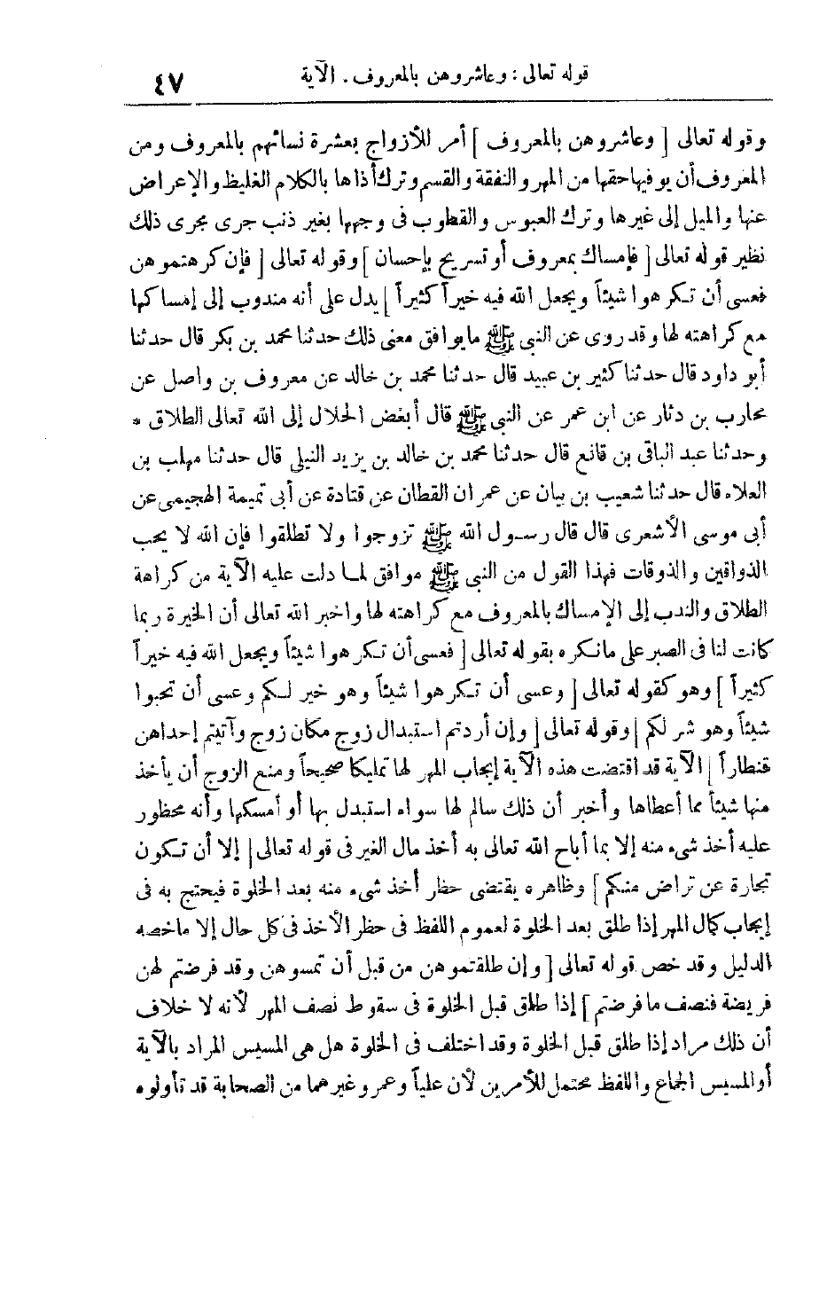 وقوله تعالى وَعاشِرُوهُنَّ بِالْمَعْرُوفِ أَمْرٌ لِلْأَزْوَاجِ بِعِشْرَةِ نِسَائِهِمْ بِالْمَعْرُوفِ وَمِنْ الْمَعْرُوف أَنْ يُوفِيَهَا حَقَّهَا مِنْ الْمَهْرِ وَالنَّفَقَةِ وَالْقَسْمِ وَتَرْكِ أَذَاهَا بِالْكَلَامِ الْغَلِيظِ وَالْإِعْرَاضُ عَنْهَا وَالْمَيْلُ إلَى غَيْرِهَا وَتَرْكِ الْعُبُوسِ وَالْقُطُوبِ فِي وَجْهِهَا بغير ذنب جرى مجرى ذلك نَظِيرُ قَوْله تَعَالَى فَإِمْساكٌ بِمَعْرُوفٍ أَوْ تَسْرِيحٌ بِإِحْسانٍ وقَوْله تَعَالَى فَإِنْ كَرِهْتُمُوهُنَّ فَعَسى أَنْ تَكْرَهُوا شَيْئاً وَيَجْعَلَ اللَّهُ فِيهِ خَيْراً كَثِيراً يَدُلُّ عَلَى أَنَّهُ مَنْدُوبٌ إلَى إمْسَاكِهَا مَعَ كراهته لَهَا وَقَدْ رُوِيَ عَنْ النَّبِيِّ صَلَّى اللَّهُ عَلَيْهِ وَسَلَّمَ مَا يُوَافِقُ مَعْنَى ذَلِكَ