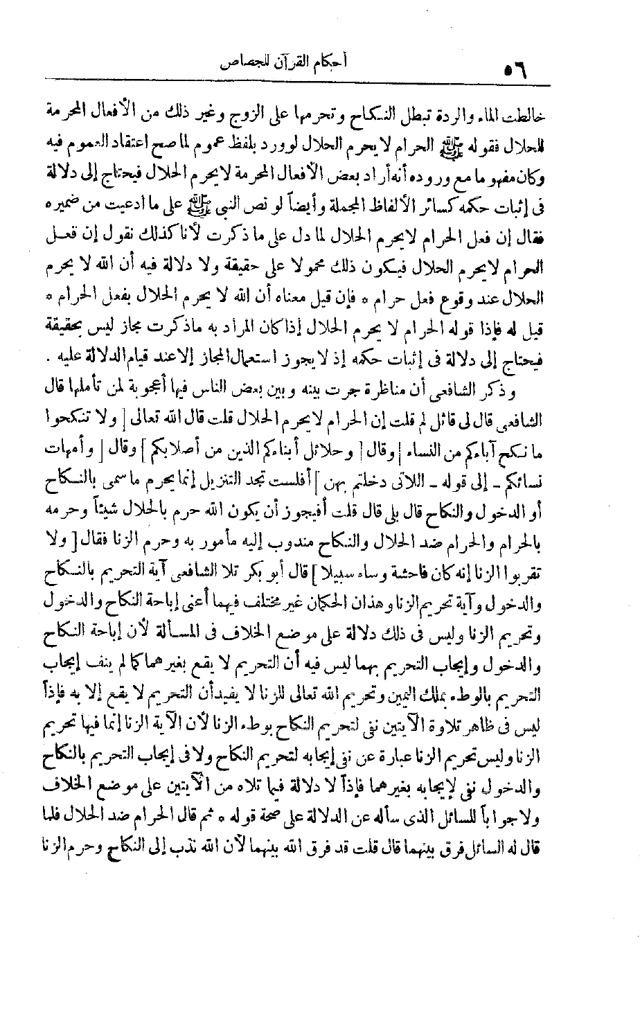وَذَكَرَ الشَّافِعِيُّ أَنْ مُنَاظَرَةً جَرَتْ بَيْنَهُ وَبَيْنَ بَعْضِ النَّاسِ فِيهَا أُعْجُوبَةٌ لِمَنْ تَأَمَّلَهَا قَالَ الشَّافِعِيُّ قَالَ لِي قَائِلٌ لِمَ قُلْت إنَّ الْحَرَامَ لَا يُحَرِّمُ الْحَلَالَ قُلْت قَالَ اللَّهُ تَعَالَى وَلا تَنْكِحُوا مَا نَكَحَ آباؤُكُمْ مِنَ النِّساءِ وقال وَحَلائِلُ أَبْنائِكُمُ الَّذِينَ مِنْ أَصْلابِكُمْ وقال وَأُمَّهاتُ نِسائِكُمْ- إلى قوله- اللَّاتِي دَخَلْتُمْ بِهِنَّ أَفْلَسْت تَجِدُ التَّنْزِيلَ إنَّمَا يُحَرِّمُ مَا سُمِّيَ بِالنِّكَاحِ أَوْ الدُّخُولِ وَالنِّكَاحِ قَالَ بَلَى قَالَ قُلْت أَفَيَجُوزُ أَنْ يَكُونَ اللَّهُ حَرَّمَ بِالْحَلَالِ شَيْئًا وَحَرَّمَهُ بِالْحَرَامِ وَالْحَرَامُ ضِدُّ الْحَلَالِ وَالنِّكَاحُ مَنْدُوبٌ إلَيْهِ مَأْمُورٌ بِهِ وَحَرَّمَ الزِّنَا فَقَالَ وَلا تَقْرَبُوا الزِّنى إِنَّهُ كانَ فاحِشَةً وَساءَ سَبِيلًا قَالَ أَبُو بَكْرٍ تَلَا الشَّافِعِيُّ آيَةَ التَّحْرِيمِ بِالنِّكَاحِ وَالدُّخُولِ وَآيَةَ تَحْرِيمِ الزِّنَا وَهَذَانِ الْحُكْمَانِ غَيْرُ مُخْتَلَفٍ فِيهِمَا أَعْنِي إبَاحَةَ النِّكَاحِ وَالدُّخُولِ وَتَحْرِيمَ الزِّنَا وَلَيْسَ فِي ذَلِكَ دَلَالَةٌ عَلَى مَوْضِعِ الْخِلَافِ فِي الْمَسْأَلَةِ لِأَنَّ إبَاحَةَ النِّكَاحِ وَالدُّخُولِ وَإِيجَابِ التَّحْرِيمِ بِهِمَا لَيْسَ فِيهِ أَنَّ التَّحْرِيمَ لَا يَقَعُ بِغَيْرِهِمَا كَمَا لَمْ يَنْفِ إيجَابَ التَّحْرِيمِ بِالْوَطْءِ بِمِلْكِ الْيَمِينِ وَتَحْرِيمُ اللَّهِ تَعَالَى لِلزِّنَا لَا يُفِيدُ أَنَّ التَّحْرِيمَ لَا يَقَعُ إلَّا بِهِ فَإِذًا لَيْسَ فِي ظَاهِرِ تِلَاوَةِ الْآيَتَيْنِ نَفْيٌ لِتَحْرِيمِ النِّكَاحِ بِوَطْءِ الزِّنَا لأن الآية الزِّنَا إنَّمَا فِيهَا تَحْرِيمُ الزِّنَا وَلَيْسَ تَحْرِيمُ الزِّنَا عِبَارَةً عَنْ نَفْيِ إيجَابِهِ لِتَحْرِيمِ النِّكَاحِ وَلَا فِي إيجَابِ التَّحْرِيمِ بِالنِّكَاحِ وَالدُّخُولِ نَفْيٌ لِإِيجَابِهِ بِغَيْرِهِمَا فَإِذًا لَا دَلَالَةَ فِيمَا تَلَاهُ مِنْ الْآيَتَيْنِ عَلَى مَوْضِعِ الْخِلَافِ وَلَا جَوَابًا لِلسَّائِلِ الَّذِي سَأَلَهُ عَنْ الدَّلَالَةِ عَلَى صِحَّةِ قَوْلِهِ ثُمَّ قَالَ الْحَرَامُ ضِدُّ الْحَلَالِ فَلَمَّا قَالَ لَهُ السَّائِلُ فَرِّقْ بَيْنَهُمَا قَالَ قُلْت قَدْ فَرَّقَ اللَّهُ بَيْنَهُمَا لِأَنَّ اللَّهَ نَدَبَ إلَى النِّكَاحِ وَحَرَّمَ الزِّنَا