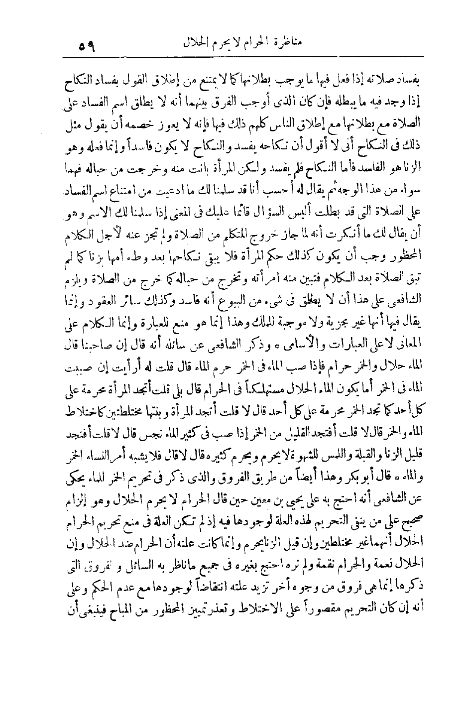 لَا قُلْت أَفَتَجِدُ الْقَلِيلَ مِنْ الْخَمْرِ إذَا صُبَّ فِي كَثِيرِ الْمَاءِ نَجِسَ قَالَ لَا قُلْت أَفَتَجِدُ قَلِيلَ الزِّنَا وَالْقُبْلَةَ وَاللَّمْسَ لِلشَّهْوَةِ لَا يَحْرُمُ وَيَحْرُمُ كَثِيرُهُ قَالَ لَا قَالَ فَلَا يُشْبِهُ أَمْرُ النِّسَاءِ الْخَمْرَ وَالْمَاءَ قَالَ أَبُو بَكْرٍ وَهَذَا أَيْضًا مِنْ طَرِيقِ الْفُرُوقِ وَاَلَّذِي ذُكِرَ فِي تَحْرِيمِ الْخَمْرِ لِلْمَاءِ يُحْكَى عَنْ الشَّافِعِيِّ أَنَّهُ احْتَجَّ بِهِ عَلَى يَحْيَى بْنِ مَعِينٍ حِينَ قَالَ الْحَرَامُ لَا يُحَرِّمُ الْحَلَالَ وَهُوَ إلْزَامٌ صَحِيحٌ عَلَى مَنْ يَنْفِي التَّحْرِيمَ لِهَذِهِ الْعِلَّةِ لِوُجُودِهَا فِيهِ إذْ لَمْ تَكُنْ الْعِلَّةُ فِي مَنْعِ تَحْرِيمِ الْحَرَامِ الْحَلَالَ أَنَّهُمَا غَيْرُ مختلطين وإن قيل الزِّنَا يَحْرُمُ وَإِنَّمَا كَانَتْ عِلَّتُهُ أَنَّ الْحَرَامَ ضِدُّ الْحَلَالِ وَأَنَّ الْحَلَالَ نِعْمَةٌ وَالْحَرَامُ نِقْمَةٌ وَلَمْ نَرَهُ احْتَجَّ بِغَيْرِهِ فِي جَمِيعِ مَا نَاظَرَ بِهِ السَّائِلُ وَالْفُرُوقُ الَّتِي ذَكَرَهَا إنَّمَا هِيَ فُرُوقٌ مِنْ وُجُوهٍ أُخَرَ تَزِيدُ عِلَّتُهُ انْتِقَاضًا لَوُجُودِهَا مَعَ عَدَمِ الْحُكْمِ وَعَلَى أَنَّهُ إنْ كَانَ التَّحْرِيمُ مَقْصُورًا عَلَى الِاخْتِلَاطِ وَتَعَذَّرَ تَمْيِيزُ الْمَحْظُورِ مِنْ الْمُبَاحِ فَيَنْبَغِي أَنْ