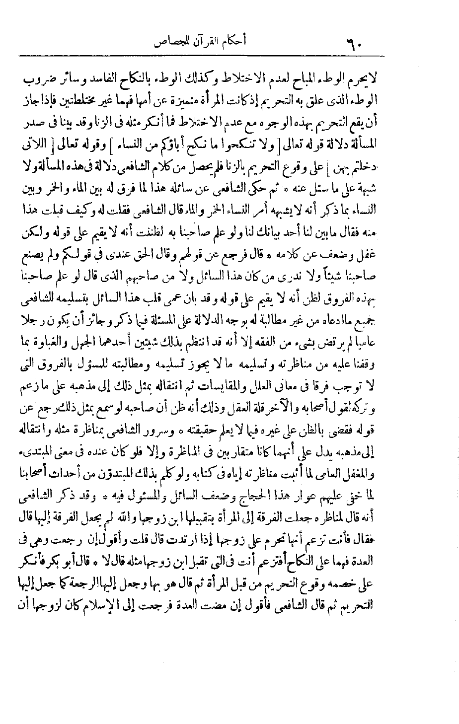 لَا يَحْرُمَ الْوَطْءُ الْمُبَاحُ لِعَدَمِ الِاخْتِلَاطِ وَكَذَلِكَ الْوَطْءُ بِالنِّكَاحِ الْفَاسِدِ وَسَائِرِ ضُرُوبِ الْوَطْءِ الَّذِي عُلِّقَ بِهِ التَّحْرِيمُ إذْ كَانَتْ الْمَرْأَةُ مُتَمَيِّزَةً عن أمها فَهُمَا غَيْرُ مُخْتَلِطَتَيْنِ فَإِذَا جَازَ أَنْ يَقَعَ التَّحْرِيمُ بِهَذِهِ الْوُجُوهِ مَعَ عَدَمِ الِاخْتِلَاطِ فَمَا أُنْكِرَ مِثْلُهُ فِي الزِّنَا وَقَدْ بَيَّنَّا فِي صَدْرِ الْمَسْأَلَةِ دَلَالَةَ قَوْله تَعَالَى وَلا تَنْكِحُوا ما نَكَحَ آباؤُكُمْ مِنَ النِّساءِ وقوله تعالى اللَّاتِي دَخَلْتُمْ بِهِنَّ عَلَى وُقُوعِ التَّحْرِيمِ بِالزِّنَا فَلَمْ يَحْصُلْ مِنْ كَلَامِ الشَّافِعِيِّ دَلَالَةٌ فِي هَذِهِ الْمَسْأَلَةِ وَلَا شُبْهَةَ عَلَى مَا سُئِلَ عَنْهُ ثُمَّ حَكَى الشَّافِعِيُّ عَنْ سَائِلِهِ هَذَا لَمَّا فَرَّقَ لَهُ بَيْنَ الْمَاءِ وَالْخَمْرِ وَبَيْنَ النِّسَاءِ بِمَا ذَكَرَ أنه لا يشبهه أَمْرُ النِّسَاءِ الْخَمْرَ وَالْمَاءَ قَالَ الشَّافِعِيُّ فَقُلْت لَهُ وَكَيْفَ قَبِلْت هَذَا مِنْهُ فَقَالَ مَا بَيَّنَ لَنَا أَحَدٌ بَيَانَك لَنَا وَلَوْ عَلِمَ صَاحِبُنَا بِهِ لَظَنَنْت أَنَّهُ لَا يُقِيمُ عَلَى قَوْلِهِ وَلَكِنْ غَفَلَ وَضَعُفَ عَنْ كَلَامِهِ قَالَ فَرَجَعَ عَنْ قَوْلِهِمْ وَقَالَ الْحَقُّ عِنْدِي فِي قَوْلِكُمْ وَلَمْ يَصْنَعْ صَاحِبُنَا شَيْئًا وَلَا نَدْرِي مَنْ كَانَ هَذَا السَّائِلُ وَلَا مَنْ صَاحِبُهُمْ الَّذِي قَالَ لَوْ عَلِمَ صَاحِبُنَا بِهَذِهِ الْفُرُوقِ لَظَنَّ أَنَّهُ لَا يُقِيمُ عَلَى قَوْلِهِ وَقَدْ بَانَ عَمَى قَلْبِ هَذَا السَّائِلِ بِتَسْلِيمِهِ لِلشَّافِعِيِّ جَمِيعَ مَا ادَّعَاهُ مِنْ غَيْرِ مُطَالَبَةٍ لَهُ بِوَجْهِ الدَّلَالَةِ عَلَى الْمَسْأَلَةِ فِيمَا ذَكَرَ وَجَائِزٌ أَنْ يَكُونَ رَجُلًا عَامِّيًّا لَمْ يَرْتَضِ بِشَيْءٍ مِنْ الْفِقْهِ إلَّا أَنَّهُ قَدْ انْتَظَمَ بِذَلِكَ شَيْئَيْنِ أَحَدُهُمَا الْجَهْلُ وَالْغَبَاوَةُ بِمَا وَقَفْنَا عَلَيْهِ مِنْ مُنَاظَرَتِهِ وَتَسْلِيمِهِ مَا لَا يَجُوزُ تَسْلِيمُهُ وَمُطَالَبَتُهُ لِلْمَسْئُولِ بِالْفُرُوقِ الَّتِي لَا تُوجِبُ فَرْقًا فِي مَعَانِي الْعِلَلِ وَالْمُقَايَسَاتِ ثُمَّ انْتِقَالُهُ بِمِثْلِ ذَلِكَ إلَى مَذْهَبِهِ عَلَى مَا زَعَمَ وَتَرْكُهُ لِقَوْلِ أَصْحَابِهِ وَالْآخَرُ قِلَّةُ الْعَقْلِ وَذَلِكَ أَنَّهُ ظَنَّ أَنَّ صَاحِبَهُ لَوْ سَمِعَ بِمِثْلِ ذَلِكَ رَجَعَ عَنْ قَوْلِهِ فَقَضَى بِالظَّنِّ عَلَى غَيْرِهِ فِيمَا لَا يَعْلَمُ حَقِيقَتَهُ وَسُرُورُ الشَّافِعِيِّ بِمُنَاظَرَةِ مِثْلِهِ وَانْتِقَالُهُ إلَى مَذْهَبِهِ يَدُلُّ عَلَى أَنَّهُمَا كَانَا مُتَقَارَبَيْنِ فِي الْمُنَاظَرَةِ وَإِلَّا فَلَوْ كَانَ عِنْدَهُ فِي مَعْنَى الْمُبْتَدِئِ وَالْمُغَفَّلِ الْعَامِّيِّ لَمَا أَثْبَتَ مُنَاظَرَتَهُ إيَّاهُ فِي كِتَابِهِ وَلَوْ كُلِّمَ بذلك المبتدؤن مِنْ أَحْدَاثِ أَصْحَابِنَا لَمَا خَفِيَ عَلَيْهِمْ عَوَارُ هَذَا الْحِجَاجِ وَضَعْفُ السَّائِلِ وَالْمَسْئُولِ فِيهِ وَقَدْ ذَكَرَ الشَّافِعِيُّ أَنَّهُ قَالَ لِمُنَاظِرِهِ جَعَلْت الْفُرْقَةَ إلَى الْمَرْأَةِ بِتَقْبِيلِهَا ابْنَ زَوْجِهَا وَاَللَّهُ لَمْ يَجْعَل الْفُرْقَةَ إلَيْهَا قَالَ فَقَالَ فَأَنْتَ تَزْعُمُ أَنَّهَا تَحْرُمُ عَلَى زَوْجِهَا إذَا ارْتَدَّتْ قَالَ قُلْت وَأَقُولُ إنْ رَجَعَتْ وَهِيَ فِي الْعِدَّةِ فَهُمَا عَلَى النِّكَاح أَفَتَزْعُمْ أَنْتَ فِي الَّتِي تُقَبِّلُ ابْنَ زَوْجِهَا مِثْلَهُ قَالَ لَا قَالَ أَبُو بَكْرٍ فَأَنْكَرَ عَلَى خَصْمِهِ وُقُوعَ التَّحْرِيمِ مِنْ قِبَلِ الْمَرْأَةِ ثُمَّ قَالَ هُوَ بِهَا وَجَعَلَ إلَيْهَا الرَّجْعَةَ كَمَا جَعَلَ إلَيْهَا التَّح