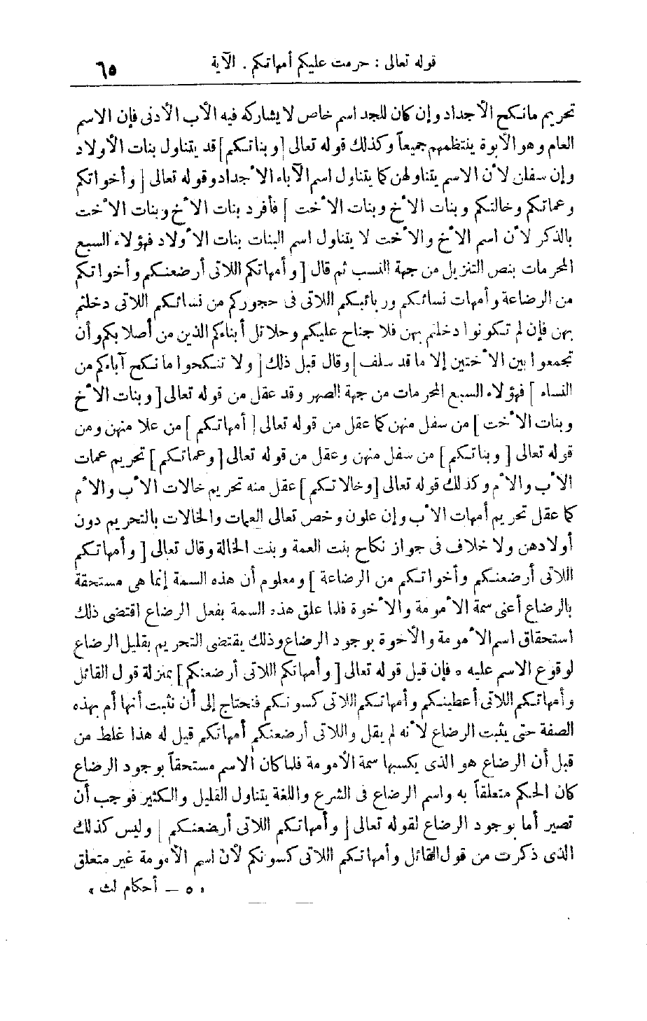 تَحْرِيمُ مَا نَكَحَ الْأَجْدَادُ وَإِنْ كَانَ لِلْجَدِّ اسْمٌ خَاصٌّ لَا يُشَارِكُهُ فِيهِ الْأَبُ الْأَدْنَى فَإِنَّ الِاسْمَ الْعَامَّ وَهُوَ الْأُبُوَّةُ يَنْتَظِمُهُمْ جَمِيعًا وكذلك قوله تعالى وَبَناتُكُمْ قَدْ يَتَنَاوَلُ بَنَاتِ الْأَوْلَادِ وَإِنْ سَفُلْنَ لِأَنَّ الِاسْمَ يَتَنَاوَلُهُنَّ كَمَا يَتَنَاوَلُ اسْمُ الْآبَاءِ الْأَجْدَادَ وقَوْله تَعَالَى وَأَخَواتُكُمْ وَعَمَّاتُكُمْ وَخالاتُكُمْ وَبَناتُ الْأَخِ وَبَناتُ الْأُخْتِ فَأَفْرَدَ بَنَاتِ الْأَخِ وَبَنَاتِ الْأُخْتِ بِالذِّكْرِ لِأَنَّ اسم الأخ والأخت لا يَتَنَاوَلُ اسْمُ الْبَنَاتِ بَنَاتِ الْأَوْلَادِ فَهَؤُلَاءِ السَّبْعُ الْمُحَرَّمَاتُ بِنَصِّ التَّنْزِيلِ مِنْ جِهَةِ النَّسَبِ ثُمَّ قَالَ وَأُمَّهاتُكُمُ اللَّاتِي أَرْضَعْنَكُمْ وَأَخَواتُكُمْ مِنَ الرَّضاعَةِ وَأُمَّهاتُ نِسائِكُمْ وَرَبائِبُكُمُ اللَّاتِي فِي حُجُورِكُمْ مِنْ نِسائِكُمُ اللَّاتِي دَخَلْتُمْ بِهِنَّ فَإِنْ لَمْ تَكُونُوا دَخَلْتُمْ بِهِنَّ فَلا جُناحَ عَلَيْكُمْ وَحَلائِلُ أَبْنائِكُمُ الَّذِينَ مِنْ أَصْلابِكُمْ وَأَنْ تَجْمَعُوا بَيْنَ الْأُخْتَيْنِ إِلَّا ما قَدْ سَلَفَ وَقَالَ قَبْلَ ذَلِكَ وَلا تَنْكِحُوا مَا نَكَحَ آباؤُكُمْ مِنَ النِّساءِ فَهَؤُلَاءِ السَّبْعُ الْمُحَرَّمَاتُ مِنْ جِهَةِ الصِّهْرِ وَقَدْ عُقِلَ مِنْ قَوْله تَعَالَى وَبَناتُ الْأَخِ وَبَناتُ الْأُخْتِ مَنْ سَفَلَ مِنْهُنَّ كَمَا عُقِلَ مِنْ قَوْله تعالى أُمَّهاتُكُمْ مَنْ عَلَا مِنْهُنَّ وَمِنْ قَوْله تَعَالَى وَبَناتُكُمْ مَنْ سَفَلَ مِنْهُنَّ وَعُقِلَ مِنْ قَوْله تَعَالَى وَعَمَّاتُكُمْ تَحْرِيمُ عَمَّاتِ الْأَبِ وَالْأُمِّ وَكَذَلِكَ قَوْله تَعَالَى وَخالاتُكُمْ عقل منه تحريم خالات الأب والأم كَمَا عُقِلَ تَحْرِيمُ أُمَّهَاتِ الْأَبِ وَإِنْ عَلَوْنَ وَخَصَّ تَعَالَى الْعَمَّاتِ وَالْخَالَاتِ بِالتَّحْرِيمِ دُونَ أَوْلَادِهِنَّ وَلَا خِلَافَ فِي جَوَازِ نِكَاحِ بِنْتِ الْعَمَّةِ وَبِنْتِ الْخَالَةِ وَقَالَ تَعَالَى وَأُمَّهاتُكُمُ اللَّاتِي أَرْضَعْنَكُمْ وَأَخَواتُكُمْ مِنَ الرَّضاعَةِ وَمَعْلُومٌ أَنَّ هَذِهِ السِّمَةَ إنَّمَا هِيَ مُسْتَحَقَّةٌ بِالرَّضَاعِ أَعْنِي سِمَةَ الْأُمُومَةِ وَالْأُخُوَّةِ فَلَمَّا عَلَّقَ هَذِهِ السِّمَةَ بِفِعْلِ الرَّضَاعِ اقْتَضَى ذَلِكَ اسْتِحْقَاقَ اسْمِ الْأُمُومَةِ وَالْأُخُوَّةِ بِوُجُودِ الرَّضَاعِ وَذَلِكَ يَقْتَضِي التَّحْرِيمَ بِقَلِيلِ الرَّضَاعِ لِوُقُوعِ الِاسْمِ عَلَيْهِ فَإِنْ قيل قوله تعالى وَأُمَّهاتُكُمُ اللَّاتِي أَرْضَعْنَكُمْ بِمَنْزِلَةِ قَوْلِ الْقَائِلِ وَأُمَّهَاتُكُمْ اللَّاتِي أَعْطَيْنَكُمْ وَأُمَّهَاتُكُمْ اللَّاتِي كَسَوْنَكُمْ فَنَحْتَاجُ إلَى أَنْ نُثْبِتَ أَنَّهَا أُمٌّ بِهَذِهِ الصِّفَةِ حَتَّى يَثْبُتَ الرَّضَاعُ لِأَنَّهُ لَمْ يَقُلْ وَاَللَّاتِي أَرْضَعْنَكُمْ أُمَّهَاتُكُمْ قِيلَ لَهُ هَذَا غَلَطٌ مِنْ قِبَلِ أَنَّ الرَّضَاعَ هُوَ الَّذِي يُكْسِبُهَا سِمَةَ الْأُمُومَةِ فَلَمَّا كَانَ الِاسْمُ مُسْتَحِقًّا بِوُجُودِ الرَّضَاعِ كَانَ الْحُكْمُ مُتَعَلِّقًا بِهِ وَاسْمُ الرَّضَاعِ فِي الشَّرْعِ وَاللُّغَةِ يَتَنَاوَلُ الْقَلِيلَ وَالْكَثِيرَ فَوَجَبَ أَنْ تَصِيرَ أُمًّا بِوُجُودِ الرَّضَاعِ لقوله تعالى وَأُمَّهاتُكُمُ اللَّاتِي أَرْضَعْنَكُمْ وَلَيْسَ كَذَلِكَ الَّذِي ذَكَرْت مِنْ قَوْلِ الْقَائِلِ وَأُمَّهَاتُكُمْ اللَّاتِي كَسَوْنَكُمْ لِأَنَّ اسْمَ الْأُمُومَةِ غَيْرُ متعلق «5- أحكام لث»