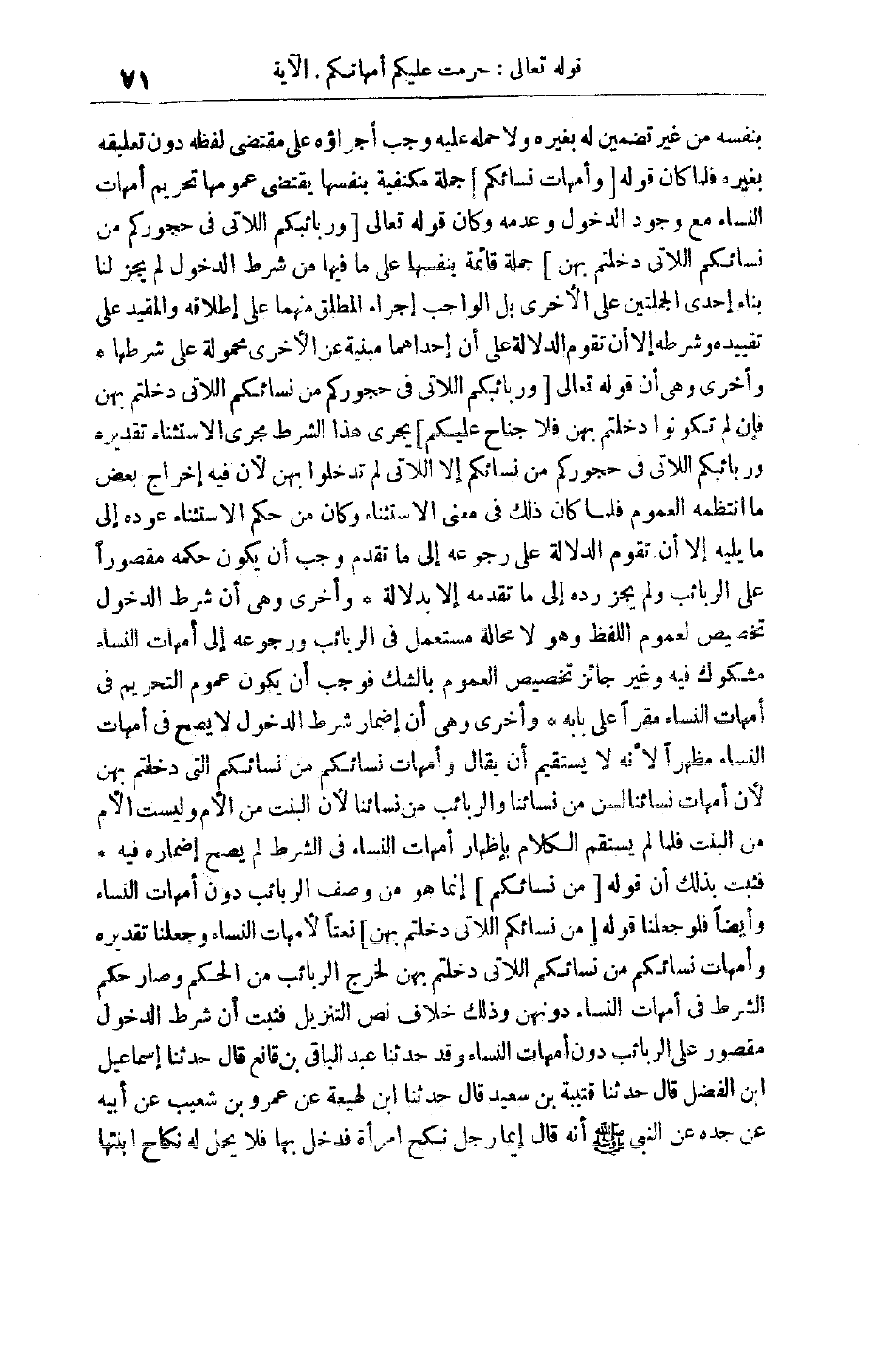 وَهُوَ لَا مَحَالَةَ مُسْتَعْمَلٌ فِي الرَّبَائِبِ وَرُجُوعُهُ إلَى أُمَّهَاتِ النِّسَاءِ مَشْكُوكٌ فِيهِ وَغَيْرُ جَائِزٍ تَخْصِيصُ الْعُمُومِ بِالشَّكِّ فَوَجَبَ أَنْ يَكُونَ عُمُومُ التَّحْرِيمِ فِي أُمَّهَاتِ النِّسَاءِ مُقِرًّا عَلَى بَابِهِ وَأُخْرَى وَهِيَ أَنَّ إضْمَارَ شَرْطِ الدُّخُولِ لَا يَصِحُّ فِي أُمَّهَاتِ النِّسَاءِ مُظْهِرًا لِأَنَّهُ لَا يَسْتَقِيمُ أَنْ يُقَالَ وَأُمَّهَاتُ نِسَائِكُمْ مِنْ نِسَائِكُمْ التي دَخَلْتُمْ بِهِنَّ لِأَنَّ أُمَّهَاتِ نِسَائِنَا لَسْنَ مِنْ نِسَائِنَا وَالرَّبَائِبُ مِنْ نِسَائِنَا لِأَنَّ الْبِنْتَ مِنْ الْأُمِّ وَلَيْسَتْ الْأُمُّ مِنْ الْبِنْتِ فَلَمَّا لَمْ يَسْتَقِمْ الْكَلَامُ بِإِظْهَارِ أُمَّهَاتِ النِّسَاءِ فِي الشَّرْطِ لَمْ يَصِحَّ إضْمَارُهُ فِيهِ فَثَبَتَ بِذَلِكَ أَنَّ قوله مِنْ نِسائِكُمْ إنَّمَا هُوَ مِنْ وَصْفِ الرَّبَائِبِ دُونَ أُمَّهَاتِ النِّسَاءِ وَأَيْضًا فَلَوْ جَعَلْنَا قَوْلَهُ مِنْ نِسائِكُمُ اللَّاتِي دَخَلْتُمْ بِهِنَّ نَعْتًا لِأُمَّهَاتِ النِّسَاءِ وَجَعَلْنَا تَقْدِيرَهُ وَأُمَّهَاتُ نِسَائِكُمْ مِنْ نِسَائِكُمْ اللَّاتِي دَخَلْتُمْ بِهِنَّ لَخَرَجَ الرَّبَائِبُ مِنْ الْحُكْمِ وَصَارَ حُكْمُ الشَّرْطِ فِي أُمَّهَاتِ النِّسَاءِ دُونَهُنَّ وَذَلِكَ خِلَافُ نَصِّ التَّنْزِيلِ فَثَبَتَ أَنَّ شَرْطَ الدُّخُولِ مَقْصُورٌ عَلَى الرَّبَائِبِ دُونَ أُمَّهَاتِ النِّسَاءِ