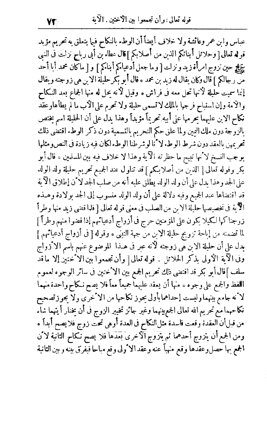 وَنَزَلَتْ وَما جَعَلَ أَدْعِياءَكُمْ أَبْناءَكُمْ وما كانَ مُحَمَّدٌ أَبا أَحَدٍ مِنْ رِجالِكُمْ قَالَ وَكَانَ يُقَالُ لَهُ زَيْدُ بْنُ مُحَمَّدٍ قَالَ أَبُو بَكْرٍ حَلِيلَةُ الِابْنِ هِيَ زَوْجَتُهُ وَيُقَالُ إنَّمَا سُمِّيَتْ حَلِيلَةً لِأَنَّهَا تَحُلُّ مَعَهُ فِي فِرَاشٍ وَقِيلَ لِأَنَّهُ يَحِلُّ لَهُ مِنْهَا الجماع بعد النكاح والأمة وإن اسْتَبَاحَ فَرْجَهَا بِالْمِلْكِ لَا تُسَمَّى حَلِيلَةً وَلَا تَحْرُمُ عَلَى الْأَبِ مَا لَمْ يَطَأْهَا وَعَقْدُ نكاح الابن عليهما يُحَرِّمُهَا عَلَى أَبِيهِ تَحْرِيمًا مُؤَبَّدًا وَهَذَا يَدُلُّ عَلَى أَنَّ الْحَلِيلَةَ اسْمٌ يَخْتَصُّ بِالزَّوْجَةِ دُونَ مِلْكِ الْيَمِينِ وَلَمَّا عُلِّقَ حُكْمُ التَّحْرِيمِ بِالتَّسْمِيَةِ دُونَ ذِكْرِ الْوَطْءِ اقْتَضَى ذَلِكَ تَحْرِيمَهُنَّ بِالْعَقْدِ دُونَ شَرْطِ الْوَطْءِ لِأَنَّا لَوْ شَرَطْنَا الْوَطْءَ لَكَانَ فِيهِ زِيَادَةٌ فِي النَّصِّ وَمِثْلُهَا يُوجِبُ النَّسْخَ لِأَنَّهَا تُبِيحُ مَا حَظَرَتْهُ الْآيَةُ وَهَذَا لَا خِلَافَ فِيهِ بَيْنَ الْمُسْلِمِينَ قَالَ أَبُو بكر وقوله تعالى الَّذِينَ مِنْ أَصْلابِكُمْ قد تناول عند الجميع تَحْرِيمَ حَلِيلَةِ وَلَدِ الْوَلَدِ عَلَى الْجَدِّ وَهَذَا يَدُلُّ عَلَى أَنَّ وَلَدَ الْوَلَدِ يُطْلَقُ عَلَيْهِ أَنَّهُ مِنْ صُلْبِ الْجَدِّ لِأَنَّ إطْلَاقَ الْآيَةِ قد اقتضاها عِنْدَ الْجَمِيعِ وَفِيهِ دَلَالَةٌ عَلَى أَنَّ وَلَدَ الولد منسوب إلى الجد بولادة وَهَذِهِ الْآيَةُ فِي تَخْصِيصِهَا حَلِيلَةَ الِابْنِ مِنْ الصُّلْبِ فِي مَعْنَى قَوْله تَعَالَى فَلَمَّا قَضى زَيْدٌ مِنْها وَطَراً زَوَّجْناكَها لِكَيْ لا يَكُونَ عَلَى الْمُؤْمِنِينَ حَرَجٌ فِي أَزْواجِ أَدْعِيائِهِمْ إِذا قَضَوْا مِنْهُنَّ وَطَراً لِمَا تَضَمَّنَهُ مِنْ إبَاحَةِ تَزْوِيجِ حَلِيلَةِ الِابْنِ مِنْ جِهَةِ التَّبَنِّي وَقَوْلُهُ فِي أَزْواجِ أَدْعِيائِهِمْ يَدُلُّ عَلَى أَنَّ حَلِيلَةَ الِابْنِ هِيَ زَوْجَتُهُ لأنه عبر في هذا الموضوع عنهم بِاسْمِ الْأَزْوَاجِ وَفِي الْآيَةِ الْأُولَى بِذِكْرِ الْحَلَائِلِ. قَوْله تَعَالَى وَأَنْ تَجْمَعُوا بَيْنَ الْأُخْتَيْنِ إِلَّا ما قَدْ سَلَفَ قَالَ أَبُو بَكْرٍ قَدْ اقْتَضَى ذَلِكَ تَحْرِيمَ الْجَمْعِ بَيْنَ الْأُخْتَيْنِ فِي سَائِرِ الْوُجُوهِ لِعُمُومِ اللَّفْظِ وَالْجَمْعُ عَلَى وُجُوهٍ مِنْهَا أَنْ يَعْقِدَ عَلَيْهِمَا جَمِيعًا مَعًا فَلَا يَصِحُّ نِكَاحُ وَاحِدَةٍ مِنْهُمَا لِأَنَّهُ جَامِعٌ بَيْنَهُمَا وَلَيْسَتْ إحْدَاهُمَا بِأَوْلَى يجوز نِكَاحِهَا مِنْ الْأُخْرَى وَلَا يَجُوزُ تَصْحِيحُ نِكَاحِهِمَا مَعَ تَحْرِيمِ اللَّهِ تَعَالَى الْجَمْعَ بَيْنَهُمَا وَغَيْرُ جَائِزٍ تَخْيِيرُ الزَّوْجِ فِي أَنْ يَخْتَارَ أَيَّتَهُمَا شَاءَ مِنْ قِبَلِ أَنَّ الْعُقْدَةَ وَقَعَتْ فَاسِدَةً مِثْلَ النِّكَاحِ فِي الْعِدَّةِ أَوْ هِيَ تَحْتَ زَوْجٍ فَلَا يَصِحُّ أَبَدًا وَمِنْ الْجَمْعِ أَنْ يتزوج أحدهما ثُمَّ يَتَزَوَّجَ الْأُخْرَى بَعْدَهَا فَلَا يَصِحُّ نِكَاحُ الثَّانِيَةِ لِأَنَّ الْجَمْعَ بِهَا حَصَلَ وَعَقْدُهَا وَقَعَ مَنْهِيًّا عَنْهُ وَعَقْدُ الْأُولَى وَقَعَ مُبَاحًا فَيُفَرَّقُ بَيْنَهُ وَبَيْنَ الثَّانِيَةِ