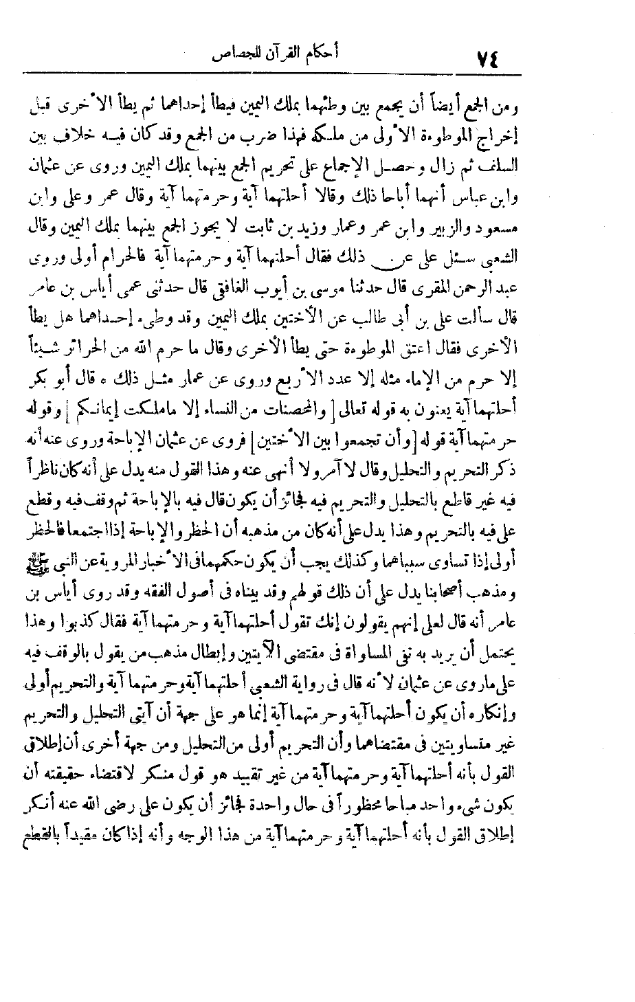 وَرُوِيَ عَنْ عَمَّارٍ مِثْلُ ذَلِكَ قَالَ أَبُو بَكْرٍ أَحَلَّتْهُمَا آيَةٌ يَعْنُونَ بِهِ قَوْله تَعَالَى وَالْمُحْصَناتُ مِنَ النِّساءِ إِلَّا مَا مَلَكَتْ أَيْمانُكُمْ وقوله حرمتهما آية قوله وَأَنْ تَجْمَعُوا بَيْنَ الْأُخْتَيْنِ فَرُوِيَ عَنْ عُثْمَانَ الْإِبَاحَةُ وَرُوِيَ عَنْهُ أَنَّهُ ذكر التحريم والتحليل وقال لا آمر وَلَا أَنْهَى عَنْهُ وَهَذَا الْقَوْلُ مِنْهُ يَدُلُّ عَلَى أَنَّهُ كَانَ نَاظِرًا فِيهِ غَيْرَ قَاطِعٍ بِالتَّحْلِيلِ وَالتَّحْرِيمِ فِيهِ فَجَائِزٌ أَنْ يَكُونَ قَالَ فِيهِ بِالْإِبَاحَةِ ثُمَّ وَقَفَ فِيهِ وَقَطَعَ عَلِيٌّ فِيهِ بِالتَّحْرِيمِ وَهَذَا يَدُلُّ عَلَى أَنَّهُ كَانَ مِنْ مَذْهَبِهِ أَنَّ الْحَظْرَ وَالْإِبَاحَةَ إذَا اجْتَمَعَا فَالْحَظْرُ أَوْلَى إذَا تَسَاوَى سَبَبَاهُمَا وَكَذَلِكَ يَجِبُ أَنْ يَكُونَ حُكْمُهُمَا فِي الْأَخْبَارِ الْمَرْوِيَّةِ عَنْ النَّبِيِّ صَلَّى اللَّهُ عَلَيْهِ وَسَلَّمَ وَمَذْهَبُ أَصْحَابِنَا يَدُلُّ عَلَى أَنَّ ذَلِكَ قَوْلُهُمْ وَقَدْ بَيَّنَّاهُ فِي أُصُولِ الْفِقْهِ
