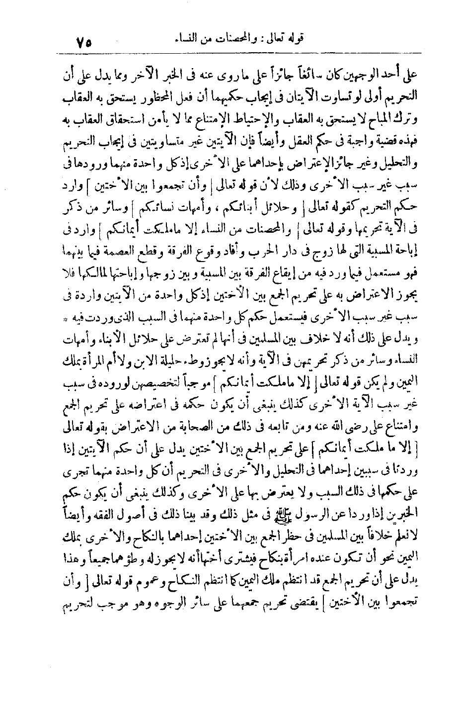 عَلَى أَحَدِ الْوَجْهَيْنِ كَانَ سَائِغًا جَائِزًا عَلَى مَا رُوِيَ عَنْهُ فِي الْخَبَرِ الْآخَرِ وَمِمَّا يَدُلُّ عَلَى أَنَّ التَّحْرِيمَ أَوْلَى لَوْ تَسَاوَتْ الْآيَتَانِ فِي إيجَابِ حُكْمَيْهِمَا أَنَّ فِعْلَ الْمَحْظُورِ يَسْتَحِقُّ بِهِ الْعِقَابَ وَتَرْكَ الْمُبَاحِ لَا يَسْتَحِقُّ بِهِ الْعِقَابَ وَالِاحْتِيَاطُ الِامْتِنَاعُ مِمَّا لَا يَأْمَنُ اسْتِحْقَاقَ الْعِقَابِ بِهِ فَهَذِهِ قَضِيَّةٌ وَاجِبَةٌ فِي حُكْمِ الْعَقْلِ وَأَيْضًا فَإِنَّ الْآيَتَيْنِ غَيْرُ مُتَسَاوِيَتَيْنِ فِي إيجَابِ التَّحْرِيمِ وَالتَّحْلِيلِ وَغَيْرُ جَائِزٍ الِاعْتِرَاضُ بِإِحْدَاهُمَا عَلَى الْأُخْرَى إذْ كُلُّ وَاحِدَةٍ مِنْهُمَا وُرُودُهَا فِي سَبَبٍ غَيْرِ سَبَبِ الْأُخْرَى وَذَلِكَ لِأَنَّ قَوْله تَعَالَى وَأَنْ تَجْمَعُوا بَيْنَ الْأُخْتَيْنِ وارد حكم التحريم كقوله تعالى وَحَلائِلُ أَبْنائِكُمُ، وَأُمَّهاتُ نِسائِكُمْ وَسَائِرُ مَنْ ذُكِرَ فِي الْآيَةِ تَحْرِيمُهَا وقَوْله تَعَالَى وَالْمُحْصَناتُ مِنَ النِّساءِ إِلَّا مَا مَلَكَتْ أَيْمانُكُمْ وَارِدٌ فِي إبَاحَةِ الْمَسْبِيَّةِ الَّتِي لَهَا زَوْجٌ فِي دَارِ الْحَرْبِ وَأَفَادَ وُقُوعَ الْفُرْقَةِ وَقَطْعَ الْعِصْمَةِ فِيمَا بَيْنَهُمَا فَهُوَ مُسْتَعْمَلٌ فِيمَا وَرَدَ فِيهِ مِنْ إيقَاعِ الْفُرْقَةِ بَيْنَ الْمَسْبِيَّةِ وَبَيْنَ زَوْجِهَا وَإِبَاحَتِهَا لِمَالِكِهَا فَلَا يَجُوزُ الِاعْتِرَاضُ بِهِ عَلَى تَحْرِيمِ الْجَمْعِ بَيْنَ الْأُخْتَيْنِ إذْ كُلُّ وَاحِدَةٍ مِنْ الْآيَتَيْنِ وَارِدَةٌ فِي سَبَبٍ غَيْرِ سَبَبِ الْأُخْرَى فَيُسْتَعْمَلُ حُكْمُ كُلُّ وَاحِدَةٍ مِنْهُمَا فِي السَّبَبِ الَّذِي وَرَدَتْ فِيهِ وَيَدُلُّ عَلَى ذَلِكَ أَنَّهُ لَا خِلَافَ بَيْنَ الْمُسْلِمِينَ فِي أَنَّهَا لَمْ تَعْتَرِضْ عَلَى حَلَائِلِ الْأَبْنَاءِ وَأُمَّهَاتِ النِّسَاءِ وَسَائِرِ مَنْ ذُكِرَ تَحْرِيمُهُنَّ فِي الْآيَةِ وَأَنَّهُ لَا يَجُوزُ وَطْءُ حَلِيلَةِ الِابْنِ وَلَا أُمِّ الْمَرْأَةِ بِمِلْكِ الْيَمِينِ وَلَمْ يَكُنْ قَوْله تعالى إِلَّا ما مَلَكَتْ أَيْمانُكُمْ مُوجِبًا لَتَخْصِيصِهِنَّ لَوُرُودِهِ فِي سَبَبٍ غَيْرِ سَبَبِ الْآيَةِ الْأُخْرَى كَذَلِكَ يَنْبَغِي أَنْ يَكُونَ حُكْمُهُ فِي اعْتِرَاضِهِ عَلَى تَحْرِيمِ الْجَمْعِ وَامْتِنَاعِ عَلِيٍّ رَضِيَ اللَّهُ عَنْهُ وَمَنْ تَابَعَهُ فِي ذَلِكَ مِنْ الصَّحَابَةِ مِنْ الِاعْتِرَاضِ بِقَوْلِهِ تَعَالَى إِلَّا ما مَلَكَتْ أَيْمانُكُمْ عَلَى تَحْرِيمِ الْجَمْعِ بَيْنَ الْأُخْتَيْنِ يَدُلُّ عَلَى أَنَّ حُكْمَ الْآيَتَيْنِ إذَا وَرَدَتَا فِي سَبَبَيْنِ إحْدَاهُمَا فِي التَّحْلِيلِ وَالْأُخْرَى فِي التَّحْرِيمِ أَنَّ كُلَّ وَاحِدَةٍ مِنْهُمَا تَجْرِي عَلَى حُكْمِهَا فِي ذَلِكَ السَّبَبِ وَلَا يُعْتَرَضُ بِهَا عَلَى الْأُخْرَى وَكَذَلِكَ يَنْبَغِي أَنْ يَكُونَ حُكْمُ الْخَبَرَيْنِ إذَا وَرَدَا عَنْ الرَّسُولِ صَلَّى اللَّهُ عَلَيْهِ وَسَلَّمَ فِي مِثْلِ ذَلِكَ وَقَدْ بَيَّنَّا ذَلِكَ فِي أُصُولِ الْفِقْهِ وَأَيْضًا لَا نَعْلَمُ خِلَافًا بَيْنَ الْمُسْلِمِينَ فِي حَظْرِ الْجَمْعِ بَيْنَ الْأُخْتَيْنِ إحْدَاهُمَا بِالنِّكَاحِ وَالْأُخْرَى بِمِلْكِ الْيَمِينِ نَحْوَ أَنْ تَكُونَ عِنْدَهُ امْرَأَةٌ بِنِكَاحٍ فَيَشْتَرِي أُخْتَهَا أَنَّهُ لَا يَجُوزُ لَهُ وَطْؤُهُمَا جَمِيعًا وَهَذَا يَدُلُّ عَلَى أَنَّ تَحْرِيمَ الْجَمْعِ قَدْ انْتَظَمَ مِلْكَ الْيَمِينِ كَمَا انْتَظَمَ النِّكَاحَ وَعُمُومُ قَوْله تَعَالَى وَأَنْ تَجْمَعُوا بَيْنَ الْأُخْتَيْنِ يَقْتَضِي تَحْرِيمَ جَمْعِهِمَا عَلَى سَائِرِ الْوُجُوهِ وَهُوَ موجب لتحريم