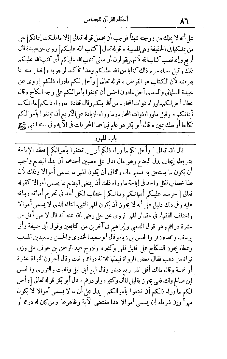 قَالَ اللَّهُ تَعَالَى وَأُحِلَّ لَكُمْ ما وَراءَ ذلِكُمْ أَنْ تَبْتَغُوا بِأَمْوالِكُمْ فعقد الإباحة بشريطة إيجاب بدل البضع وهو مال فدل عَلَى مَعْنَيَيْنِ أَحَدُهُمَا أَنَّ بَدَلَ الْبُضْعِ وَاجِبٌ أَنْ يَكُونَ مَا يَسْتَحِقُّ بِهِ تَسْلِيمُ مَالٍ وَالثَّانِي أَنْ يَكُونَ الْمَهْرُ مَا يُسَمَّى أَمْوَالًا وذلك لأن هذا خطاب لكل واحد فِي إبَاحَةِ مَا وَرَاءَ ذَلِكَ أَنْ يَبْتَغِيَ الْبُضْعَ بِمَا يُسَمَّى أَمْوَالًا كَقَوْلِهِ تَعَالَى حُرِّمَتْ عَلَيْكُمْ أُمَّهاتُكُمْ وَبَناتُكُمْ