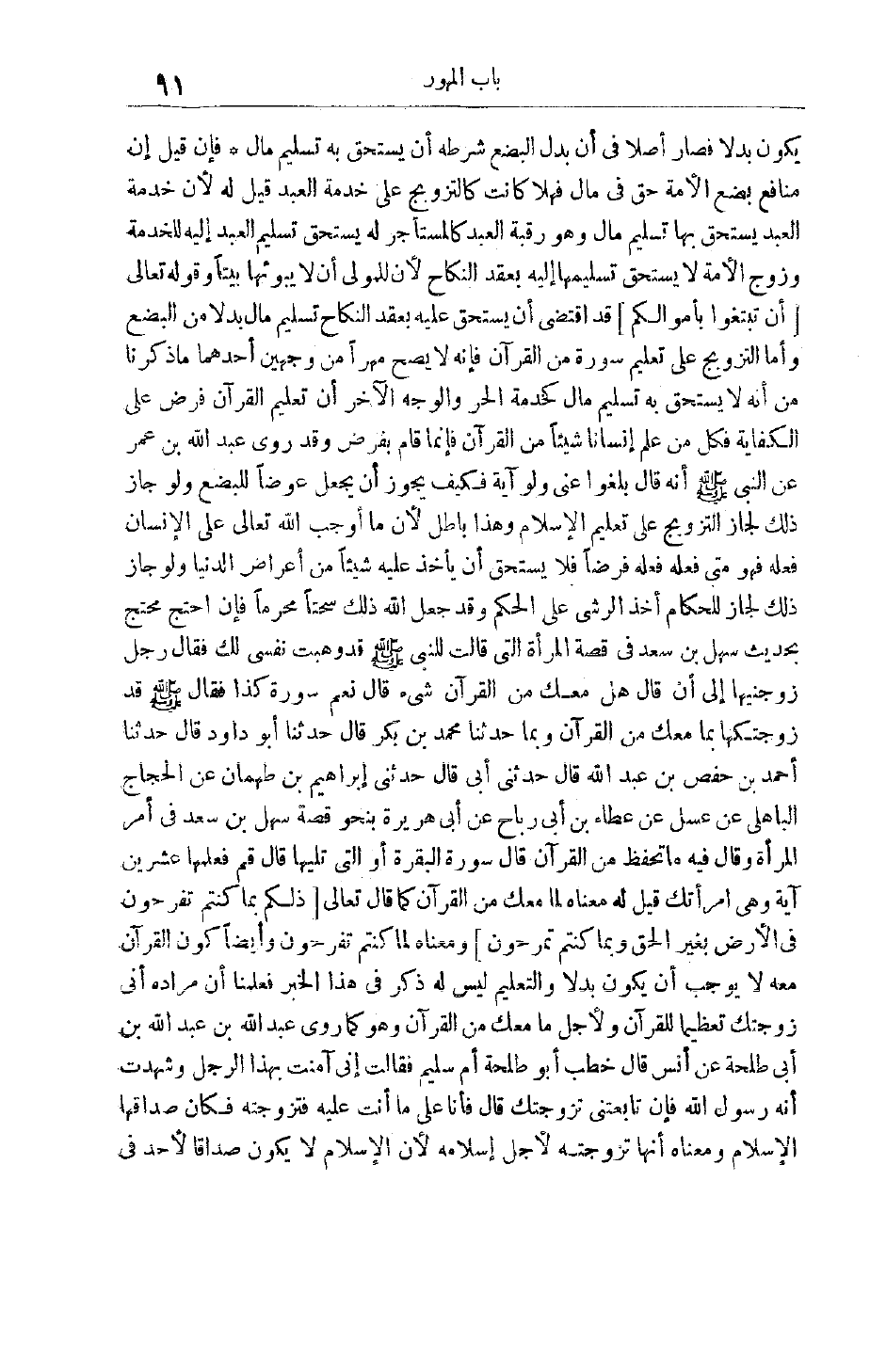 بِحَدِيثِ سَهْلِ بْنِ سَعْدٍ فِي قِصَّةِ الْمَرْأَةِ الَّتِي قَالَتْ لِلنَّبِيِّ صَلَّى اللَّهُ عَلَيْهِ وَسَلَّمَ قَدْ وَهَبْت نَفْسِي لَك فَقَالَ رَجُلٌ زَوِّجْنِيهَا إلَى أَنْ قَالَ هَلْ مَعَك مِنْ الْقُرْآنِ شَيْءٌ قَالَ نَعَمْ سُورَةُ كَذَا فَقَالَ صلّى الله عليه وسلّم قَدْ زَوَّجْتُكهَا بِمَا مَعَك مِنْ الْقُرْآنِ