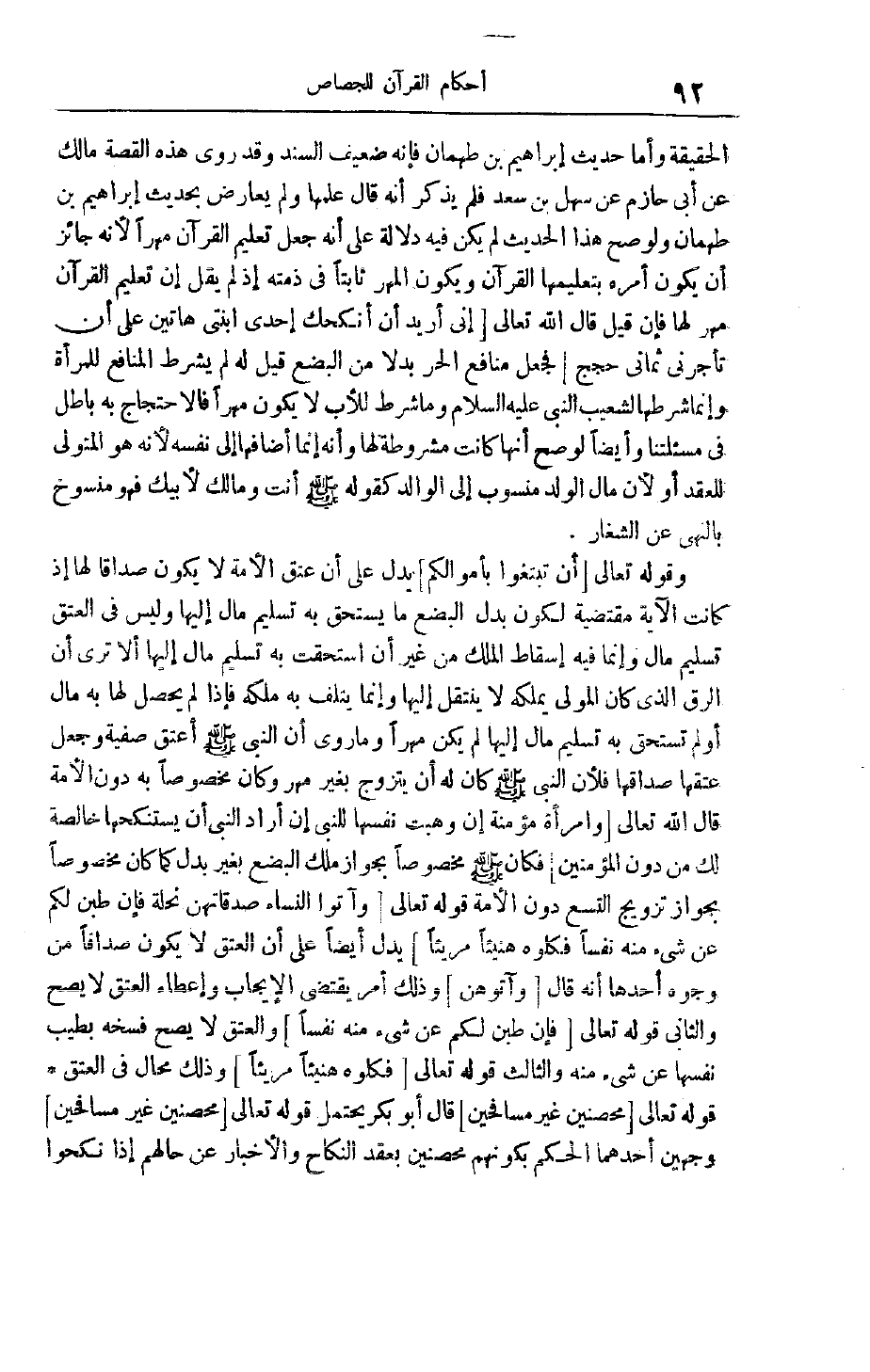 قَالَ وَآتُوهُنَّ وَذَلِكَ أَمْرٌ يَقْتَضِي الْإِيجَابَ وَإِعْطَاءُ الْعِتْقِ لَا يَصِحُّ وَالثَّانِي قَوْله تَعَالَى فَإِنْ طِبْنَ لَكُمْ عَنْ شَيْءٍ مِنْهُ نَفْساً وَالْعِتْقُ لَا يَصِحُّ فَسْخُهُ بِطِيبِ نَفْسِهَا عَنْ شَيْءٍ مِنْهُ وَالثَّالِثُ قَوْله تَعَالَى فَكُلُوهُ هَنِيئاً مَرِيئاً وَذَلِكَ مُحَالٌ فِي الْعِتْقِ قَوْله تَعَالَى مُحْصِنِينَ غَيْرَ مُسافِحِينَ قَالَ أَبُو بَكْرٍ يَحْتَمِلُ قَوْله تَعَالَى مُحْصِنِينَ غَيْرَ مُسافِحِينَ وَجْهَيْنِ أَحَدُهُمَا الْحُكْمُ بِكَوْنِهِمْ مُحْصِنِينَ بِعَقْدِ النِّكَاحِ وَالْإِخْبَارُ عَنْ حَالِهِمْ إذَا نَكَحُوا