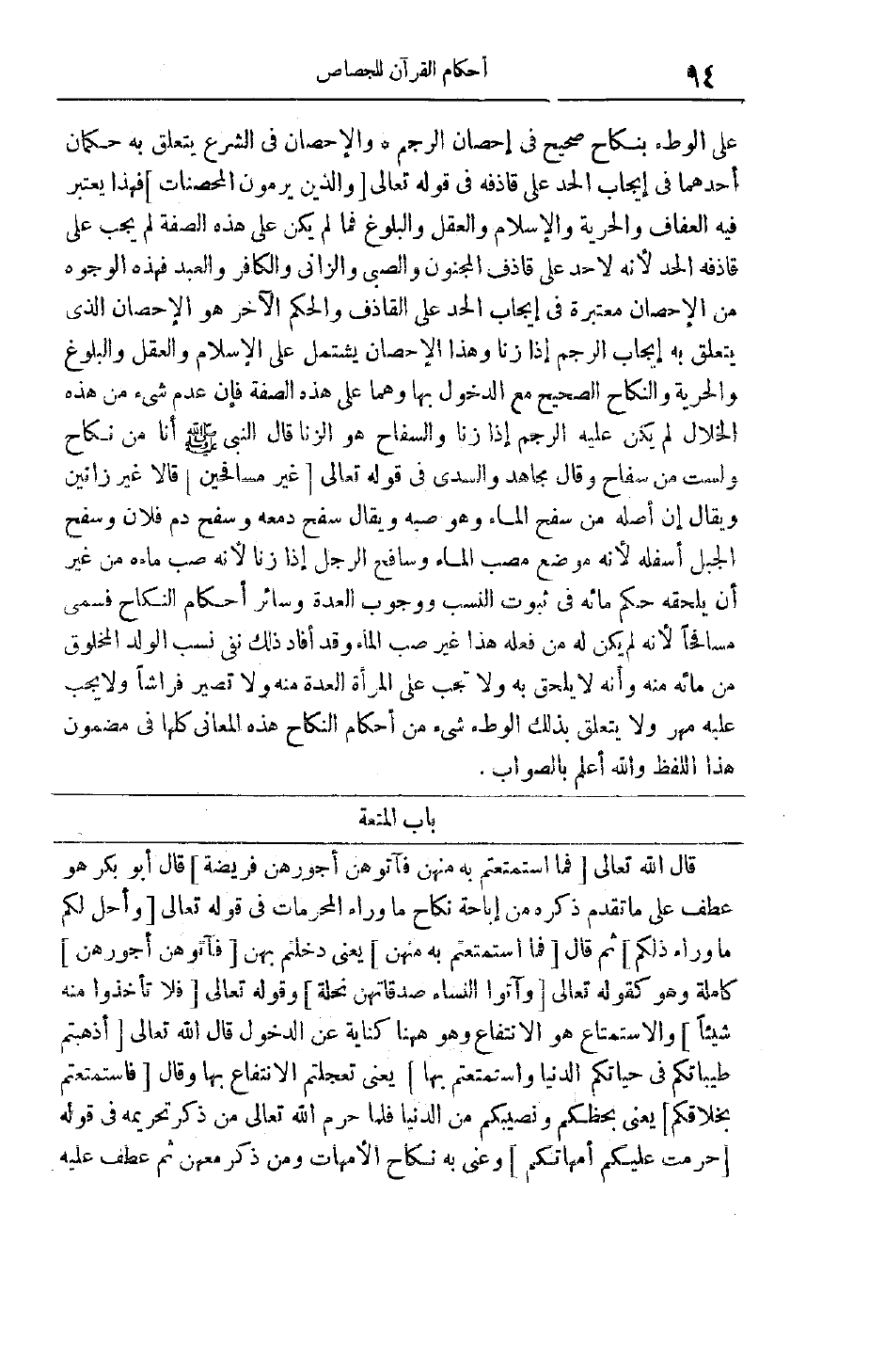 قَالَ اللَّهُ تَعَالَى فَمَا اسْتَمْتَعْتُمْ بِهِ مِنْهُنَّ فَآتُوهُنَّ أُجُورَهُنَّ فَرِيضَةً قَالَ أَبُو بَكْرٍ هُوَ عَطْفٌ عَلَى مَا تَقَدَّمَ ذِكْرُهُ مِنْ إبَاحَةِ نِكَاحِ مَا وَرَاءَ الْمُحَرَّمَاتِ فِي قَوْله تَعَالَى وَأُحِلَّ لَكُمْ مَا وَراءَ ذلِكُمْ ثم قال فَمَا اسْتَمْتَعْتُمْ بِهِ مِنْهُنَّ يعنى دخلتم بهن فَآتُوهُنَّ أُجُورَهُنَّ كَامِلَةً وَهُوَ كَقَوْلِهِ تَعَالَى وَآتُوا النِّساءَ صَدُقاتِهِنَّ نِحْلَةً وقوله تعالى فَلا تَأْخُذُوا مِنْهُ شَيْئاً والاستمتاع هو الانتفاع وهو هاهنا كِنَايَةٌ عَنْ الدُّخُولِ قَالَ اللَّهُ تَعَالَى أَذْهَبْتُمْ طَيِّباتِكُمْ فِي حَياتِكُمُ الدُّنْيا وَاسْتَمْتَعْتُمْ بِها يَعْنِي تَعَجَّلْتُمْ الِانْتِفَاعَ بِهَا وَقَالَ فَاسْتَمْتَعْتُمْ بِخَلاقِكُمْ يَعْنِي بِحَظِّكُمْ وَنَصِيبِكُمْ مِنْ الدُّنْيَا فَلَمَّا حَرَّمَ اللَّهُ تَعَالَى مَنْ ذُكِرَ تَحْرِيمُهُ فِي قَوْلِهِ حُرِّمَتْ عَلَيْكُمْ أُمَّهاتُكُمْ وَعَنَى بِهِ نِكَاحَ الْأُمَّهَاتِ وَمَنْ ذُكِرَ مَعَهُنَّ ثُمَّ عَطَفَ عَلَيْهِ