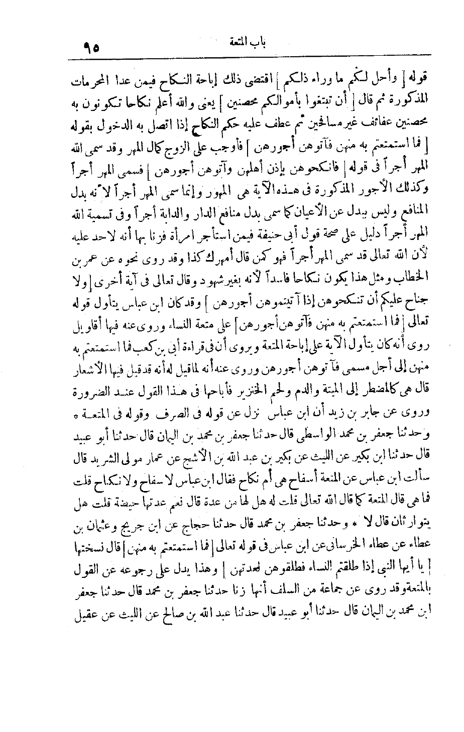 قوله وَأُحِلَّ لَكُمْ ما وَراءَ ذلِكُمْ اقْتَضَى ذَلِكَ إبَاحَةَ النِّكَاحِ فِيمَنْ عَدَا الْمُحَرَّمَاتِ الْمَذْكُورَةِ ثُمَّ قَالَ أَنْ تَبْتَغُوا بِأَمْوالِكُمْ مُحْصِنِينَ يعنى والله أعلم نكاحا تكونون به محصنين عفائف غير مسافحين ثُمَّ عَطَفَ عَلَيْهِ حُكْمَ النِّكَاحِ إذَا اتَّصَلَ بِهِ الدُّخُولُ بِقَوْلِهِ فَمَا اسْتَمْتَعْتُمْ بِهِ مِنْهُنَّ فَآتُوهُنَّ أُجُورَهُنَّ فَأَوْجَبَ عَلَى الزَّوْجِ كَمَالَ الْمَهْرِ وَقَدْ سَمَّى اللَّهُ الْمَهْرَ أَجْرًا فِي قَوْلِهِ فَانْكِحُوهُنَّ بِإِذْنِ أَهْلِهِنَّ وَآتُوهُنَّ أُجُورَهُنَّ فَسَمَّى الْمَهْرَ أَجْرًا وَكَذَلِكَ الْأُجُورُ الْمَذْكُورَةُ فِي هَذِهِ الْآيَةِ هِيَ الْمُهُورُ وَإِنَّمَا سُمِّيَ الْمَهْرُ أَجْرًا لِأَنَّهُ بَدَلُ الْمَنَافِعِ وَلَيْسَ بِبَدَلٍ عَنْ الْأَعْيَانِ كَمَا سُمِّيَ بَدَلُ مَنَافِعِ الدَّارِ وَالدَّابَّةِ أَجْرًا وَفِي تَسْمِيَةِ اللَّهِ الْمَهْرَ أَجْرًا دَلِيلٌ عَلَى صِحَّةِ قَوْلِ أَبِي حَنِيفَةَ فِيمَنْ اسْتَأْجَرَ امرأة فزنا بها أنه لاحد عَلَيْهِ لِأَنَّ اللَّهَ تَعَالَى قَدْ سَمَّى الْمَهْرَ أَجْرًا فَهُوَ كَمَنْ قَالَ أُمْهِرُك كَذَا وَقَدْ رُوِيَ نَحْوُهُ عَنْ عُمَرَ بْنِ الْخَطَّابِ وَمِثْلُ هَذَا يَكُونُ نِكَاحًا فَاسِدًا لِأَنَّهُ بِغَيْرِ شُهُودٍ وَقَالَ تَعَالَى فِي آيَةٍ أُخْرَى وَلا جُناحَ عَلَيْكُمْ أَنْ تَنْكِحُوهُنَّ إِذا آتَيْتُمُوهُنَّ أُجُورَهُنَّ وَقَدْ كَانَ ابْنُ عَبَّاسٍ يَتَأَوَّلُ قَوْله تَعَالَى فَمَا اسْتَمْتَعْتُمْ بِهِ مِنْهُنَّ فَآتُوهُنَّ أُجُورَهُنَّ عَلَى مُتْعَةِ النِّسَاءِ وَرُوِيَ عَنْهُ فِيهَا أَقَاوِيلُ رُوِيَ أَنَّهُ كَانَ يَتَأَوَّلُ الْآيَةَ عَلَى إبَاحَةِ الْمُتْعَةِ وَيُرْوَى أَنَّ فِي قِرَاءَةِ أُبَيِّ بْنِ كَعْبٍ فَمَا اسْتَمْتَعْتُمْ بِهِ مِنْهُنَّ إلَى أَجَلٍ مُسَمًّى فَآتُوهُنَّ أُجُورَهُنَّ وَرُوِيَ عَنْهُ أَنَّهُ لَمَّا قِيلَ لَهُ إنَّهُ قَدْ قِيلَ فِيهَا الْأَشْعَارُ قَالَ هِيَ كَالْمُضْطَرِّ إلَى الْمَيْتَةِ وَالدَّمِ وَلَحْمِ الْخِنْزِيرِ فَأَبَاحَهَا فِي هَذَا الْقَوْلِ عِنْدَ الضَّرُورَةِ وَرُوِيَ عَنْ جَابِرِ بْنِ زَيْدٍ أَنَّ ابْنَ عَبَّاسٍ نَزَلَ عَنْ قَوْلِهِ فِي الصَّرْفِ وَقَوْلِهِ فِي الْمُتْعَةِ وَحَدَّثَنَا جَعْفَرُ بْنُ مُحَمَّدٍ الْوَاسِطِيِّ قَالَ حَدَّثَنَا جعفر بن محمد بن اليمان قَالَ حَدَّثَنَا أَبُو عُبَيْدٍ قَالَ حَدَّثَنَا ابْنُ بُكَيْر عَنْ اللَّيْثِ عَنْ بُكَيْر بْنِ عَبْدِ اللَّهِ بْنِ الْأَشَجِّ عَنْ عَمَّارٍ مَوْلَى الشَّرِيدِ قَالَ سَأَلْت ابْنَ عَبَّاسٍ عَنْ الْمُتْعَةِ أَسِفَاحٌ هِيَ أَمْ نِكَاحٌ فَقَالَ ابْنُ عَبَّاسٍ لَا سِفَاحٌ وَلَا نِكَاحٌ قُلْت فَمَا هِيَ قَالَ الْمُتْعَةُ كَمَا قَالَ اللَّهُ تَعَالَى قُلْت لَهُ هَلْ لَهَا مِنْ عِدَّةٍ قَالَ نَعَمْ عِدَّتُهَا حَيْضَةٌ قُلْت هَلْ يَتَوَارَثَانِ قَالَ لَا وَحَدَّثَنَا جَعْفَرُ بْنُ مُحَمَّدٍ قَالَ حَدَّثَنَا حَجَّاجٌ عَنْ ابن جريج وعثمان بن عطاء عن عطاء الخرسانى عَنْ ابْنِ عَبَّاسٍ فِي قَوْله تَعَالَى فَمَا اسْتَمْتَعْتُمْ بِهِ مِنْهُنَّ قَالَ نَسَخَتْهَا يَا أَيُّهَا النَّبِيُّ إِذا طَلَّقْتُمُ النِّساءَ فَطَلِّقُوهُنَّ لِعِدَّتِهِنَّ وَهَذَا يَدُلُّ عَلَى رُجُوعِهِ عَنْ الْقَوْلِ بِالْمُتْعَةِ وَقَدْ رُوِيَ عَنْ جَمَاعَةٍ مِنْ السَّلَفِ أَنَّهَا زِنًا حَدَّثَنَا جَعْفَرُ بْنُ مُحَمَّدٍ قَالَ حَدَّثَنَا جَعْفَرُ ابن محمد بن اليمان قال حدثنا أبو عبيد قال حدثنا عبد الله بن صالح عن اللَّيْثِ عَنْ عُقَيْلٍ