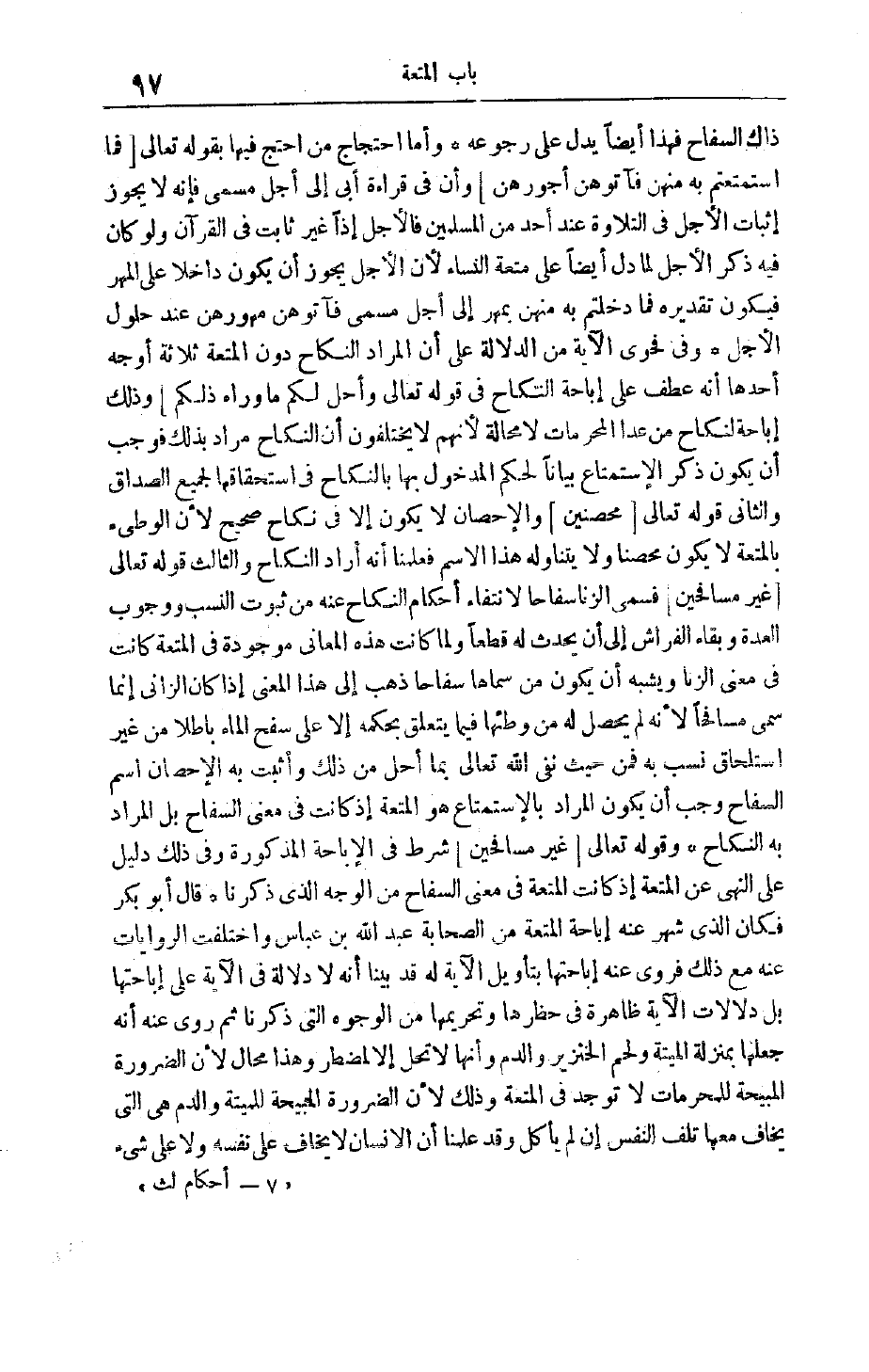ذَاكَ السِّفَاحُ فَهَذَا أَيْضًا يَدُلُّ عَلَى رُجُوعِهِ وَأَمَّا احْتِجَاجُ مَنْ احْتَجَّ فِيهَا بِقَوْلِهِ تَعَالَى فَمَا اسْتَمْتَعْتُمْ بِهِ مِنْهُنَّ فَآتُوهُنَّ أُجُورَهُنَّ وَأَنَّ فِي قِرَاءَةِ أُبَيٍّ إلَى أَجَلٍ مُسَمًّى فَإِنَّهُ لَا يَجُوزُ إثْبَاتُ الْأَجَلِ فِي التِّلَاوَةِ عِنْدَ أَحَدٍ مِنْ الْمُسْلِمِينَ فَالْأَجَلُ إذًا غَيْرُ ثَابِتٍ فِي الْقُرْآنِ وَلَوْ كَانَ فِيهِ ذِكْرُ الْأَجَلِ لَمَا دَلَّ أَيْضًا عَلَى مُتْعَةِ النِّسَاءِ لِأَنَّ الْأَجَلَ يَجُوزُ أَنْ يَكُونَ دَاخِلًا عَلَى الْمَهْرِ فَيَكُونُ تَقْدِيرُهُ فَمَا دَخَلْتُمْ بِهِ مِنْهُنَّ بِمَهْرٍ إلَى أَجَلٍ مُسَمًّى فَآتُوهُنَّ مُهُورَهُنَّ عِنْدَ حُلُولِ الْأَجَلِ وَفِي فَحَوَى الْآيَةِ مِنْ الدَّلَالَةِ عَلَى أَنَّ الْمُرَادَ النِّكَاحُ دُونَ الْمُتْعَةِ ثَلَاثَةُ أَوْجُهٍ أَحَدُهَا أَنَّهُ عَطْفٌ عَلَى إبَاحَةِ النِّكَاحِ فِي قَوْله تَعَالَى وَأُحِلَّ لَكُمْ مَا وَراءَ ذلِكُمْ وَذَلِكَ إبَاحَةٌ لِنِكَاحِ مَنْ عَدَا الْمُحَرَّمَاتِ لَا مَحَالَةَ لِأَنَّهُمْ لَا يَخْتَلِفُونَ أَنَّ النِّكَاحَ مُرَادٌ بِذَلك فَوَجَبَ أَنْ يَكُونَ ذِكْرُ الِاسْتِمْتَاعِ بَيَانًا لِحُكْمِ الْمَدْخُولِ بِهَا بِالنِّكَاحِ فِي اسْتِحْقَاقِهَا لِجَمِيعِ الصداق والثاني قوله تعالى مُحْصِنِينَ وَالْإِحْصَانُ لَا يَكُونُ إلَّا فِي نِكَاحٍ صَحِيحٍ لأن الوطء بِالْمُتْعَةِ لَا يَكُونُ مُحْصَنًا وَلَا يَتَنَاوَلُهُ هَذَا الِاسْمُ فَعَلِمْنَا أَنَّهُ أَرَادَ النِّكَاحَ وَالثَّالِثُ قَوْله تعالى غَيْرَ مُسافِحِينَ فَسَمَّى الزِّنَا سِفَاحًا لِانْتِفَاءِ أَحْكَامِ النِّكَاحِ عَنْهُ مِنْ ثُبُوتِ النَّسَبِ وَوُجُوبِ الْعِدَّةِ وَبَقَاءِ الْفِرَاشِ إلَى أَنْ يُحْدِثَ لَهُ قَطْعًا وَلَمَّا كَانَتْ هَذِهِ الْمَعَانِي مَوْجُودَةً فِي الْمُتْعَةِ كَانَتْ فِي مَعْنَى الزِّنَا وَيُشْبِهُ أَنْ يَكُونَ مَنْ سَمَّاهَا سفاحا ذهب إلى هذا المعنى إذا كَانَ الزَّانِي إنَّمَا سُمِّيَ مُسَافِحًا لِأَنَّهُ لَمْ يَحْصُلْ لَهُ مِنْ وَطْئِهَا فِيمَا يَتَعَلَّقُ بِحُكْمِهِ إلَّا عَلَى سَفْحِ الْمَاءِ بَاطِلًا مِنْ غَيْرِ اسْتِلْحَاقِ نَسَبٍ بِهِ فَمِنْ حَيْثُ نَفَى اللَّهُ تَعَالَى بِمَا أَحَلَّ مِنْ ذَلِكَ وَأَثْبَتَ بِهِ الإحصان اسم السفاح وجب أن يَكُونَ الْمُرَادُ بِالِاسْتِمْتَاعِ هُوَ الْمُتْعَةُ إذْ كَانَتْ فِي مَعْنَى السِّفَاحِ بَلْ الْمُرَادُ بِهِ النِّكَاحُ وقوله تعالى غَيْرَ مُسافِحِينَ شَرْطٌ فِي الْإِبَاحَةِ الْمَذْكُورَةِ وَفِي ذَلِكَ دَلِيلٌ عَلَى النَّهْيِ عَنْ الْمُتْعَةِ إذْ كَانَتْ الْمُتْعَةُ فِي مَعْنَى السِّفَاحِ مِنْ الْوَجْهِ الَّذِي ذَكَرْنَا قَالَ أَبُو بَكْرٍ فَكَانَ الَّذِي شُهِرَ عَنْهُ إبَاحَةُ الْمُتْعَةِ مِنْ الصَّحَابَةِ عَبْدَ اللَّهِ بْنَ عَبَّاسٍ وَاخْتَلَفَتْ الرِّوَايَاتُ عَنْهُ مَعَ ذَلِكَ فَرُوِيَ عنه إباحتها بتأويل الآية له قد بَيَّنَّا أَنَّهُ لَا دَلَالَةَ فِي الْآيَةِ عَلَى إبَاحَتِهَا بَلْ دِلَالَاتُ الْآيَةِ ظَاهِرَةٌ فِي حَظْرِهَا وَتَحْرِيمِهَا مِنْ الْوُجُوهِ الَّتِي ذَكَرْنَا ثُمَّ رُوِيَ عَنْهُ أَنَّهُ جَعَلَهَا بِمَنْزِلَةِ الْمَيْتَةِ وَلَحْمِ الْخِنْزِيرِ وَالدَّمِ وَأَنَّهَا لَا تَحِلُّ إلَّا لِمُضْطَرٍّ وَهَذَا مُحَالٌ لِأَنَّ الضَّرُورَةَ الْمُبِيحَةَ لِلْمُحَرَّمَاتِ لَا تُوجَدُ فِي الْمُتْعَةِ وَذَلِكَ لِأَنَّ الضَّرُورَةَ الْمُبِيحَةَ لِلْمَيْتَةِ وَالدَّمِ هِيَ الَّتِي يَخَافُ مَعَهَا تَلَفَ النَّفْسِ إنْ لَمْ يَأْكُلْ وَقَدْ عَلِمْنَا أَنَّ الْإِنْسَانَ لَا يَخَافُ عَلَى نَفْسِهِ وَلَا عَلَى شَيْءٍ «7- أحكام لث»