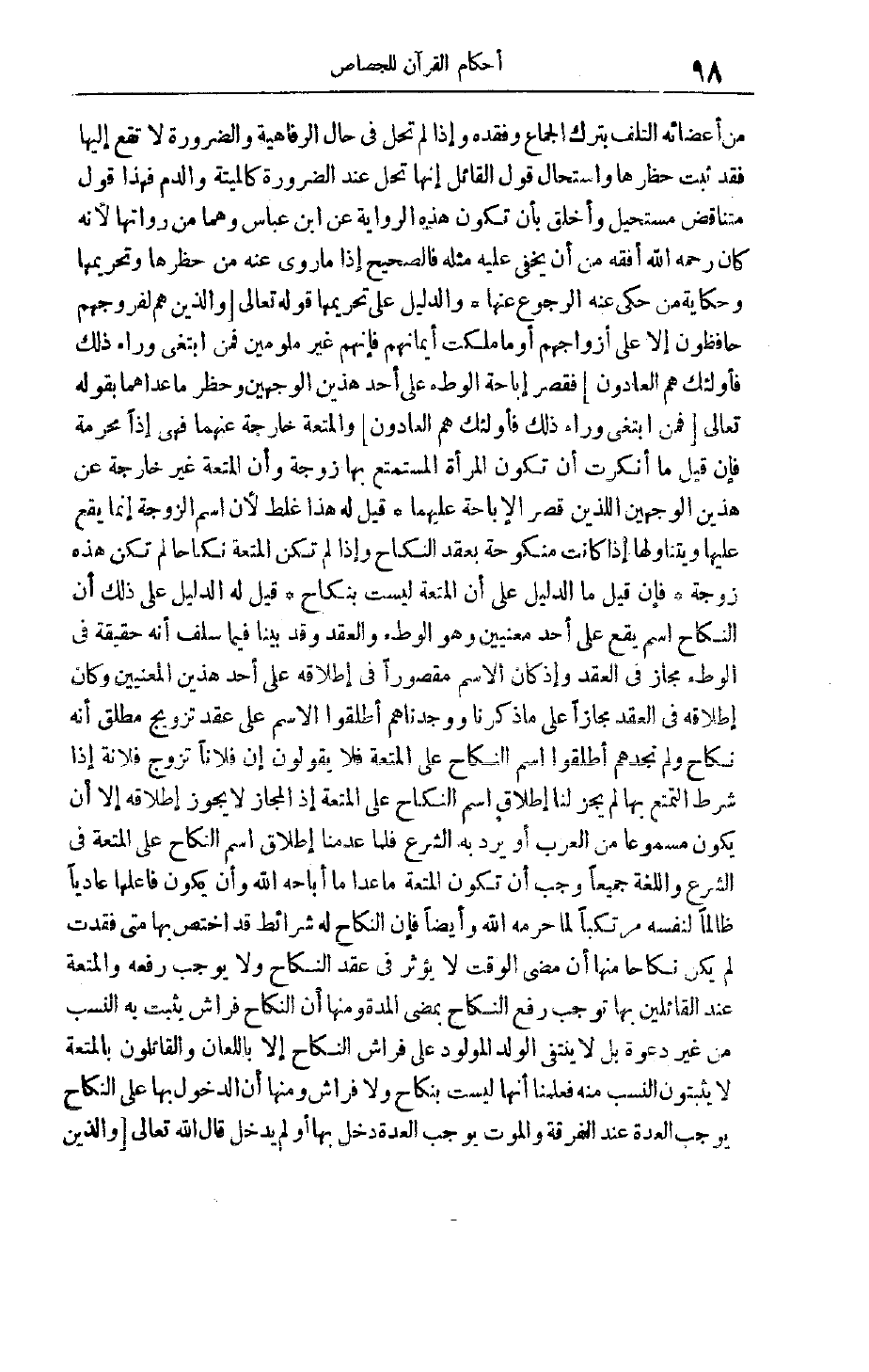 مِنْ أَعْضَائِهِ التَّلَفَ بِتَرْكِ الْجِمَاعِ وَفَقْدِهِ وَإِذَا لَمْ تَحِلَّ فِي حَالِ الرَّفَاهِيَةِ وَالضَّرُورَةِ لَا تَقَعُ إلَيْهَا فَقَدْ ثَبَتَ حَظْرُهَا وَاسْتَحَالَ قَوْلُ الْقَائِلِ إنَّهَا تَحِلُّ عِنْدَ الضَّرُورَةِ كَالْمَيْتَةِ وَالدَّمِ فَهَذَا قَوْلٌ مُتَنَاقِضٌ مُسْتَحِيلٌ وَأَخْلِقْ بِأَنْ تَكُونَ هَذِهِ الرِّوَايَةُ عَنْ ابْنِ عَبَّاسٍ وَهْمًا مِنْ رُوَاتِهَا لِأَنَّهُ كَانَ رَحِمَهُ اللَّهُ أَفْقَهَ مِنْ أَنْ يَخْفَى عَلَيْهِ مِثْلُهُ فَالصَّحِيحُ إذَا مَا رُوِيَ عَنْهُ مِنْ حَظْرِهَا وَتَحْرِيمِهَا وَحِكَايَةُ مَنْ حَكَى عَنْهُ الرُّجُوعَ عَنْهَا وَالدَّلِيلُ عَلَى تَحْرِيمِهَا قوله تعالى وَالَّذِينَ هُمْ لِفُرُوجِهِمْ حافِظُونَ إِلَّا عَلى أَزْواجِهِمْ أَوْ مَا مَلَكَتْ أَيْمانُهُمْ فَإِنَّهُمْ غَيْرُ مَلُومِينَ فَمَنِ ابْتَغى وَراءَ ذلِكَ فَأُولئِكَ هُمُ العادُونَ فَقَصَرَ إبَاحَةَ الْوَطْءِ عَلَى أَحَدِ هَذَيْنِ الْوَجْهَيْنِ وَحَظَرَ مَا عَدَاهُمَا بِقَوْلِهِ تَعَالَى فَمَنِ ابْتَغى وَراءَ ذلِكَ فَأُولئِكَ هُمُ العادُونَ وَالْمُتْعَةُ خَارِجَةٌ عَنْهُمَا فَهِيَ إذًا مُحَرَّمَةٌ فَإِنْ قِيلَ مَا أَنْكَرْت أَنْ تَكُونَ الْمَرْأَةُ الْمُسْتَمْتَعُ بِهَا زَوْجَةً وَأَنَّ الْمُتْعَةَ غَيْرُ خَارِجَةٍ عَنْ هَذَيْنِ الْوَجْهَيْنِ اللَّذَيْنِ قُصِرَ الْإِبَاحَةُ عَلَيْهِمَا قِيلَ لَهُ هَذَا غَلَطٌ لِأَنَّ اسْمَ الزَّوْجَةِ إنَّمَا يَقَعُ عَلَيْهَا وَيَتَنَاوَلُهَا إذَا كَانَتْ مَنْكُوحَةً بِعَقْدِ النكاح وَإِذَا لَمْ تَكُنْ الْمُتْعَةُ نِكَاحًا لَمْ تَكُنْ هَذِهِ زَوْجَةً فَإِنْ قِيلَ مَا الدَّلِيلُ عَلَى أَنَّ الْمُتْعَةَ لَيْسَتْ بِنِكَاحٍ قِيلَ لَهُ الدَّلِيلُ عَلَى ذَلِكَ أَنَّ النِّكَاحَ اسْمٌ يَقَعُ عَلَى أَحَدِ مَعْنَيَيْنِ وَهُوَ الْوَطْءُ وَالْعَقْدُ وَقَدْ بَيَّنَّا فِيمَا سَلَفَ أَنَّهُ حَقِيقَةٌ فِي الْوَطْءِ مَجَازٌ في العقد وإذ كَانَ الِاسْمُ مَقْصُورًا فِي إطْلَاقِهِ عَلَى أَحَدِ هَذَيْنِ الْمَعْنَيَيْنِ وَكَانَ إطْلَاقُهُ فِي الْعَقْدِ مَجَازًا عَلَى مَا ذَكَرْنَا وَوَجَدْنَاهُمْ أَطْلَقُوا الِاسْمَ عَلَى عَقْدِ تَزْوِيجٍ مُطْلَقٍ أَنَّهُ نِكَاحٌ وَلَمْ نَجِدِهِمْ أَطْلَقُوا اسْمَ النِّكَاحِ عَلَى الْمُتْعَةِ فَلَا يَقُولُونَ إن فلانا تزويج فُلَانَةَ إذَا شَرَطَ التَّمَتُّعَ بِهَا لَمْ يَجُزْ لَنَا إطْلَاقُ اسْمِ النِّكَاحِ عَلَى الْمُتْعَةِ إذْ الْمَجَازُ لَا يَجُوزُ إطْلَاقُهُ إلَّا أَنْ يَكُونَ مَسْمُوعًا مِنْ الْعَرَبِ أَوْ يَرِدُ بِهِ الشَّرْعُ فَلَمَّا
