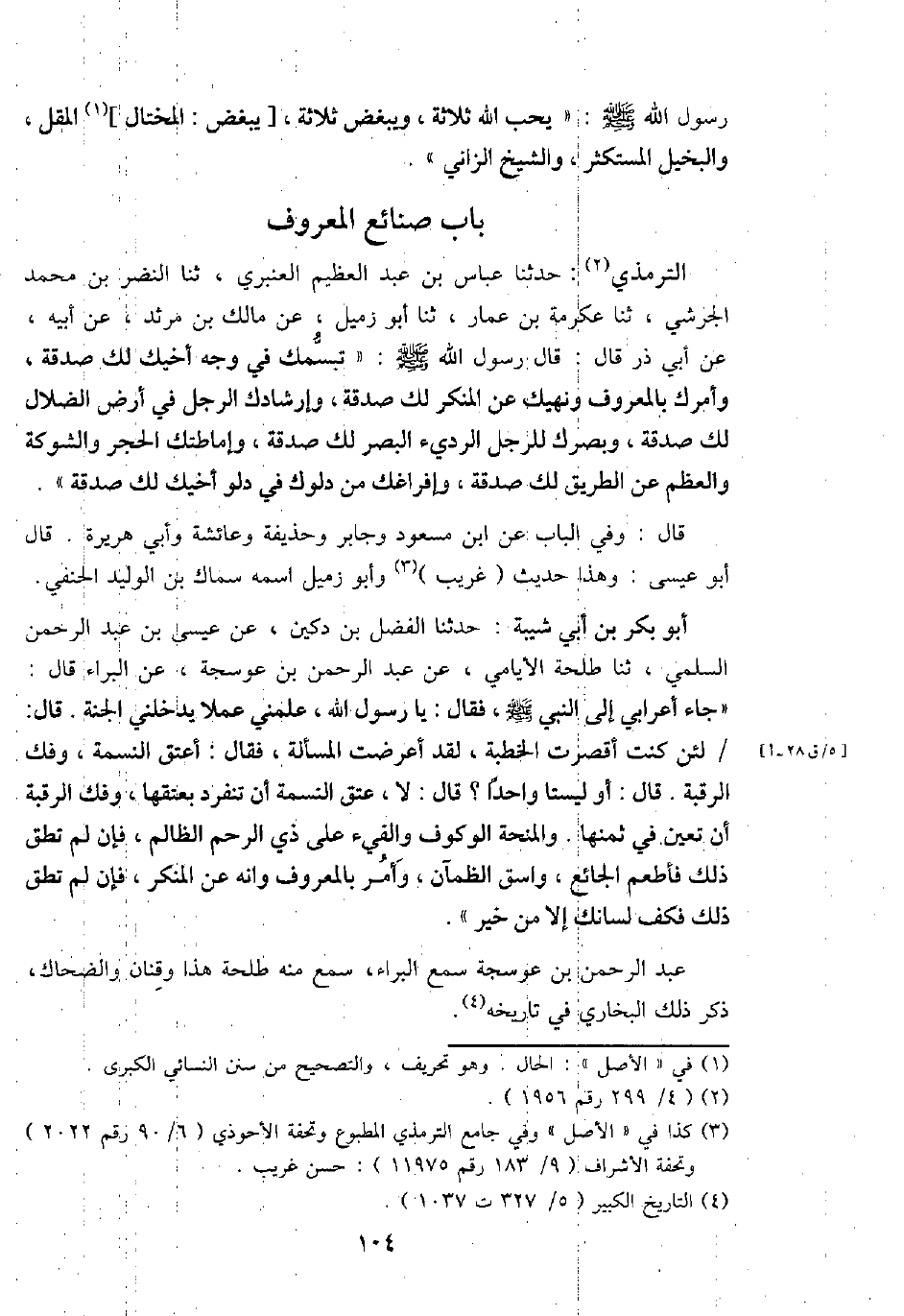 التِّرْمِذِيّ: حَدثنَا عَبَّاس بن عبد الْعَظِيم الْعَنْبَري، ثَنَا النَّضر بن مُحَمَّد الجرشِي، ثَنَا عِكْرِمَة بن عمار، ثَنَا أَبُو زميل، عَن مَالك بن مرْثَد، عَن أَبِيه، عَن أبي ذَر قَالَ: قَالَ رَسُول الله - صَلَّى اللَّهُ عَلَيْهِ وَسَلَّم َ -: " تبسمك فِي وَجه أَخِيك لَك صَدَقَة، وأمرك بِالْمَعْرُوفِ ونهيك عَن الْمُنكر لَك صَدَقَة، وإرشادك الرجل فِي أَرض الضلال لَك صَدَقَة، وبصرك للرجل الرَّدِيء الْبَصَر لَك صَدَقَة، وإماطتك الْحجر والشوكة والعظم عَن الطَّرِيق لَك صَدَقَة، وإفراغك من دلوك فِي دلو أَخِيك لَك صَدَقَة ".