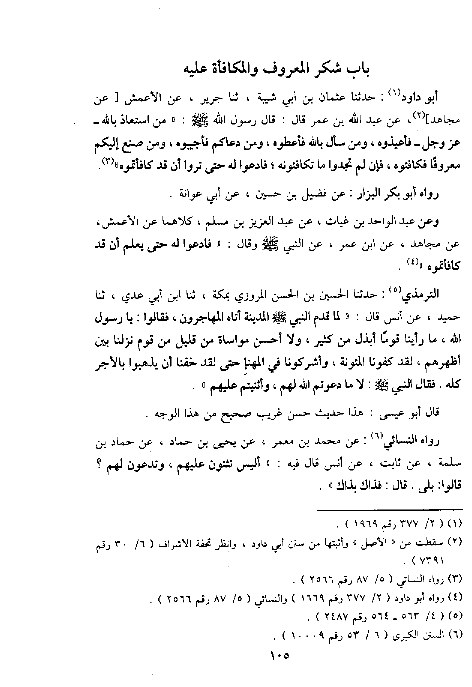 أَبُو دَاوُد: حَدثنَا عُثْمَان بن أبي شيبَة، ثَنَا جرير، عَن الْأَعْمَش [عَن مُجَاهِد] ، عَن عبد الله بن عمر قَالَ: قَالَ رَسُول الله - صَلَّى اللَّهُ عَلَيْهِ وَسَلَّم َ -: " من استعاذ بِاللَّه - عز وَجل - فأعيذوه، وَمن سَأَلَ بِاللَّه فَأَعْطوهُ، وَمن دعَاكُمْ فأجيبوه، وَمن صنع إِلَيْكُم مَعْرُوفا فكافئوه، فَإِن لم تَجدوا مَا تكافئونه؛ فَادعوا لَهُ حَتَّى تروا أَن قد كافأتموه ".