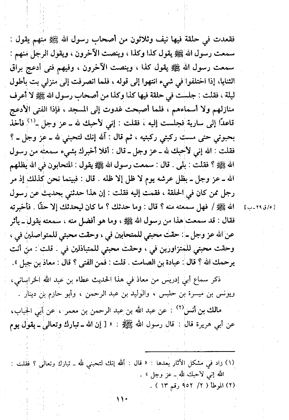 فَقَعَدت فِي حَلقَة فِيهَا نَيف وَثَلَاثُونَ من أَصْحَاب رَسُول الله - صَلَّى اللَّهُ عَلَيْهِ وَسَلَّم َ - مِنْهُم يَقُول: سَمِعت رَسُول الله - صَلَّى اللَّهُ عَلَيْهِ وَسَلَّم َ - يَقُول كَذَا وَكَذَا، وينصت الْآخرُونَ، وَيَقُول الرجل مِنْهُم: سَمِعت رَسُول الله - صَلَّى اللَّهُ عَلَيْهِ وَسَلَّم َ - يَقُول كَذَا، وينصت الْآخرُونَ، وَفِيهِمْ فَتى أدعج براق الثنايا، إِذا اخْتلفُوا فِي شَيْء انْتَهوا إِلَى قَوْله، فَلَمَّا انصرفت إِلَى منزلي بت بأطول لَيْلَة، فَقلت: جَلَست فِي حَلقَة فِيهَا كَذَا وَكَذَا من أَصْحَاب رَسُول الله - صَلَّى اللَّهُ عَلَيْهِ وَسَلَّم َ - لَا أعرف مَنَازِلهمْ وَلَا أَسْمَاءَهُم، فَلَمَّا أَصبَحت غَدَوْت إِلَى الْمَسْجِد، فَإِذا الْفَتى الأدعج قَاعِدا إِلَى سَارِيَة فَجَلَست إِلَيْهِ، فَقلت: إِنِّي لَأحبك لله - عز وَجل - فَأخذ بحبوتي حَتَّى مست ركبتي رُكْبَتَيْهِ، ثمَّ قَالَ: آللَّهُ إِنَّك لتحبني لله - عز وَجل -؟ فَقلت: الله إِنِّي لَأحبك لله - عز وَجل - قَالَ: أَفلا أخْبرك بِشَيْء سمعته من رَسُول الله - صَلَّى اللَّهُ عَلَيْهِ وَسَلَّم َ -؟ فَقلت: بلَى، قَالَ: سَمِعت رَسُول الله - صَلَّى اللَّهُ عَلَيْهِ وَسَلَّم َ - يَقُول: المتحابون فِي الله يظلهم الله - عز وَجل - بِظِل عَرْشه يَوْم لَا ظلّ إِلَّا ظله. قَالَ: فَبَيْنَمَا نَحن كَذَلِك إِذْ مر رجل مِمَّن كَانَ فِي الْحلقَة، فَقُمْت إِلَيْهِ فَقلت: إِن هَذَا حَدثنِي بِحَدِيث عَن رَسُول الله - صَلَّى اللَّهُ عَلَيْهِ وَسَلَّم َ - فَهَل سمعته مِنْهُ؟ قَالَ: وَمَا حَدثَك؟ مَا كَانَ ليحدثك إِلَّا حَقًا. فَأَخْبَرته فَقَالَ: قد سَمِعت هَذَا من رَسُول الله - صَلَّى اللَّهُ عَلَيْهِ وَسَلَّم َ -، وَمَا هُوَ أفضل مِنْهُ، سمعته يَقُول - يأثر عَن الله عز وَجل -: حقت محبتي للمتحابين فِي، وحقت محبتي للمتواصلين فِي، وحقت محبتي للمتزاورين فِي، وحقت محبتي للمتباذلين فِي. قلت: من أَنْت يَرْحَمك الله؟ قَالَ: عبَادَة بن الصَّامِت. قلت: فَمن الْفَتى؟ قَالَ: معَاذ بن جبل ".