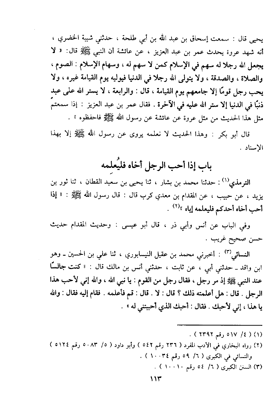 التِّرْمِذِيّ: حَدثنَا مُحَمَّد بن بشار، ثَنَا يحيى بن سعيد الْقطَّان، ثَنَا ثَوْر بن يزِيد، عَن حبيب، عَن الْمِقْدَام بن معدي كرب قَالَ: قَالَ رَسُول الله - صَلَّى اللَّهُ عَلَيْهِ وَسَلَّم َ -: " إِذا أحب أَخَاهُ أحدكُم فليعلمه إِيَّاه ".
