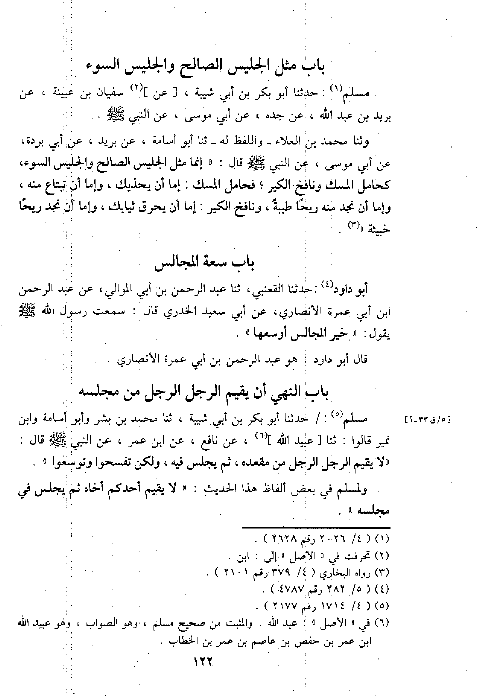 مُسلم: حَدثنَا أَبُو بكر بن أبي شيبَة، ثَنَا مُحَمَّد بن بشر وَأَبُو أُسَامَة وَابْن نمير قَالُوا: ثَنَا [عبيد الله] ، عَن نَافِع، عَن ابْن عمر، عَن النَّبِي - صَلَّى اللَّهُ عَلَيْهِ وَسَلَّم َ - قَالَ: " لَا يُقيم الرجل الرجل من مَقْعَده، ثمَّ يجلس فِيهِ، وَلَكِن تَفَسَّحُوا وتوسعوا ".