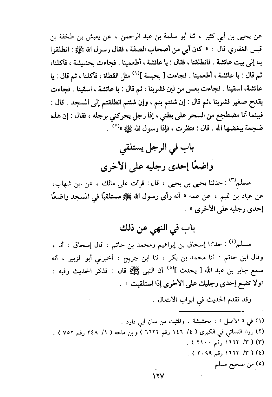 مُسلم: حَدثنَا يحيى بن يحيى، قَالَ: قَرَأت على مَالك، عَن ابْن شهَاب، عَن عباد بن تَمِيم، عَن عَمه " أَنه رأى رَسُول الله - صَلَّى اللَّهُ عَلَيْهِ وَسَلَّم َ - مُسْتَلْقِيا فِي الْمَسْجِد وَاضِعا إِحْدَى رجلَيْهِ على الْأُخْرَى ".